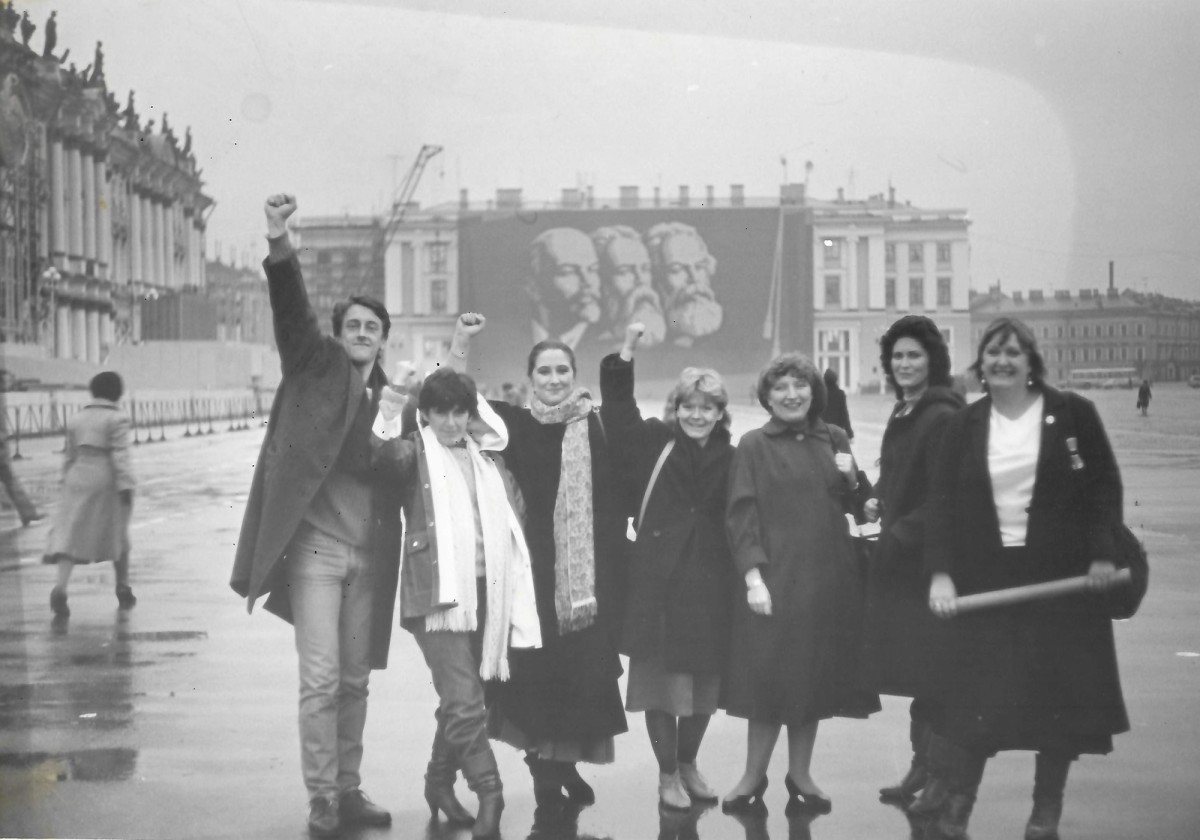 Lay Up Your Ends, written by Martin Lynch and Charabanc Theatre Company, toured off and on for the next two years, including being invited to both the Dublin Theatre Festival and Mayfest (Glasgow). Pam Brighton, a member of the British/Soviet Friendship Society, came up with the inspired idea to try and get the company to the Soviet Union and roped in another member, John Russell, to help us organise it. I don’t remember much of the logistics, but huge credit goes to them, and to actor and Charabanc Company Director, Ian McElhinney, and Charabanc’s Administrator, Janet Mackle. It seemed that a chartered flight was going to be cheaper if we found friends and family who fancied nine days and nights in the USSR. The word went out. They included Louis Edmondson and Judith Elliot from the BBC, Jeanie Johnston, Kate Smith and Joanne Woods from UTV, Eugene Moloney (Irish News) sadly no longer with us, my mum and aunt and many more. In effect they were subsidising the company’s trip and without them, we probably couldn’t have gone.
