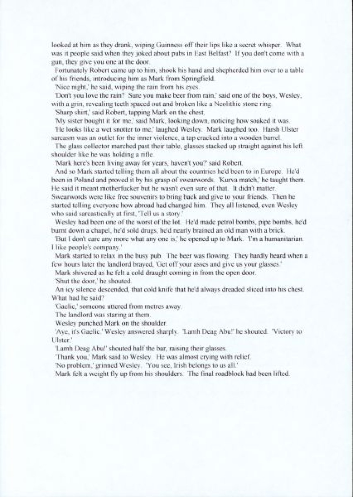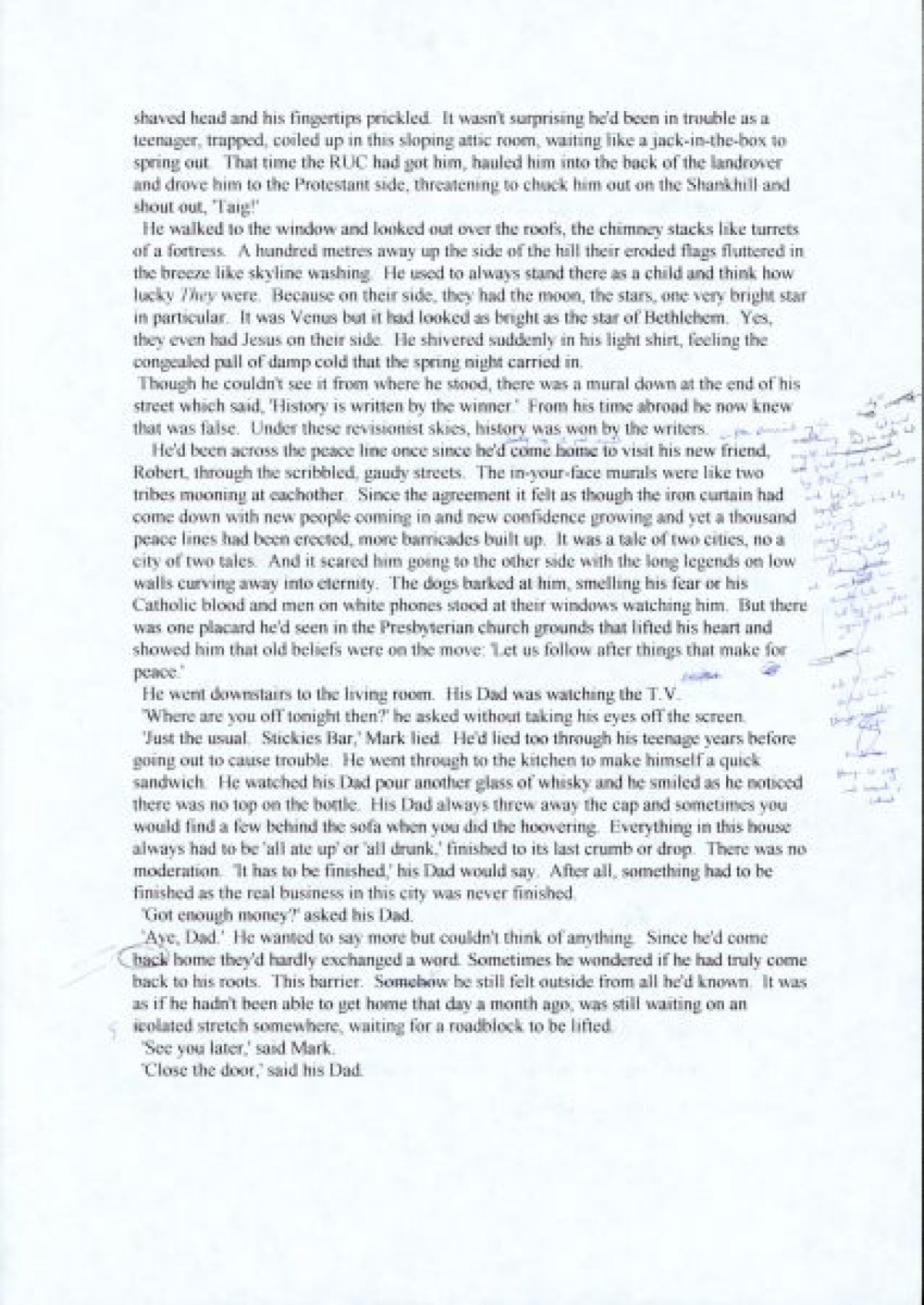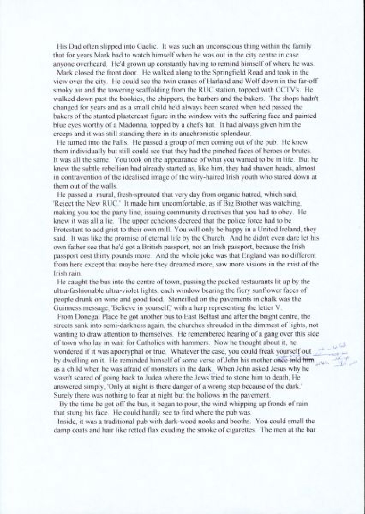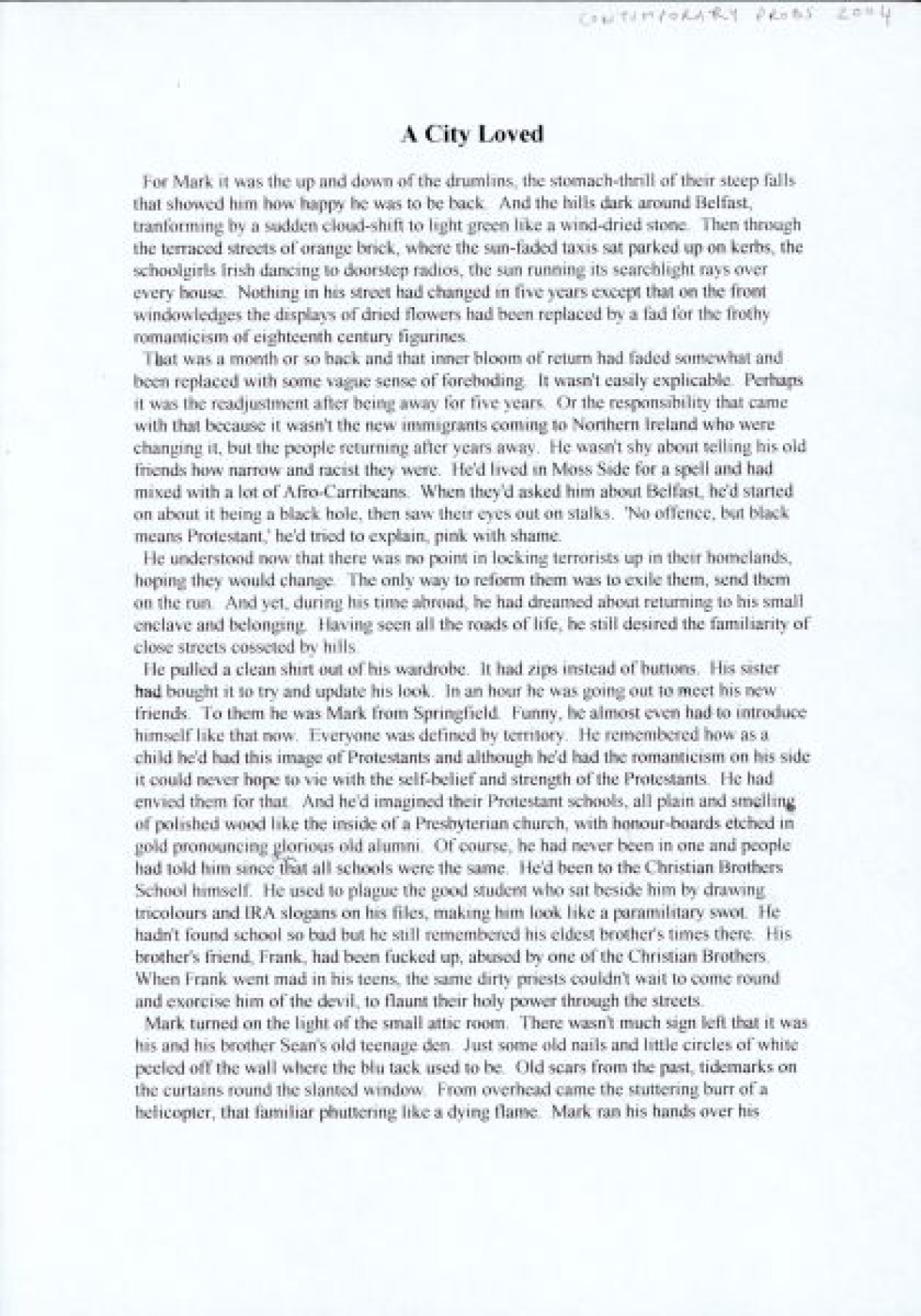 Printed document containing a short story by Rosemary Jenkinson, titled 'A City Loved', relating to themes of sectarianism, identity and belonging. Contains handwritten annotations by the author.