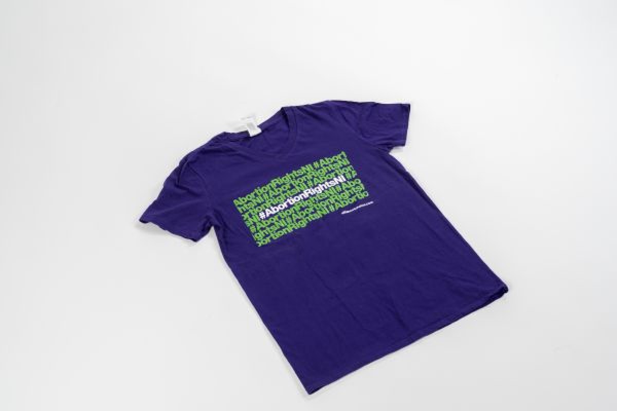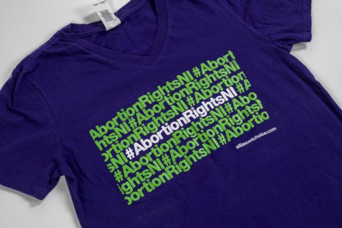 Purple t-shirt with green and white text '#AbortionRightsNI' repeated, produced by Alliance for Choice