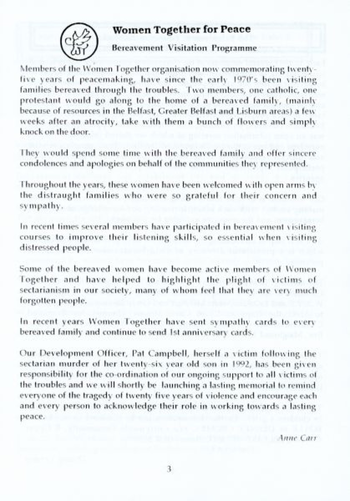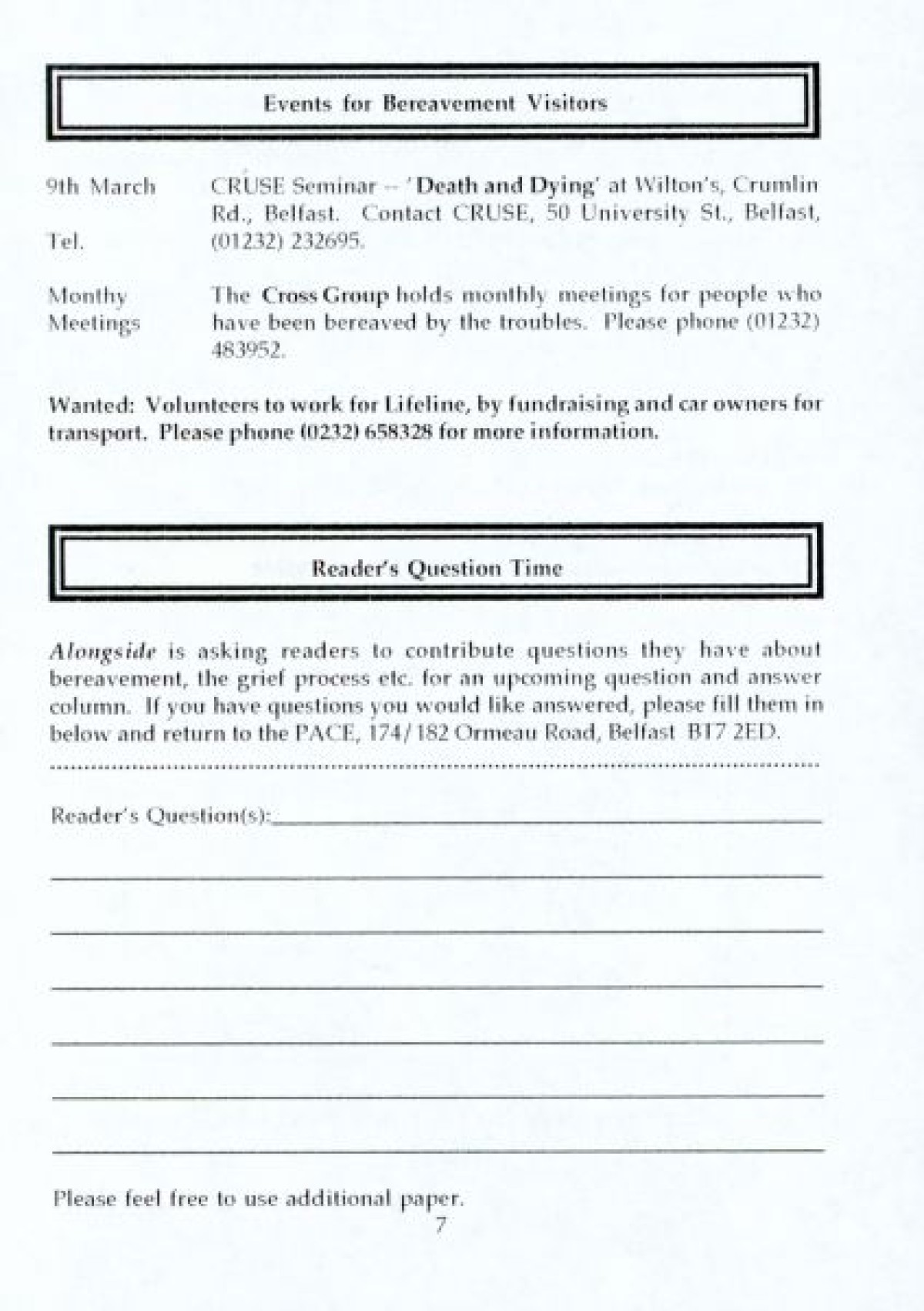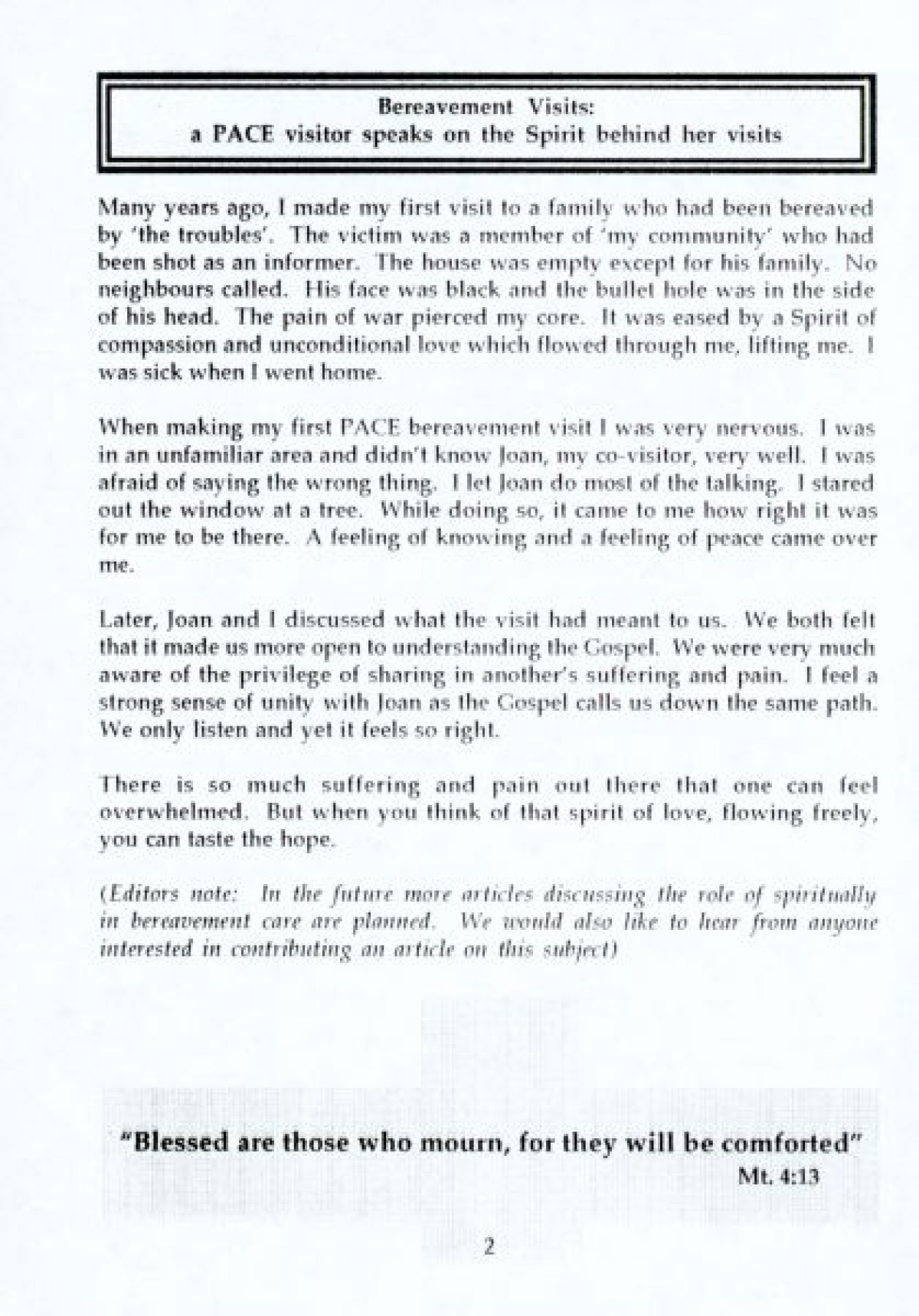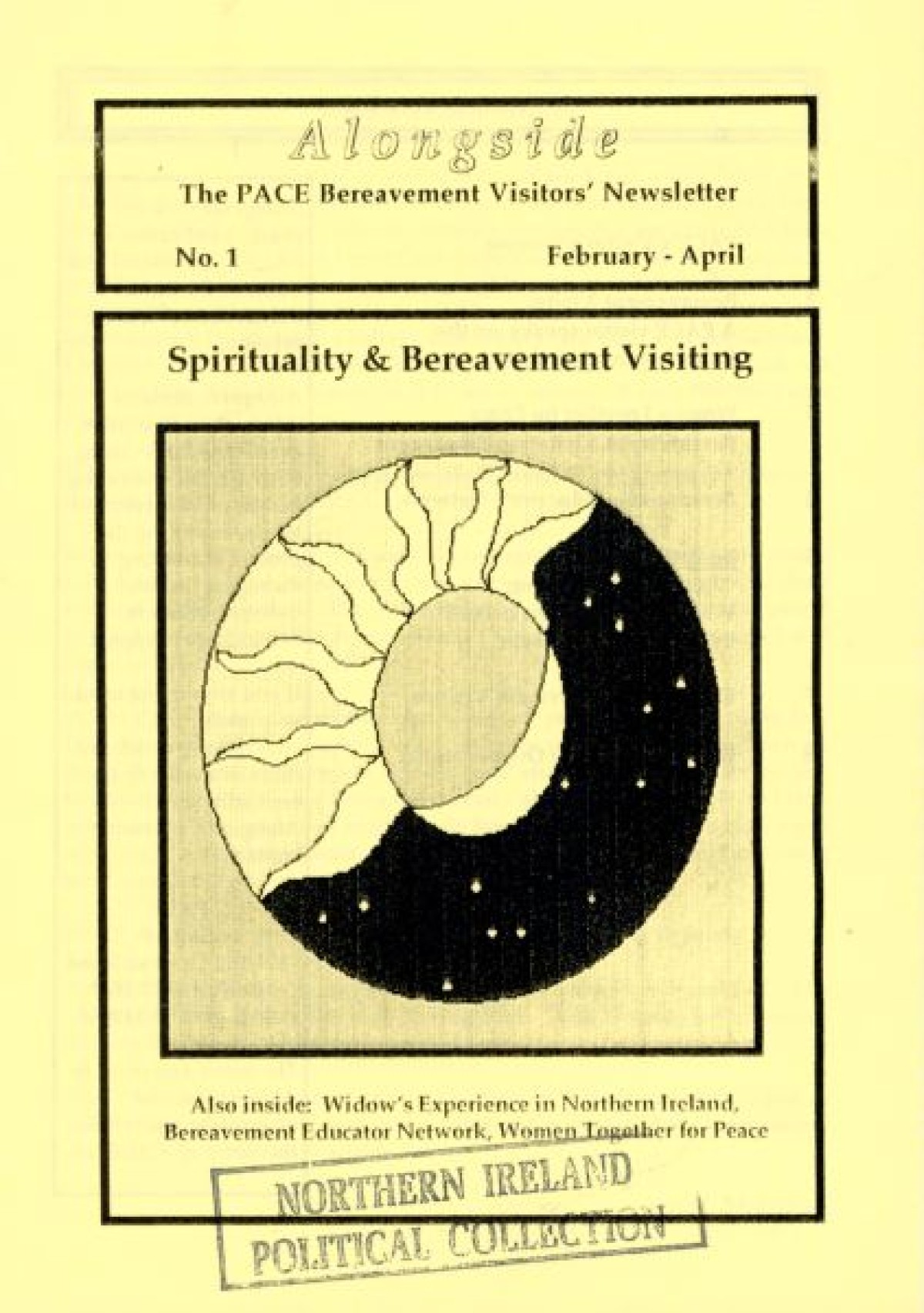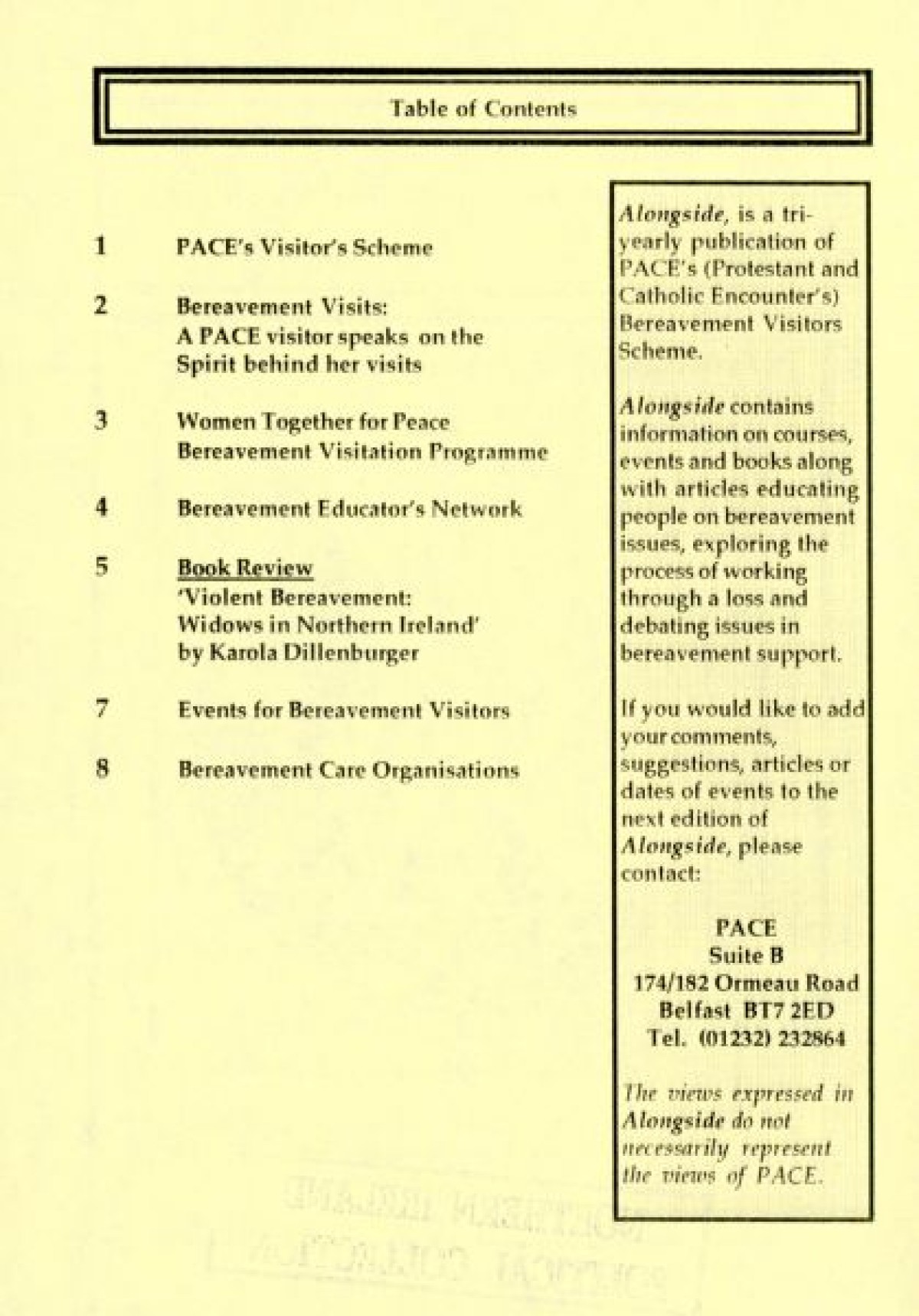 Alongside: the PACE Bereavement Visitors' Newsletter, issue 1, February-April. Published by Protestant and Catholic Encounter (PACE). Contents discuss the PACE Visitors' Scheme, Bereavement Visits: A PACE visitor speaks on the Spirit behind her visits; Women Together for Peace Bereavement Visitation Programme; Bereavement Educator's Network; Book Review "Violent Bereavement: Widows in Northern Ireland" by Karola Dillenburger; Events for Bereavement Visitors; Bereavement Care Organisations.