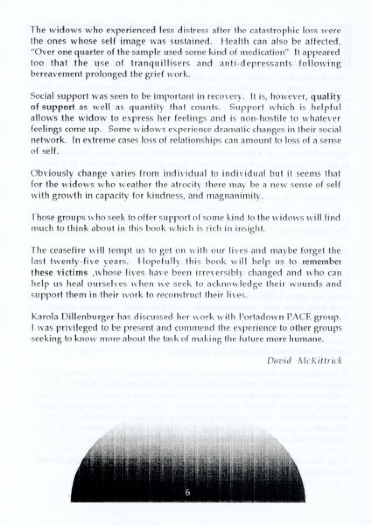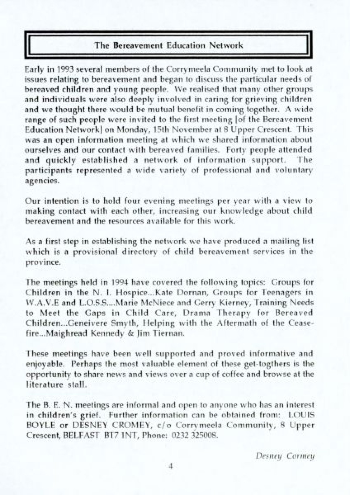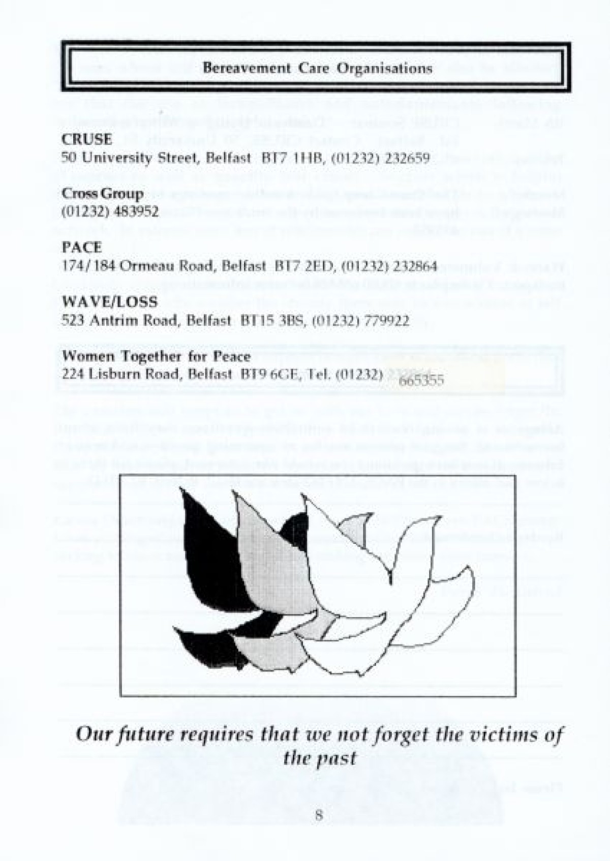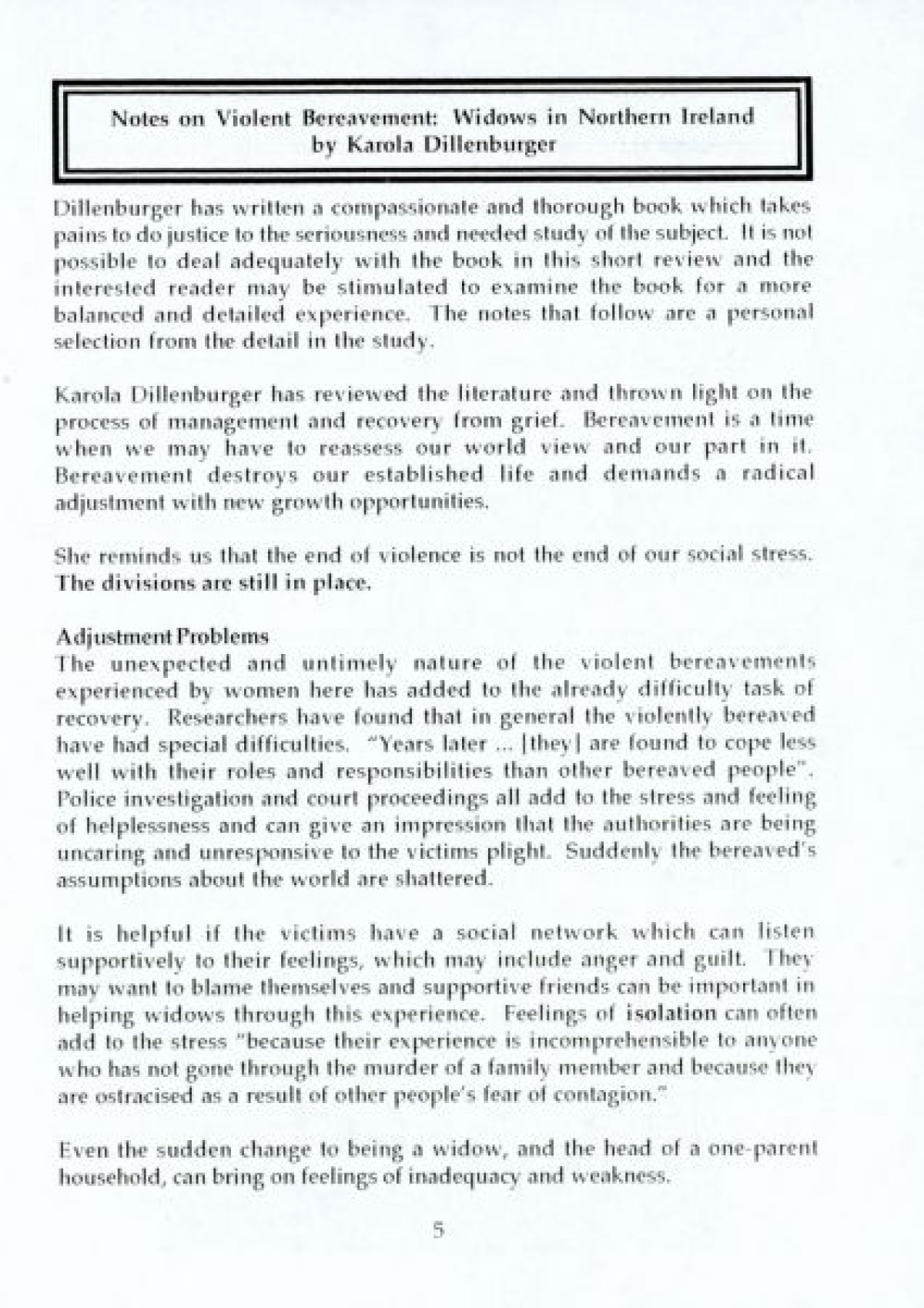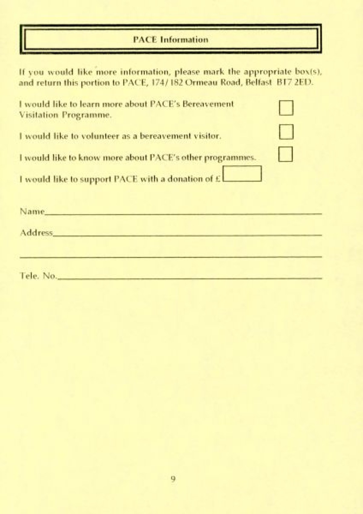 Alongside: the PACE Bereavement Visitors' Newsletter, issue 1, February-April. Published by Protestant and Catholic Encounter (PACE). Contents discuss the PACE Visitors' Scheme, Bereavement Visits: A PACE visitor speaks on the Spirit behind her visits; Women Together for Peace Bereavement Visitation Programme; Bereavement Educator's Network; Book Review "Violent Bereavement: Widows in Northern Ireland" by Karola Dillenburger; Events for Bereavement Visitors; Bereavement Care Organisations.