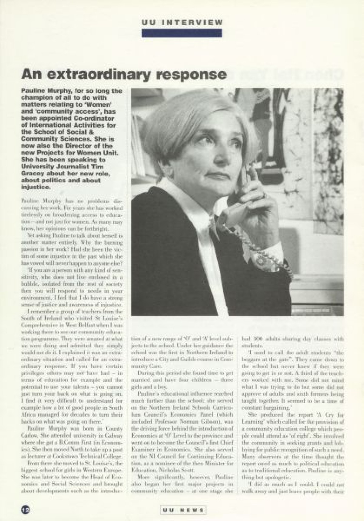 Article titled "An Extraordinary Response," featuring an interview with Professor Pauline Murphy, published in
