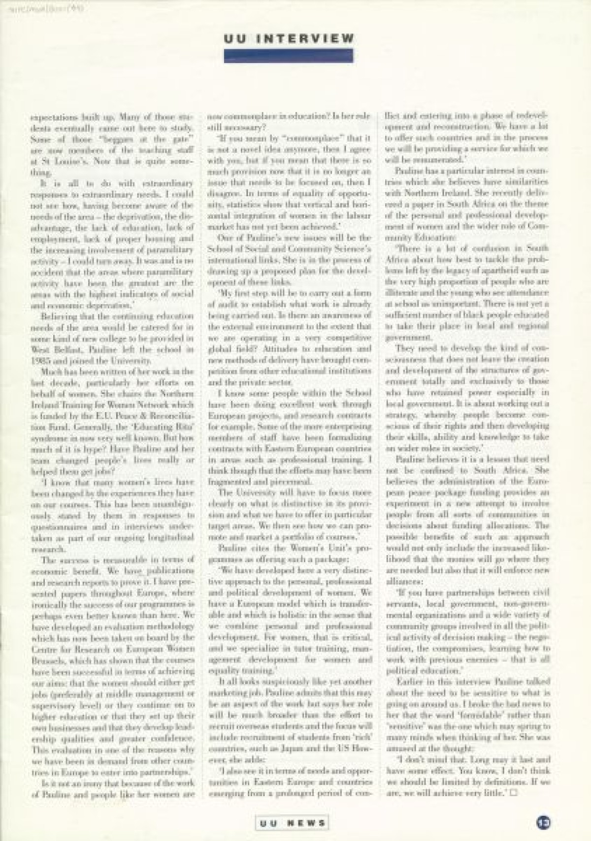 UU News, the staff bulletin of the University of Ulster, No 6, relating to women and community access to education, and a Projects for Women Unit at the University of Ulster.
