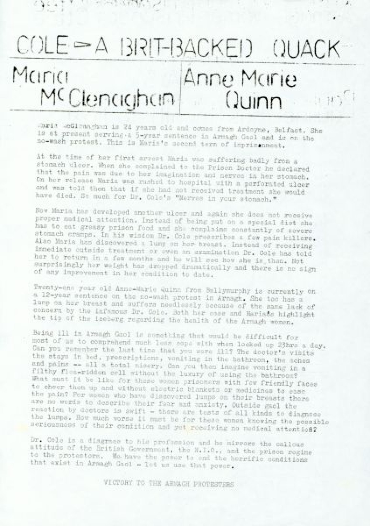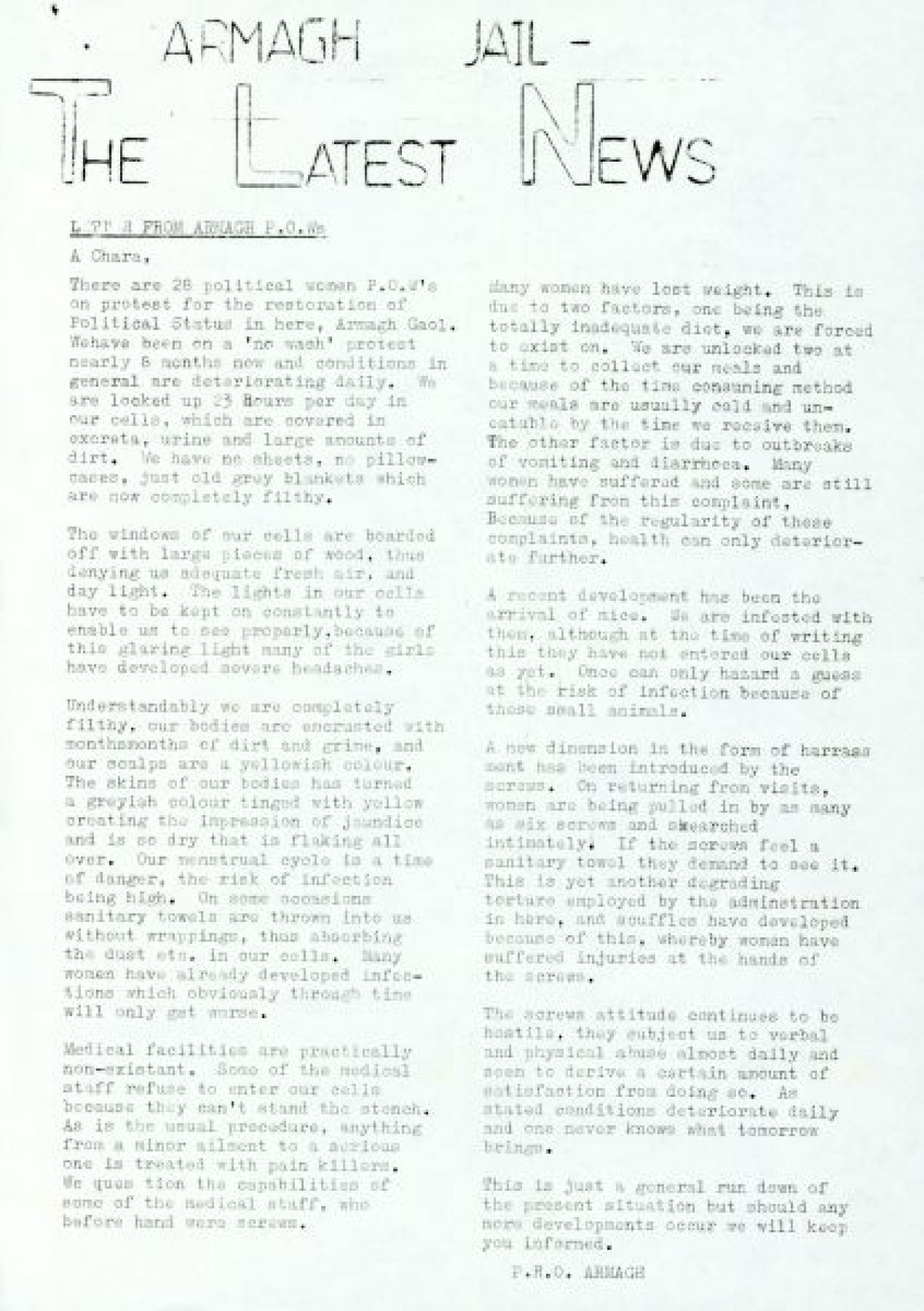 Typewritten bulletin, titled, "Armagh Women Prisoners' Committee." Contains articles describing the experiences and conditions of Pauline McLaughlin, Maria McClenaghan, and Anne Marie Quinn, while interned at Armagh Jail. Also contains a letter "from Armagh P.O.Ws" describing unsanitary conditions and harassment, and a list of prisoners on protest in Armagh Jail.