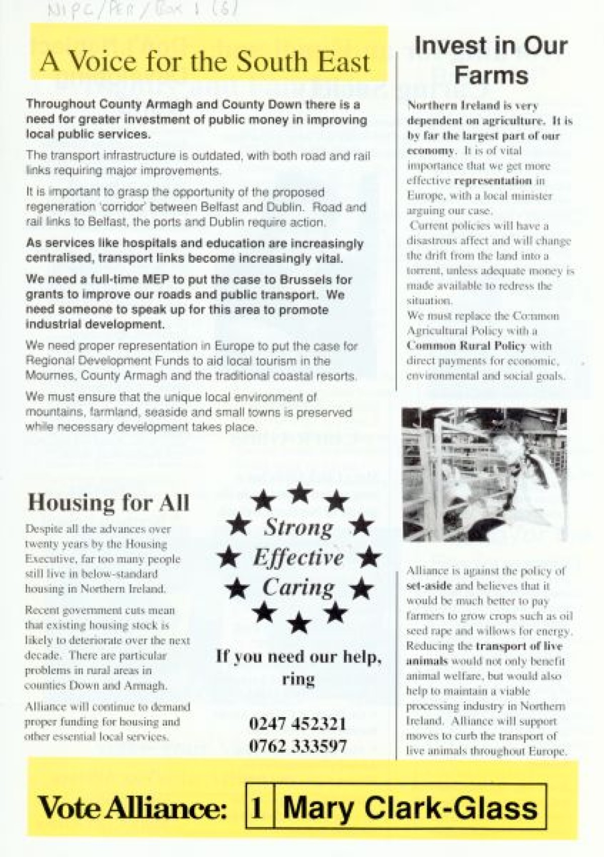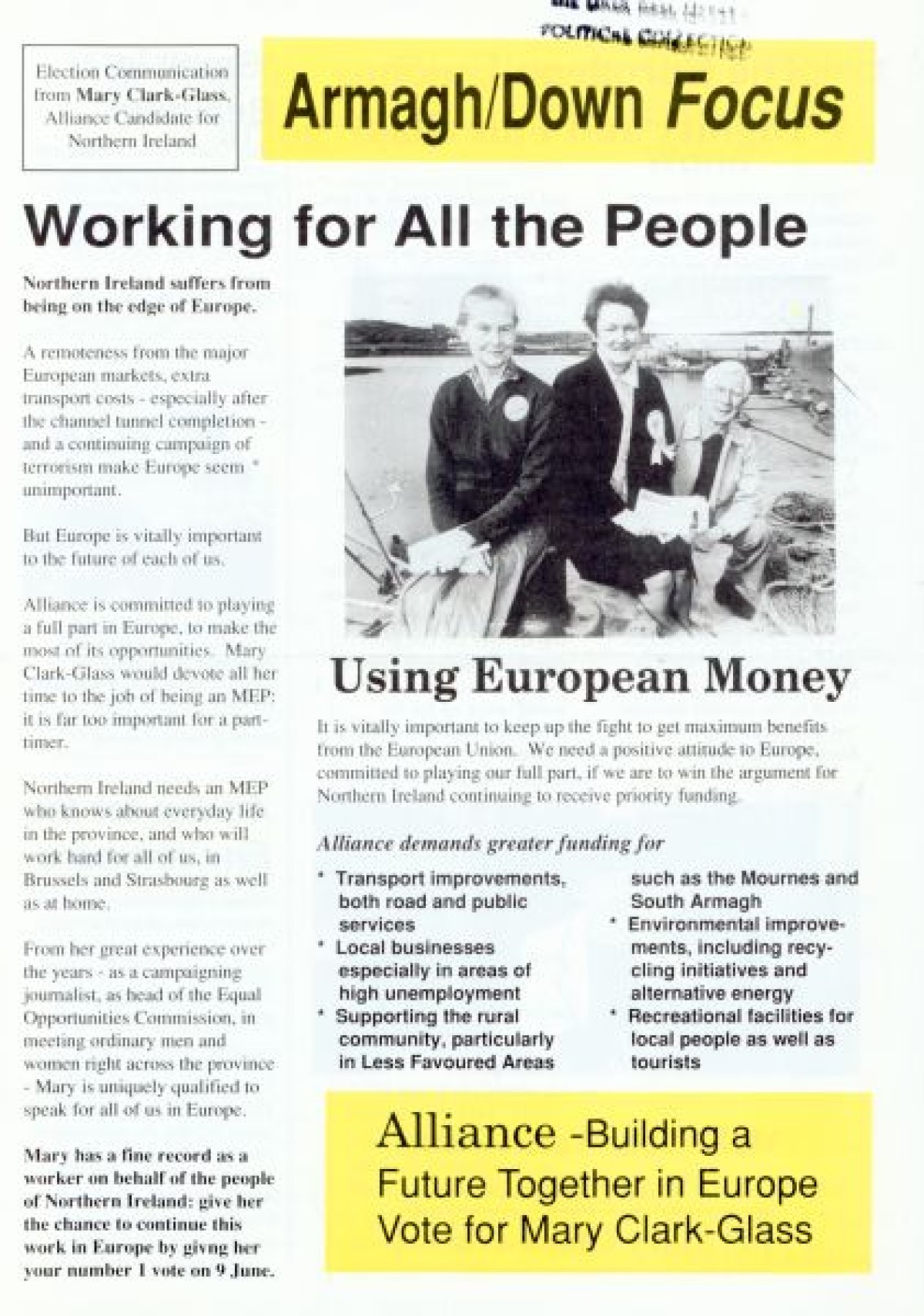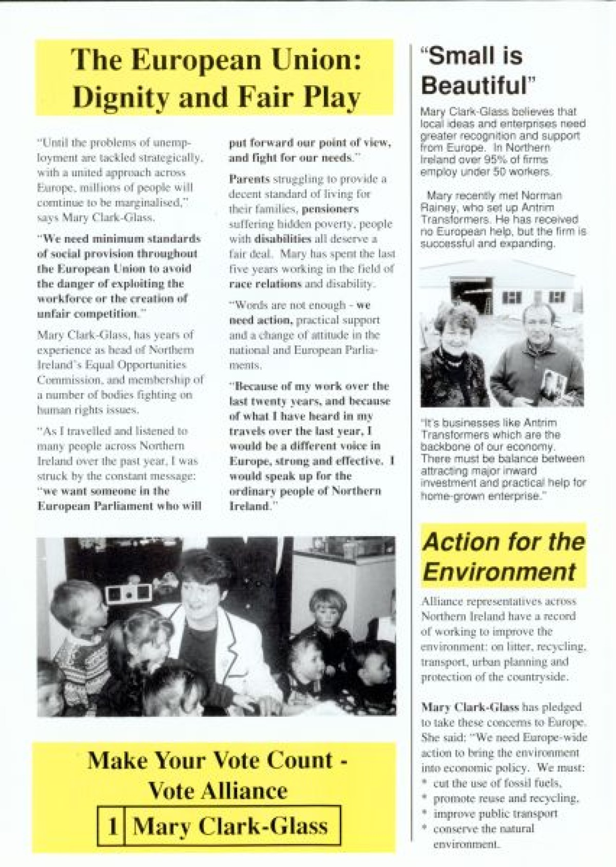 Alliance Party on behalf of MEP candidate for the European Parliament, Mary Clark-Glass. The publication outlines key priorities and policies if Mary Clark-Glass is elected, and the need for European Union funding for transport and environmental improvements, local businesses and support for rural communities.