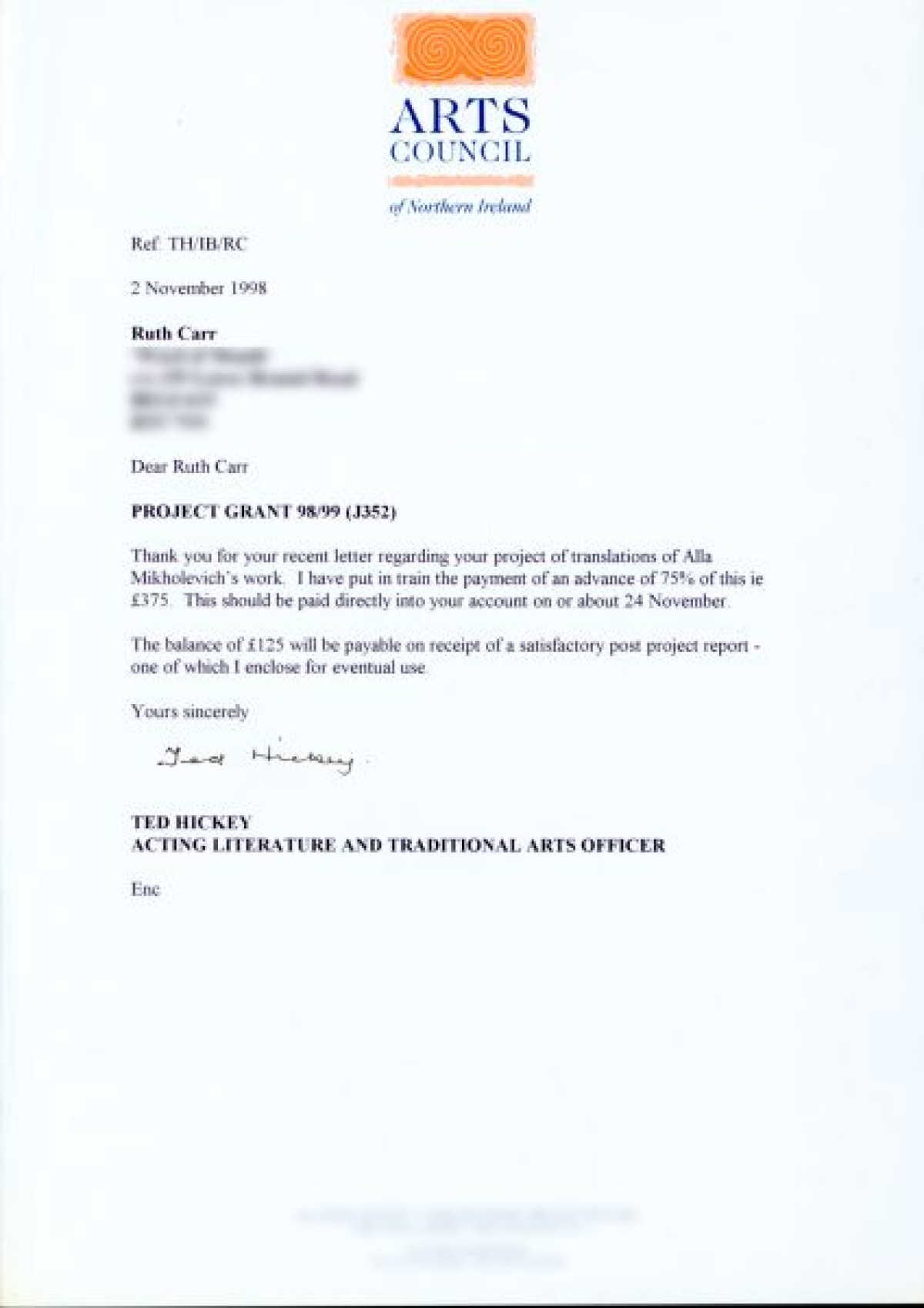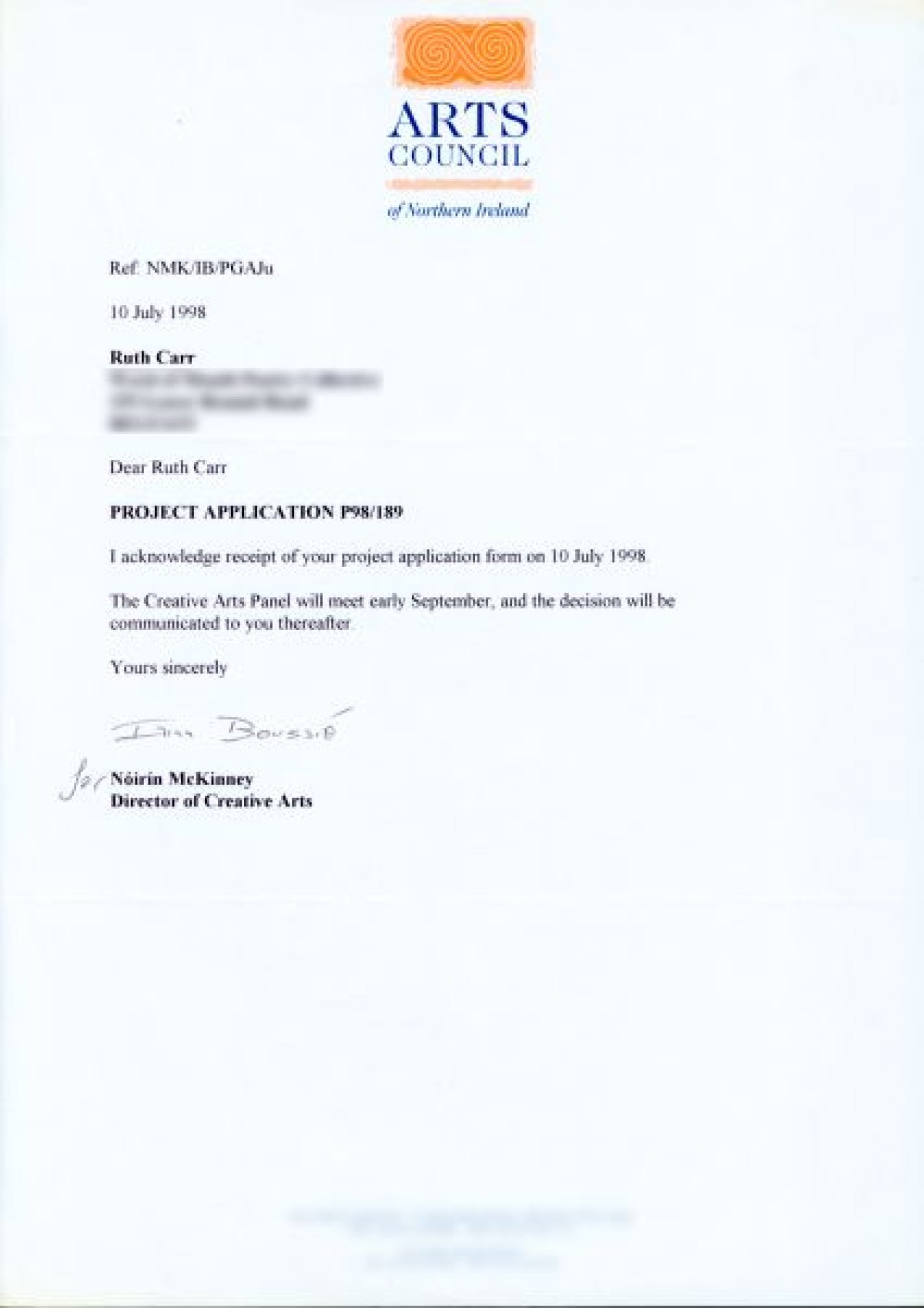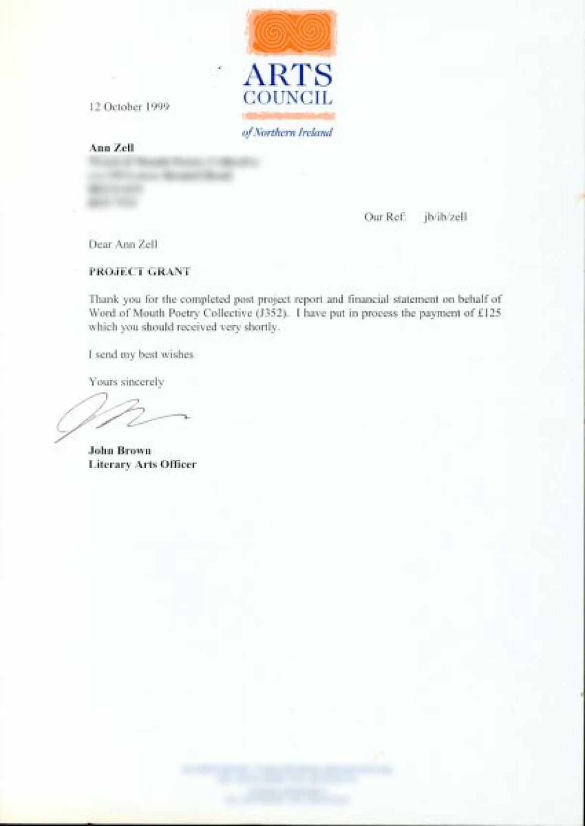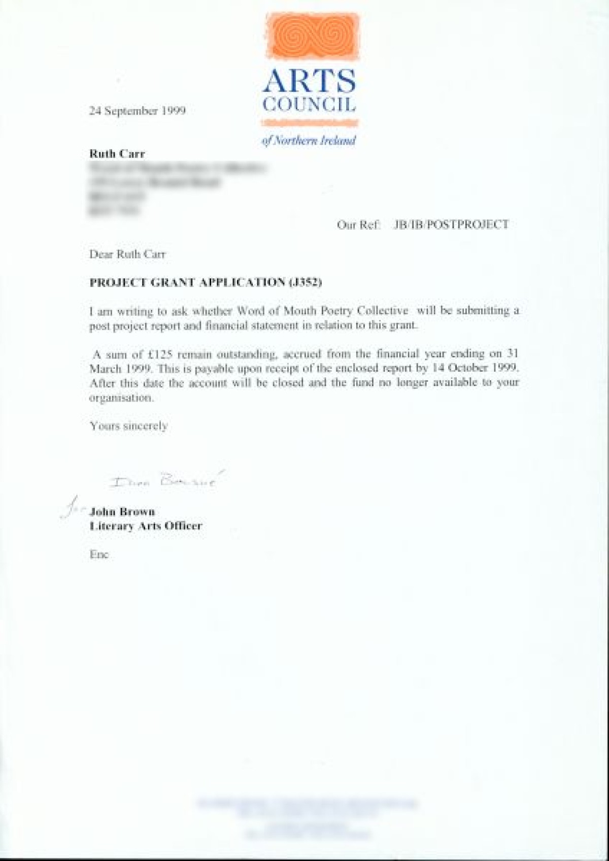 Arts Council Northern Ireland relating to grants and a post-project report for a