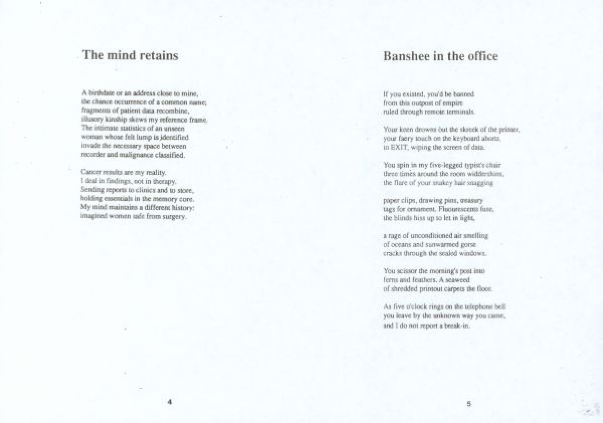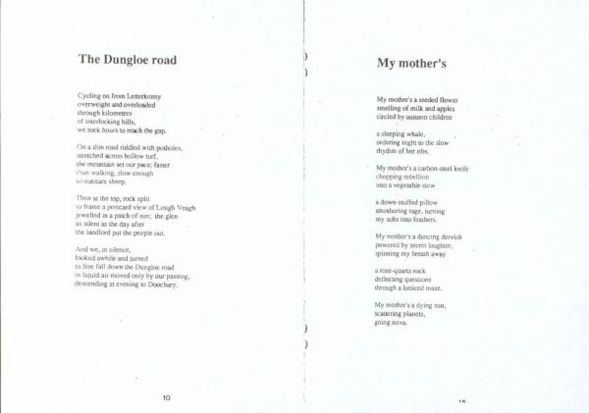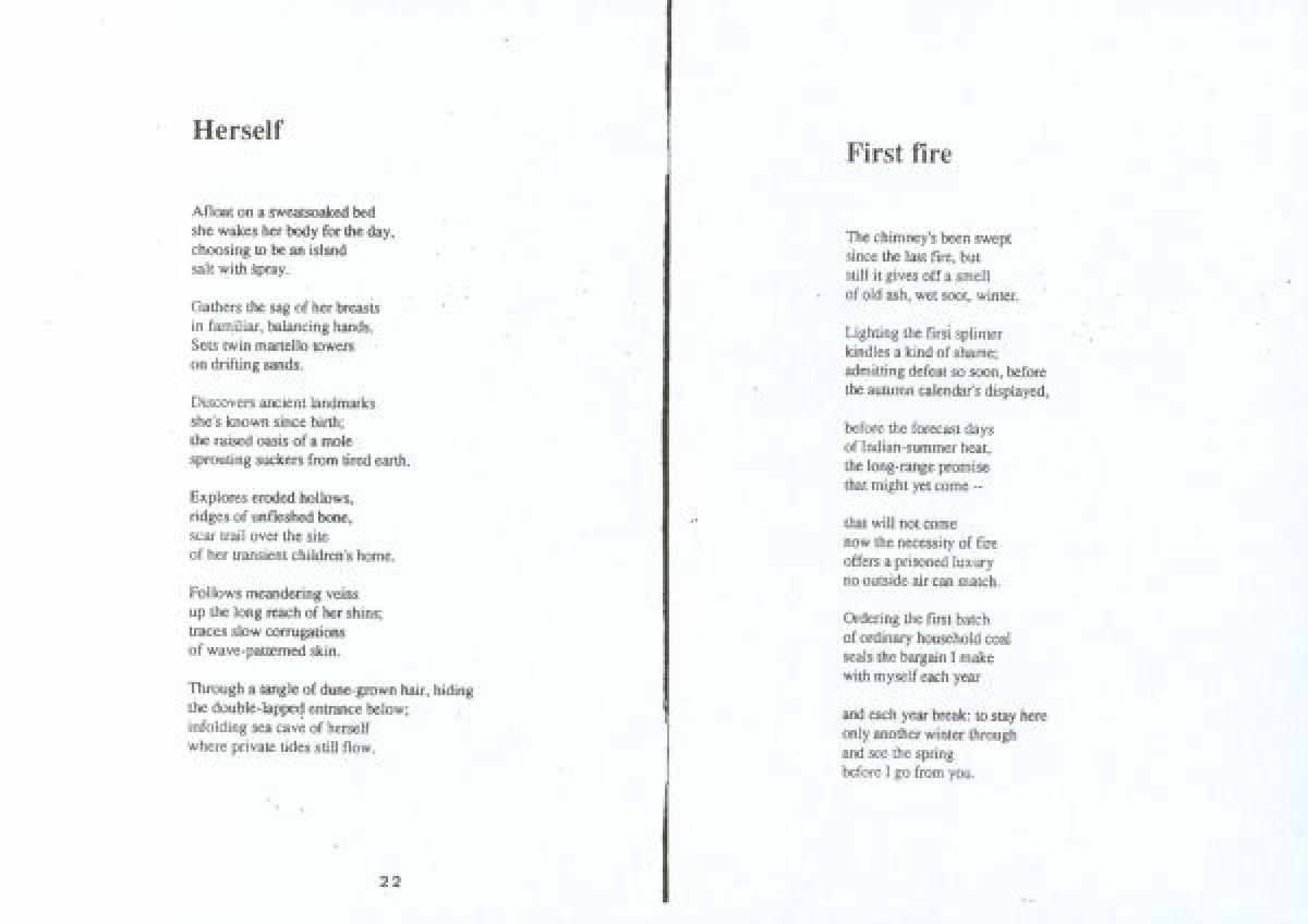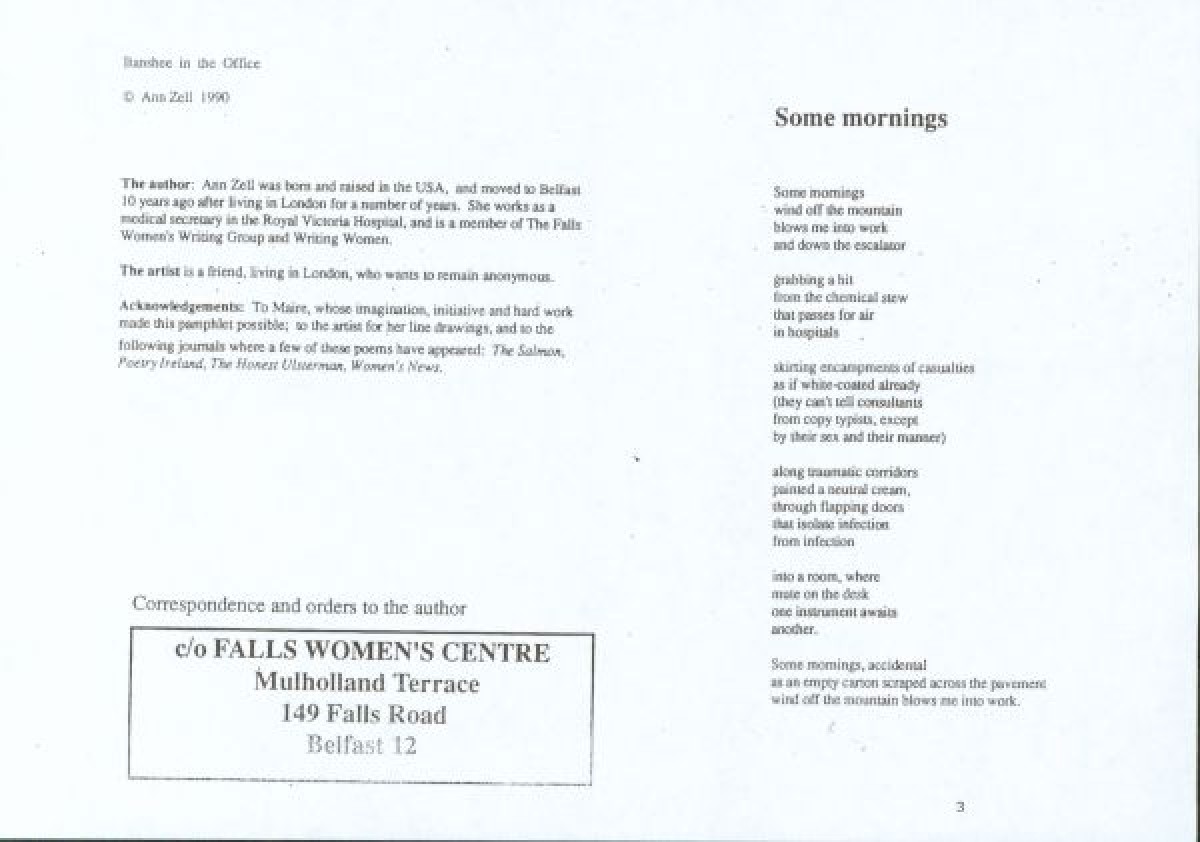 Falls Women's Centre. Includes a black and white illustrated cover by an anonymous friend in London. Contents include: Some mornings; The mind retains; Banshee in the office; Claiming; Requiem for a school; Resistance two-step; The Dungloe Road; My mother's; Sustenance; Stranger; Afterbirth; Daughter, grown; Invaders; Herself; First fire; and Changeling.