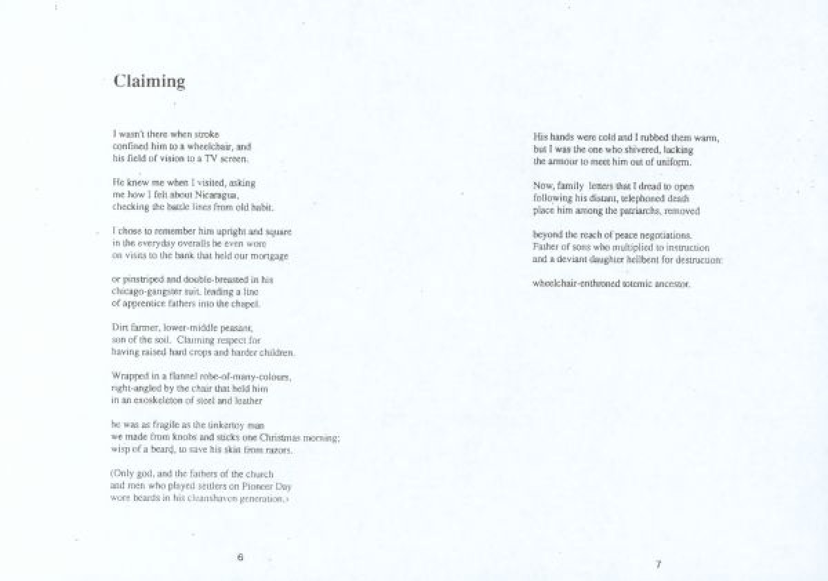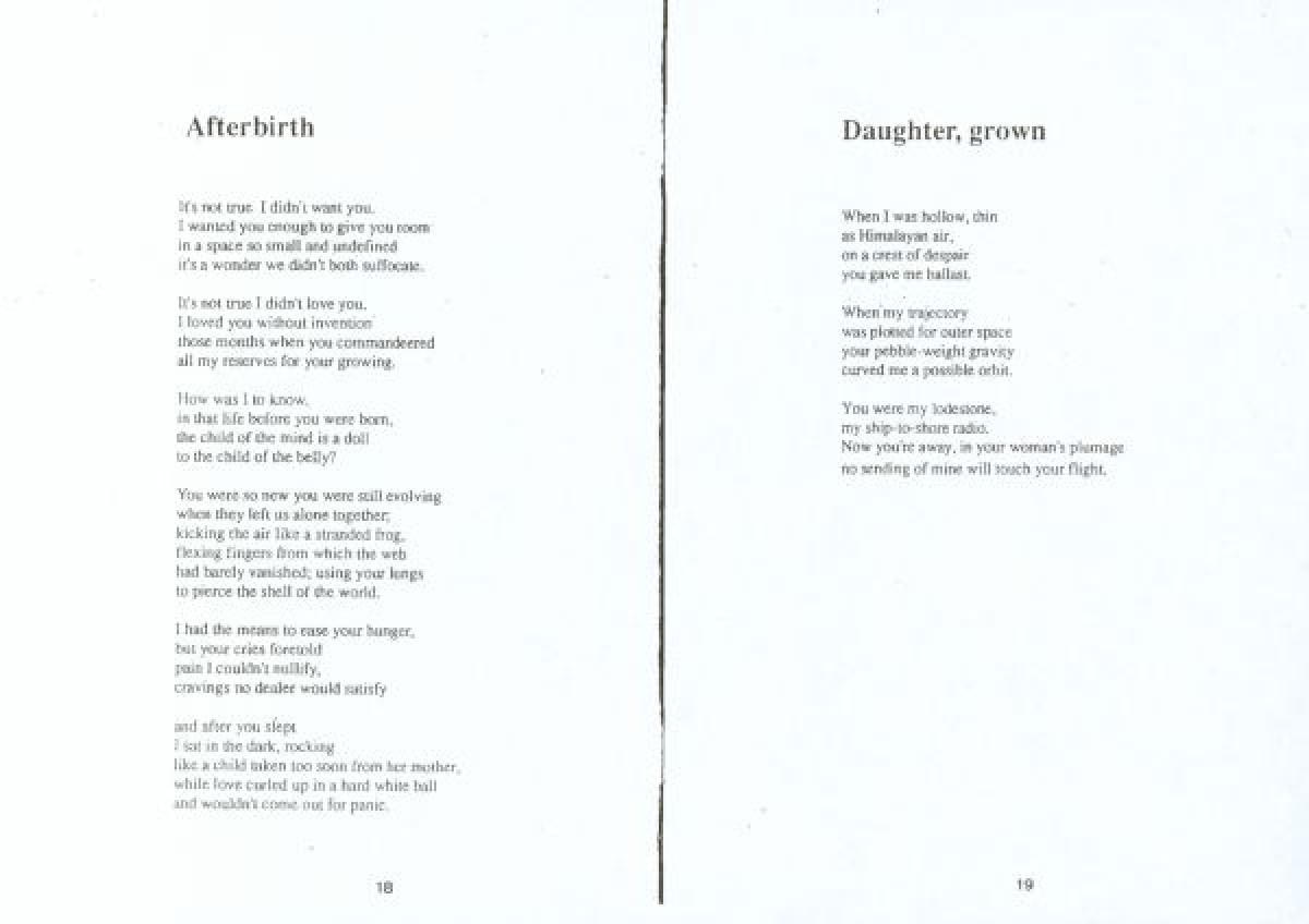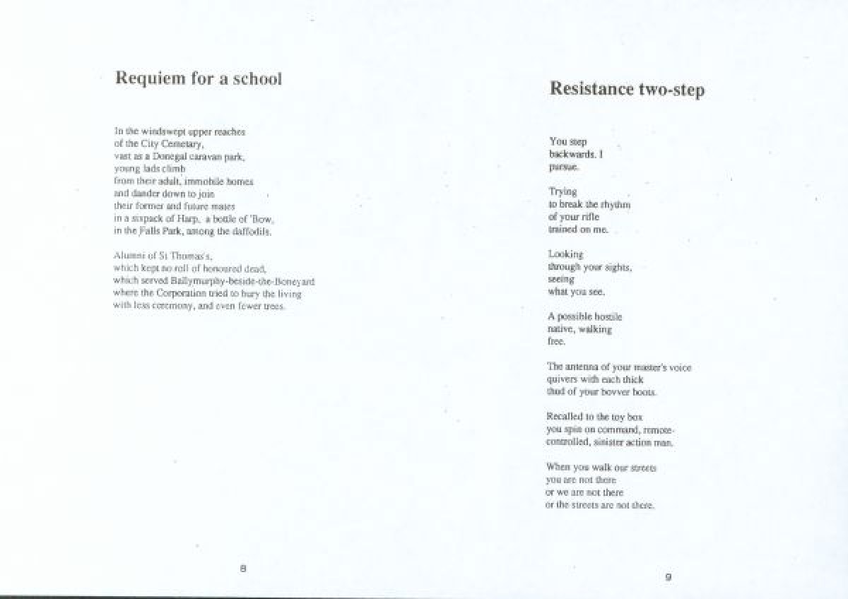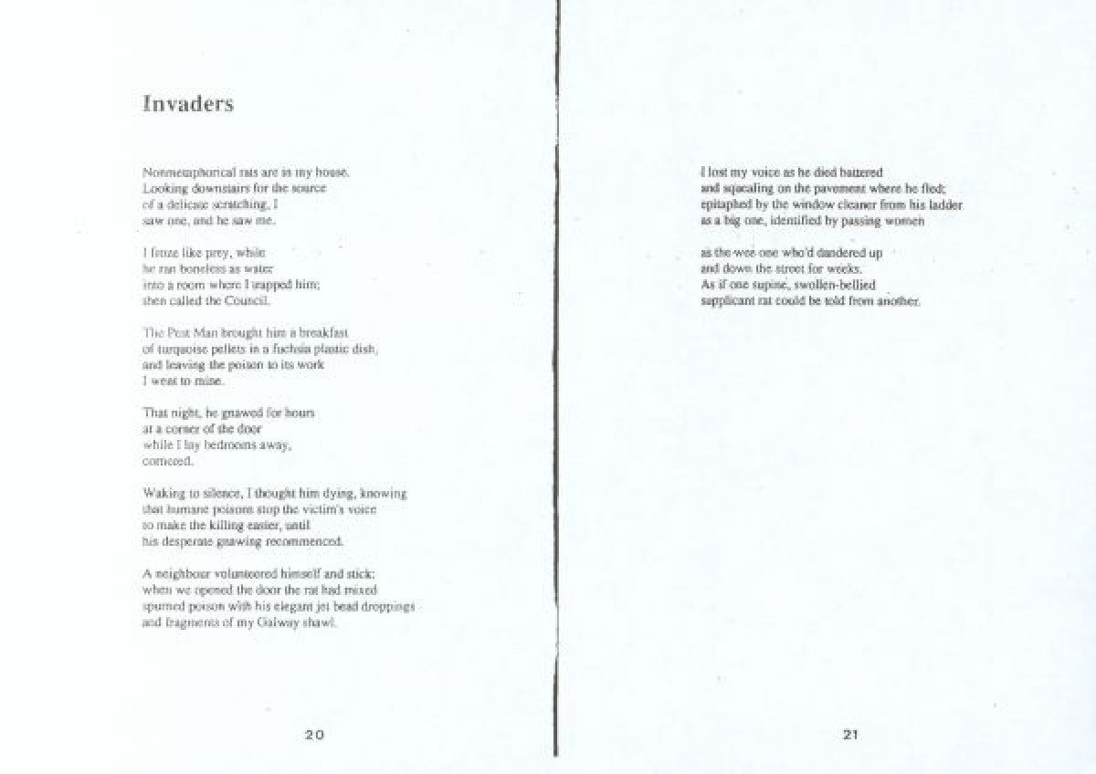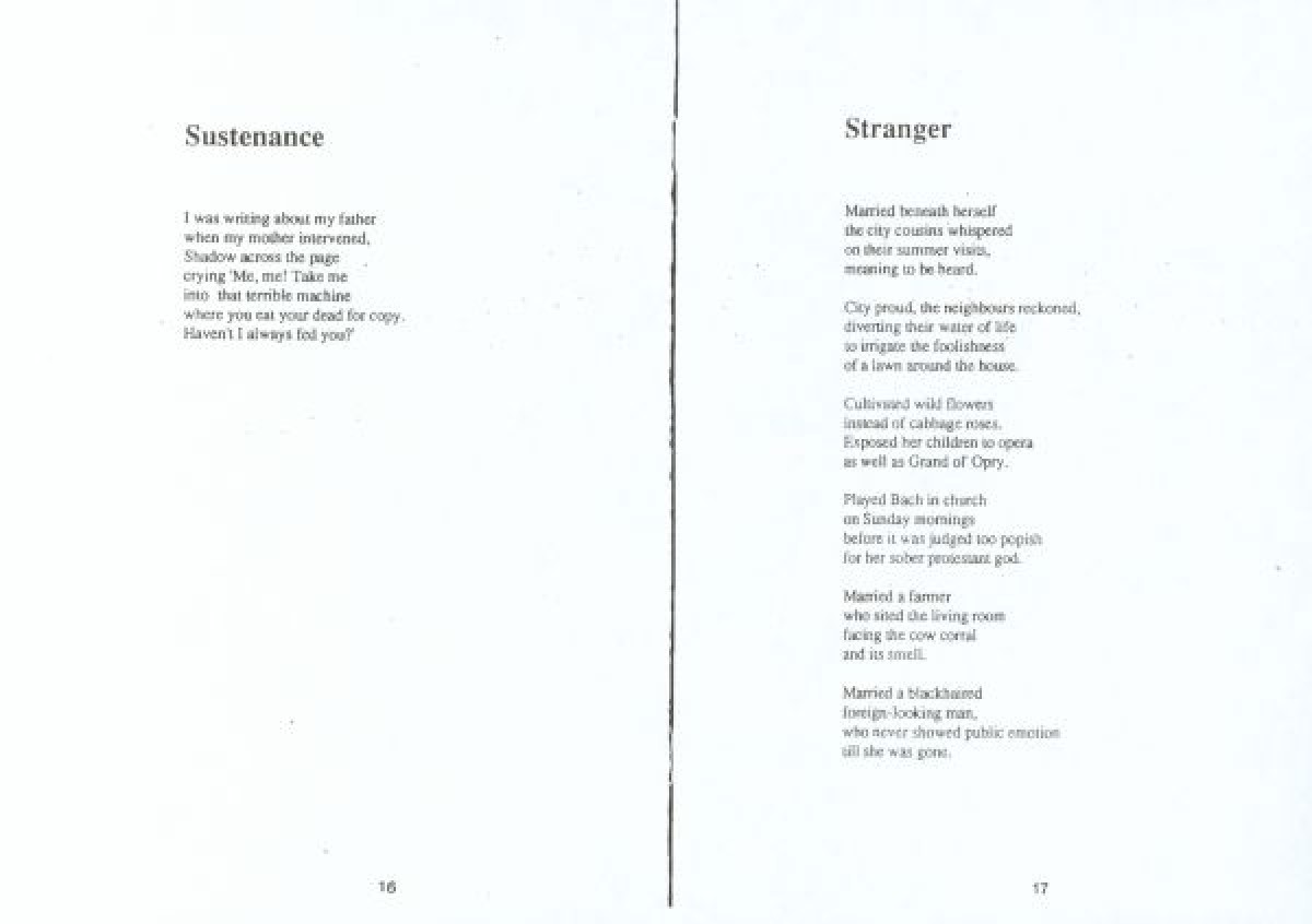 Falls Women's Centre. Includes a black and white illustrated cover by an anonymous friend in London. Contents include: Some mornings; The mind retains; Banshee in the office; Claiming; Requiem for a school; Resistance two-step; The Dungloe Road; My mother's; Sustenance; Stranger; Afterbirth; Daughter, grown; Invaders; Herself; First fire; and Changeling.