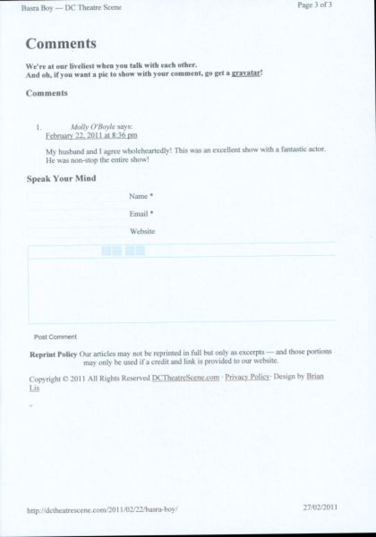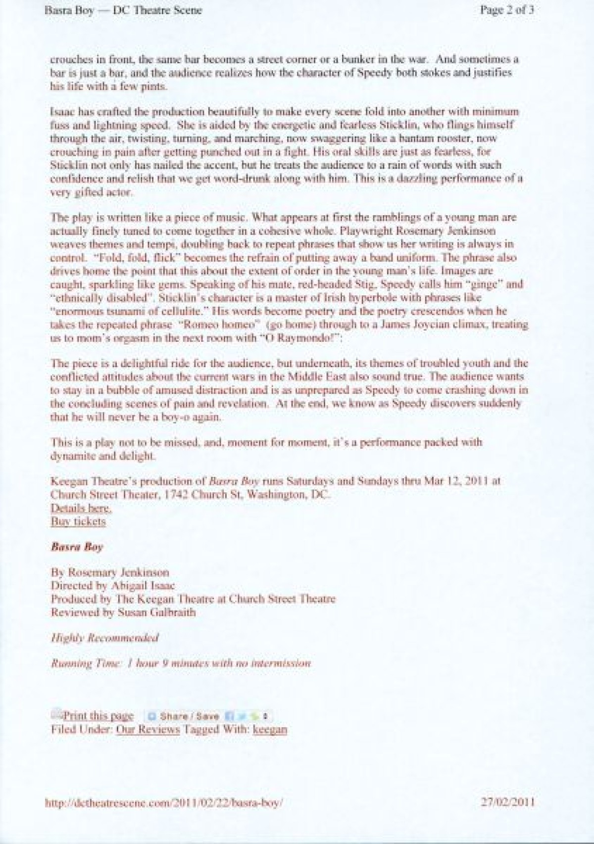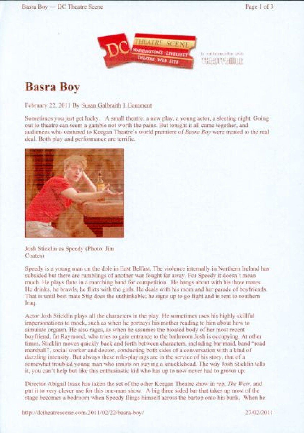 DC Theatre Scene online newspaper review of "Basra Boy" a one-man play by Rosemary Jenkinson, directed by Abigail Isaac, and produced by the