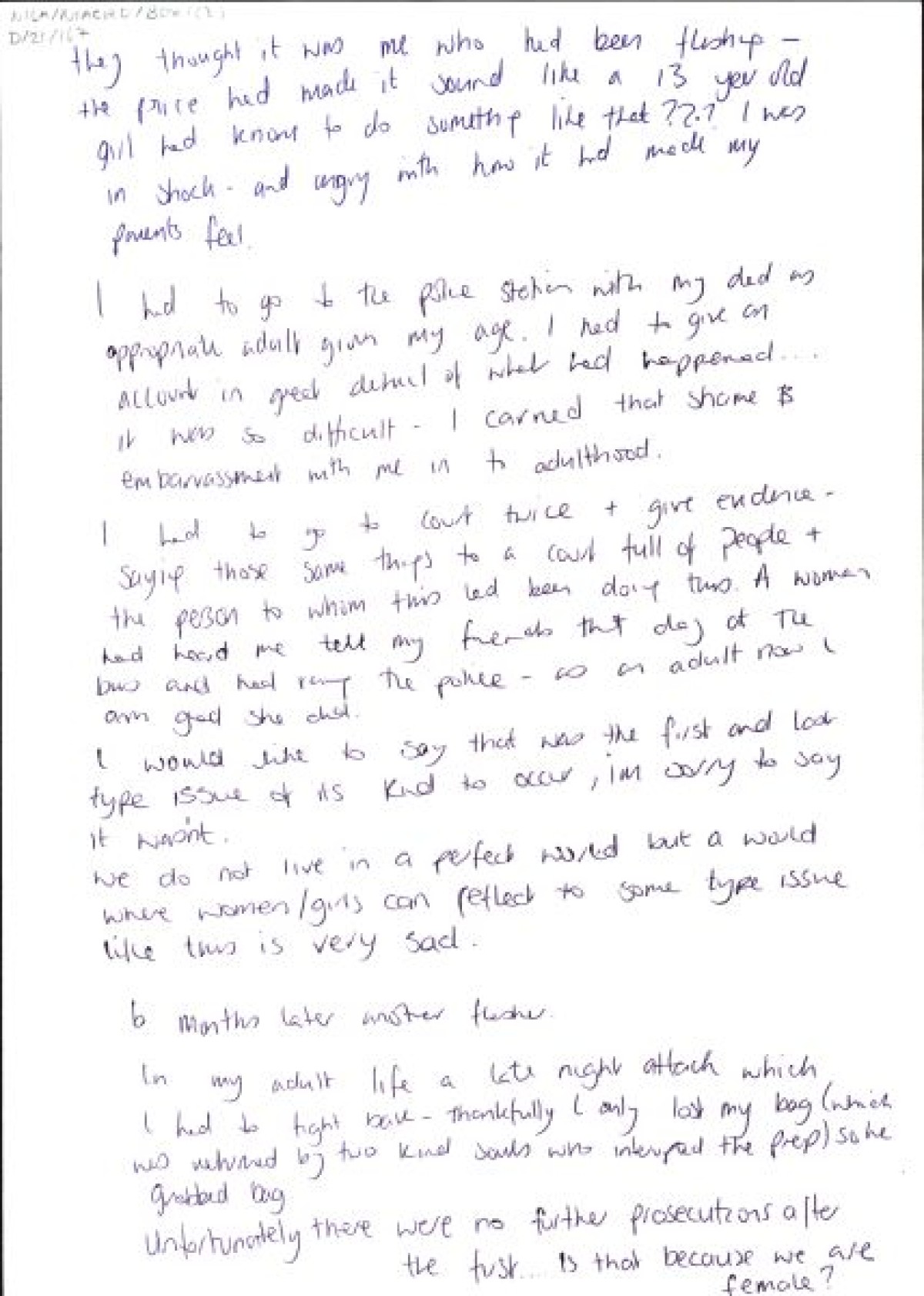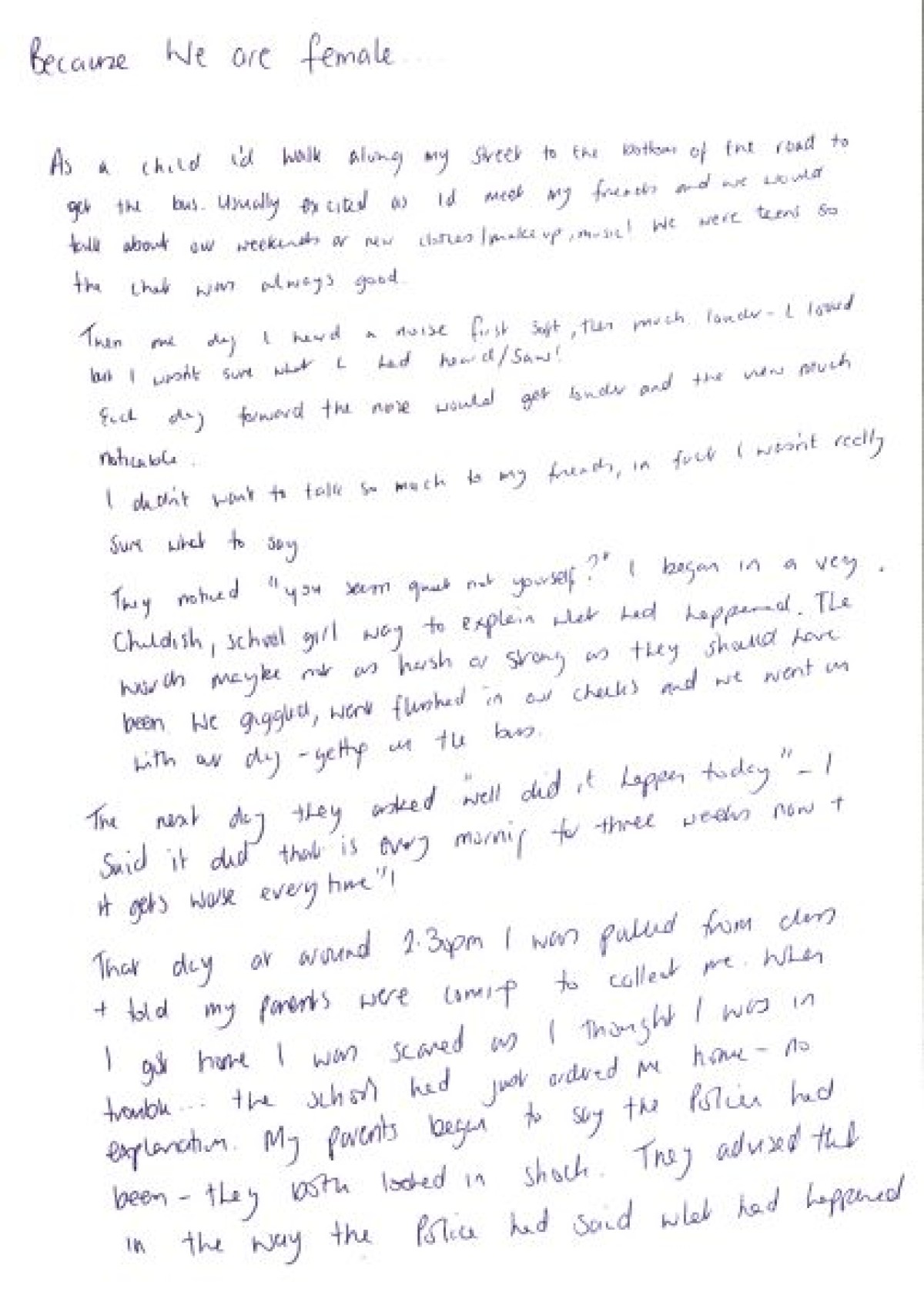 Handwritten document, 'Because We are female'. Created by a participant from the Acorn Group and records her experiences of sexual harassment as a teenager. Creative writing project hosted by NIACRO (Northern Ireland Association for the Care and Resettlement of Offenders), written during workshops with Rosemary Jenkinson, 2021.