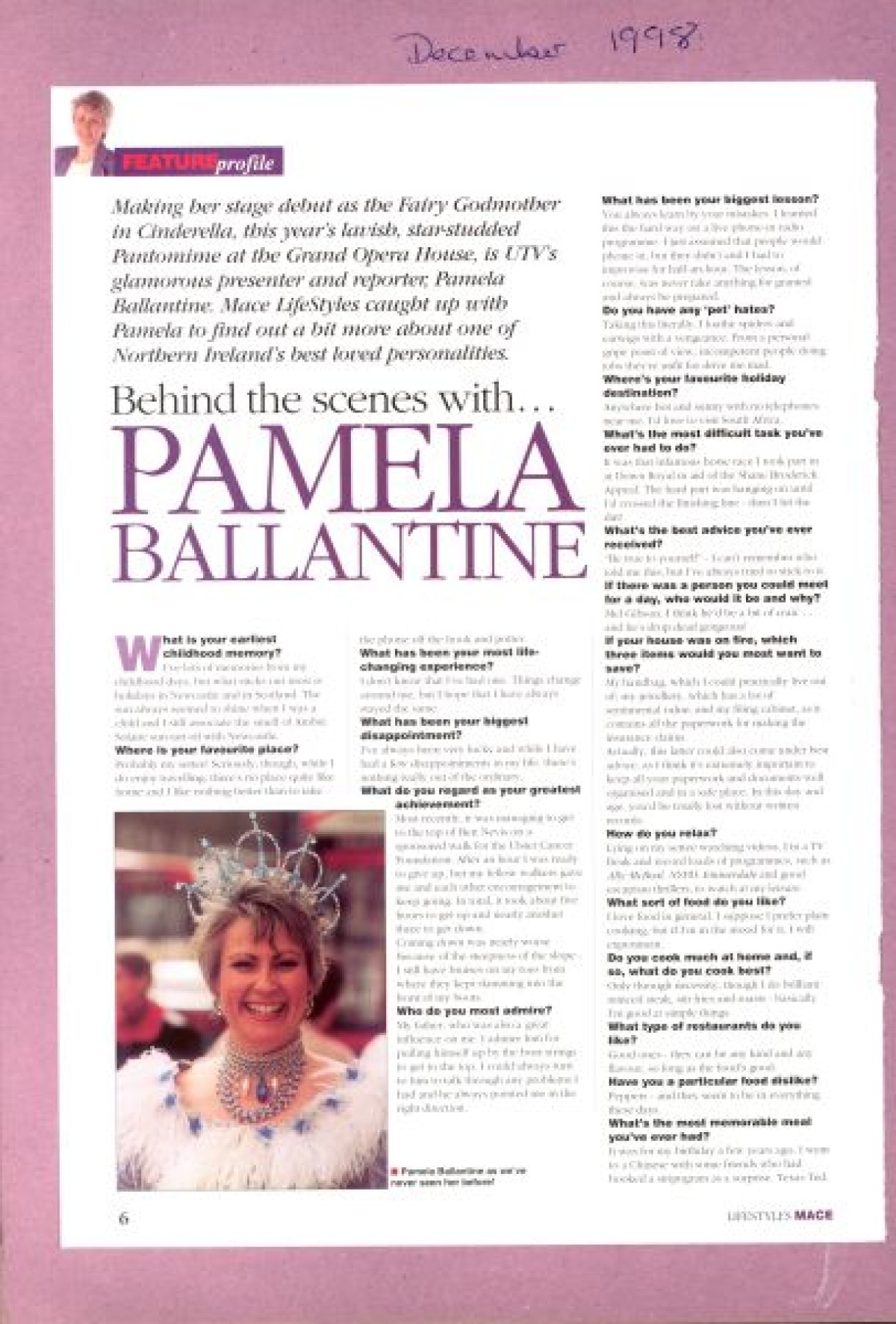 MACE magazine containing an interview with Pamela Ballantine ahead of her stage debut as the Fairy Godmother in a "Cinderella" pantomime at the