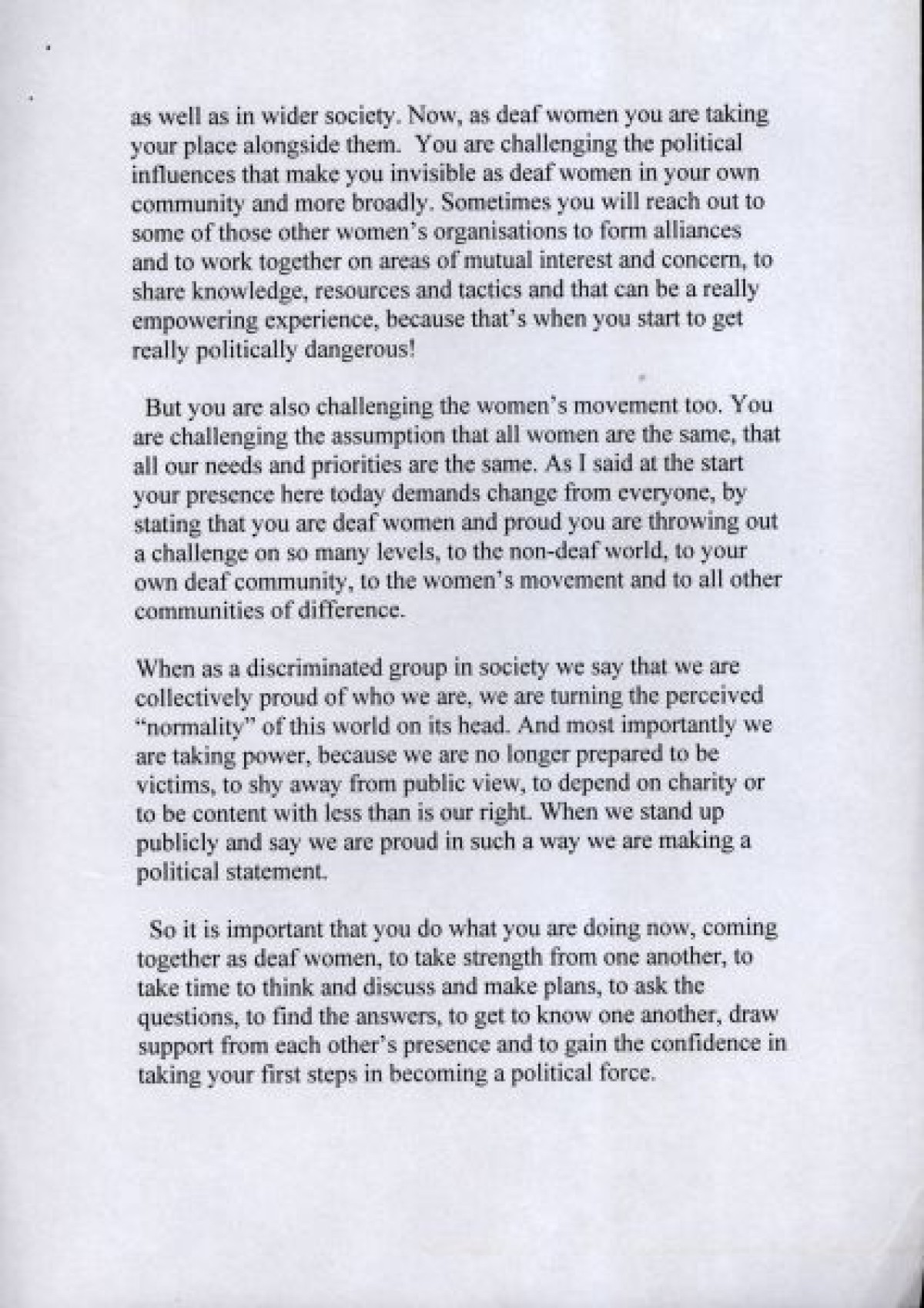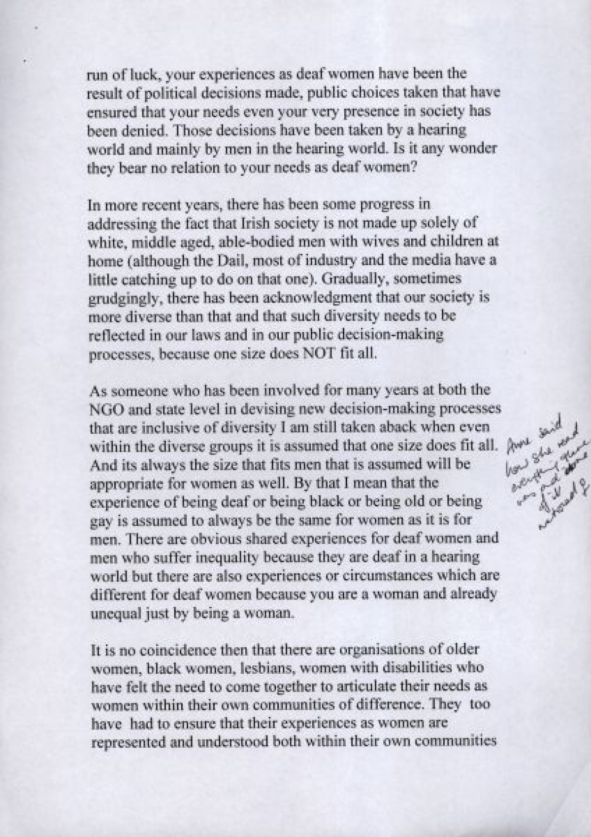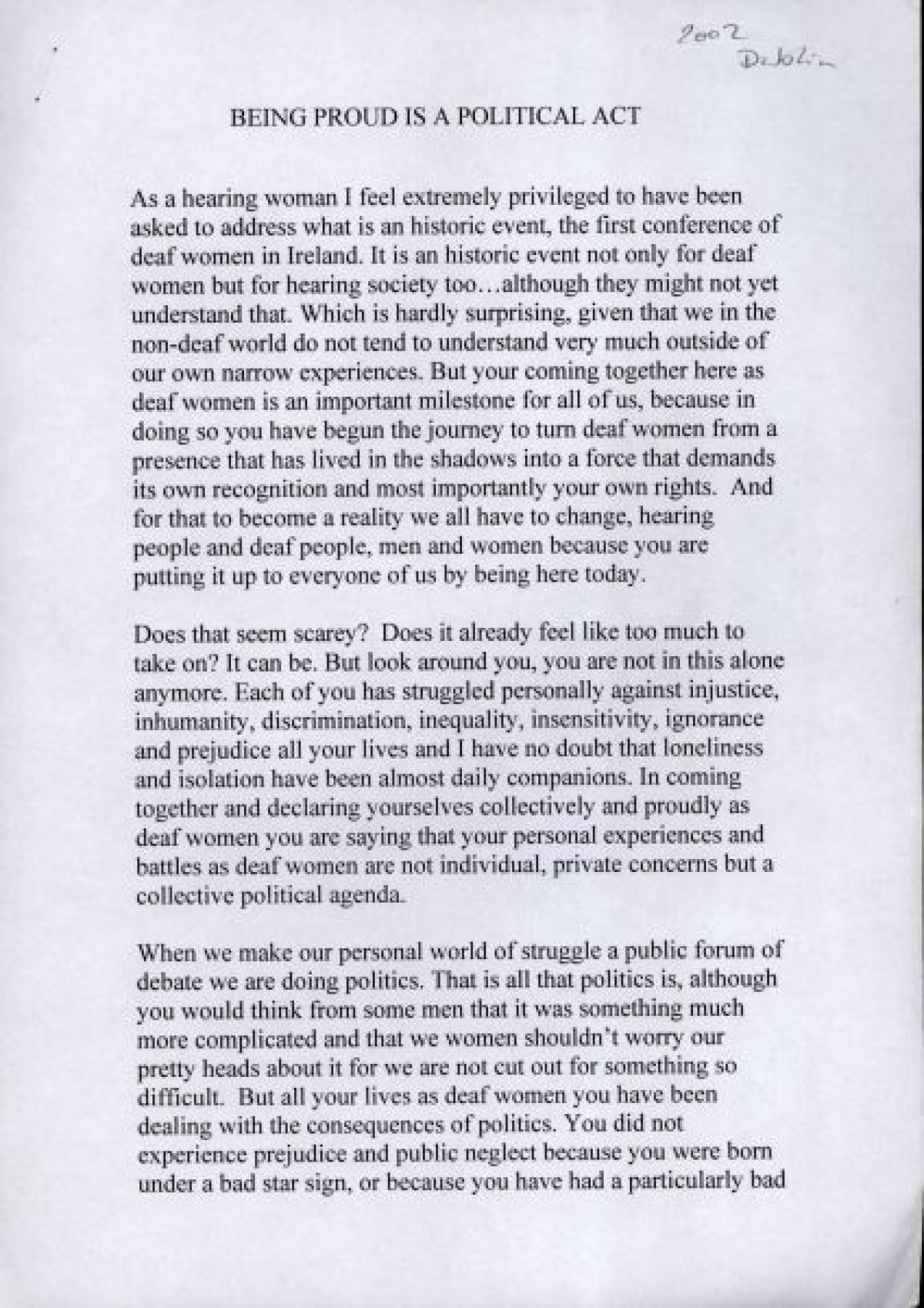 Speech prepared by Marie Mulholland for the first conference of deaf women in Ireland, held in Dublin, 2002. Discusses the progress of inclusivity in Irish political decision making, and challenges assumptions about deaf women within the women's movement.