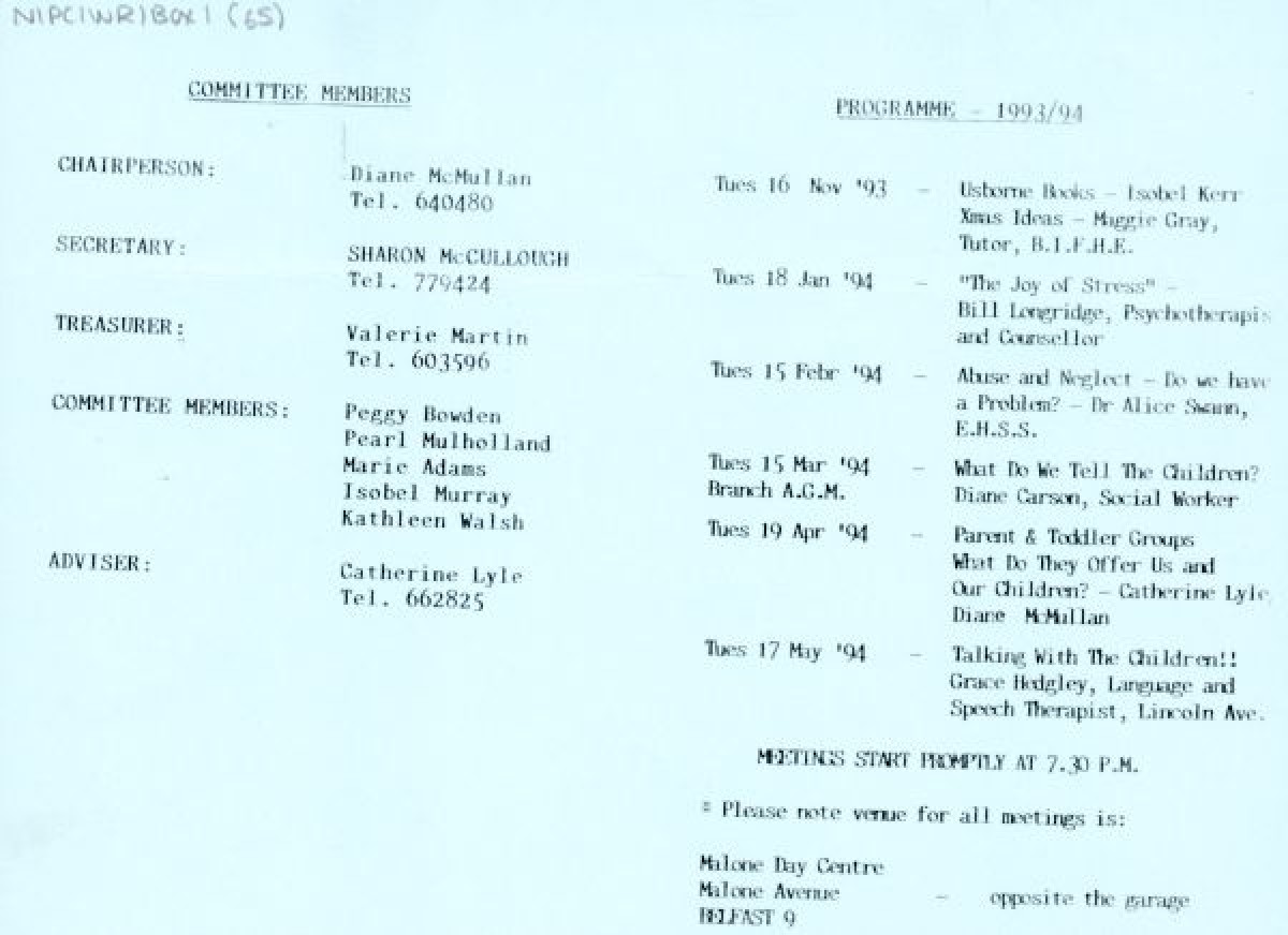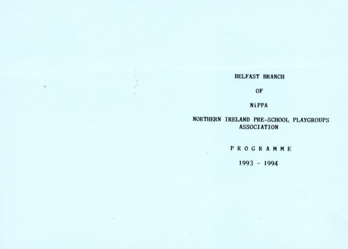 Programme of talks and events from 1993-1994 for Belfast Northern Ireland Pre-School Playgroup Association. Printed on blue card.