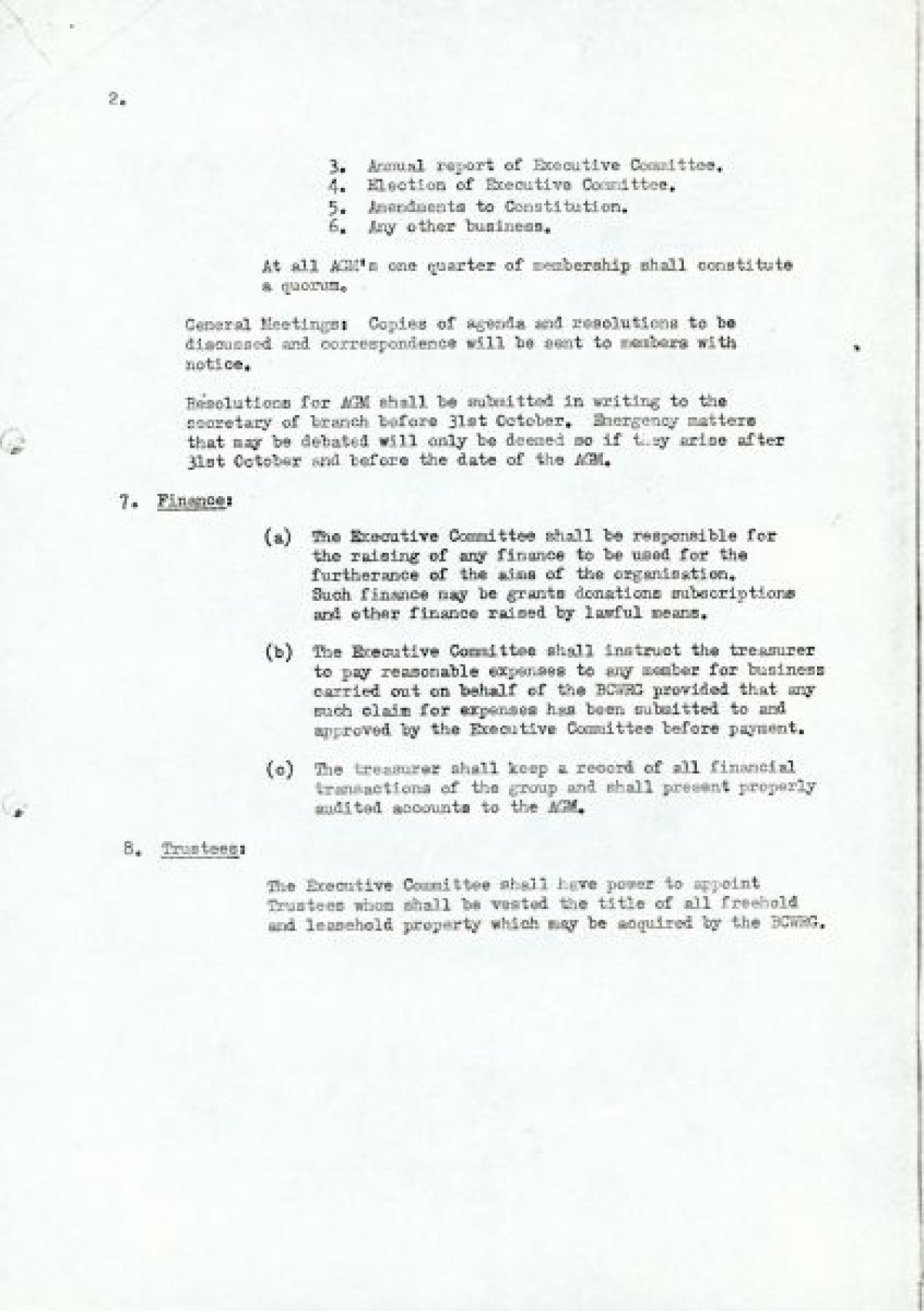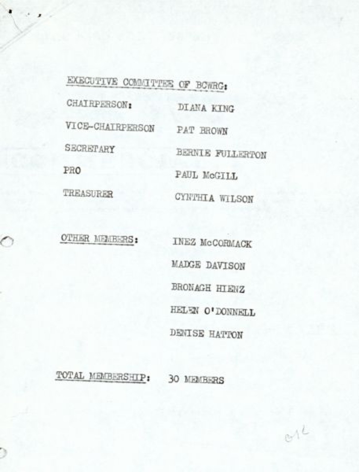 Draft constitution for Belfast Central Women’s Rights Group, listing objectives, structure of meetings, finances, and membership. Also contains list of the members of the Executive Committee.