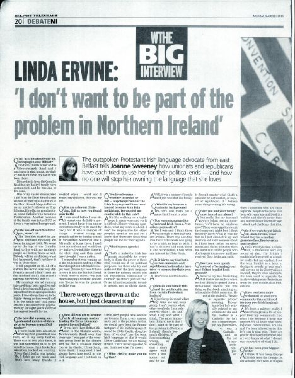 Belfast Telegraph in 2015. In the article, she discusses her childhood, her previous battles with mental illness, her educational journey, and her motivation to unify people by making the Irish language accessible to everyone.