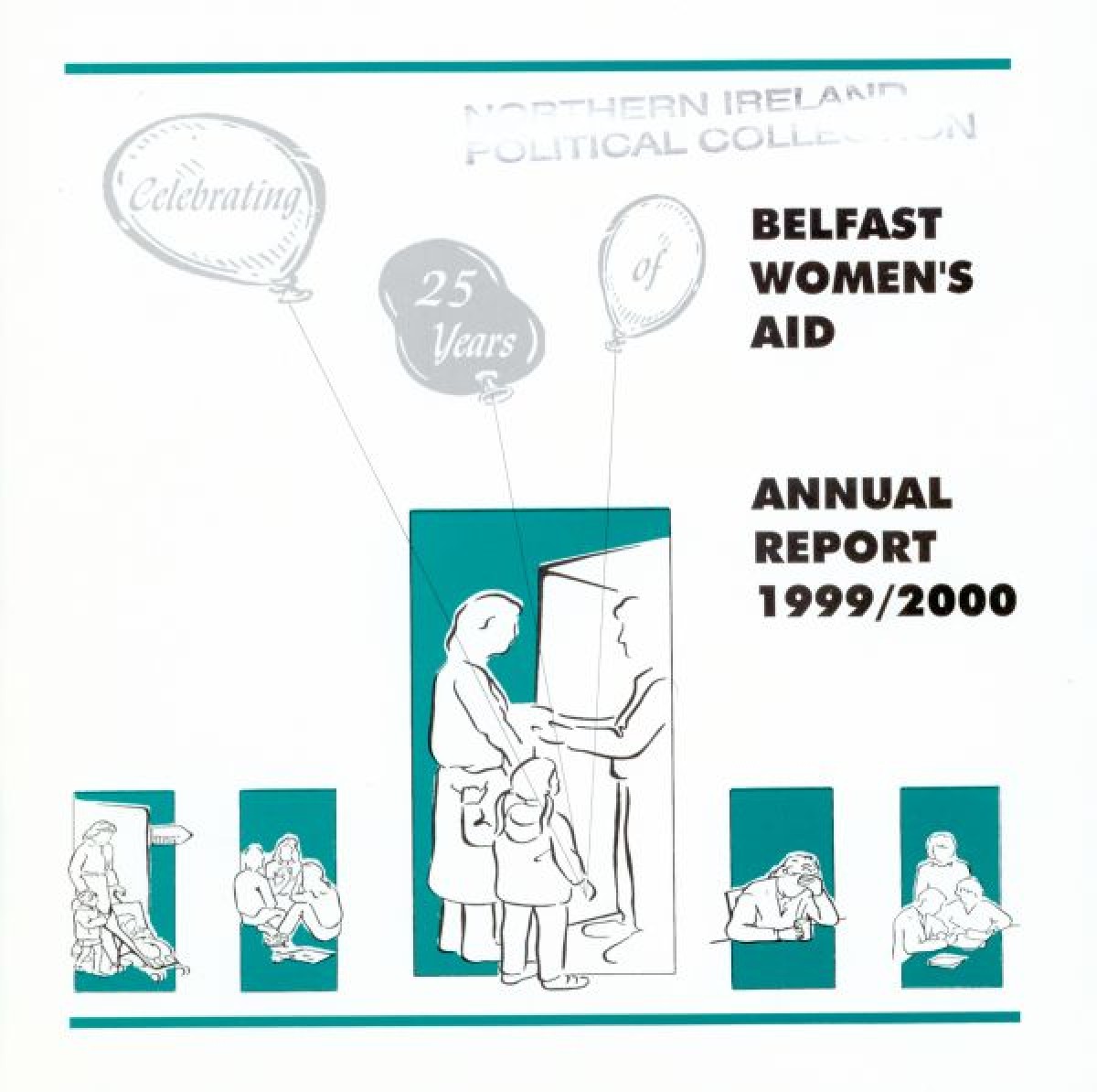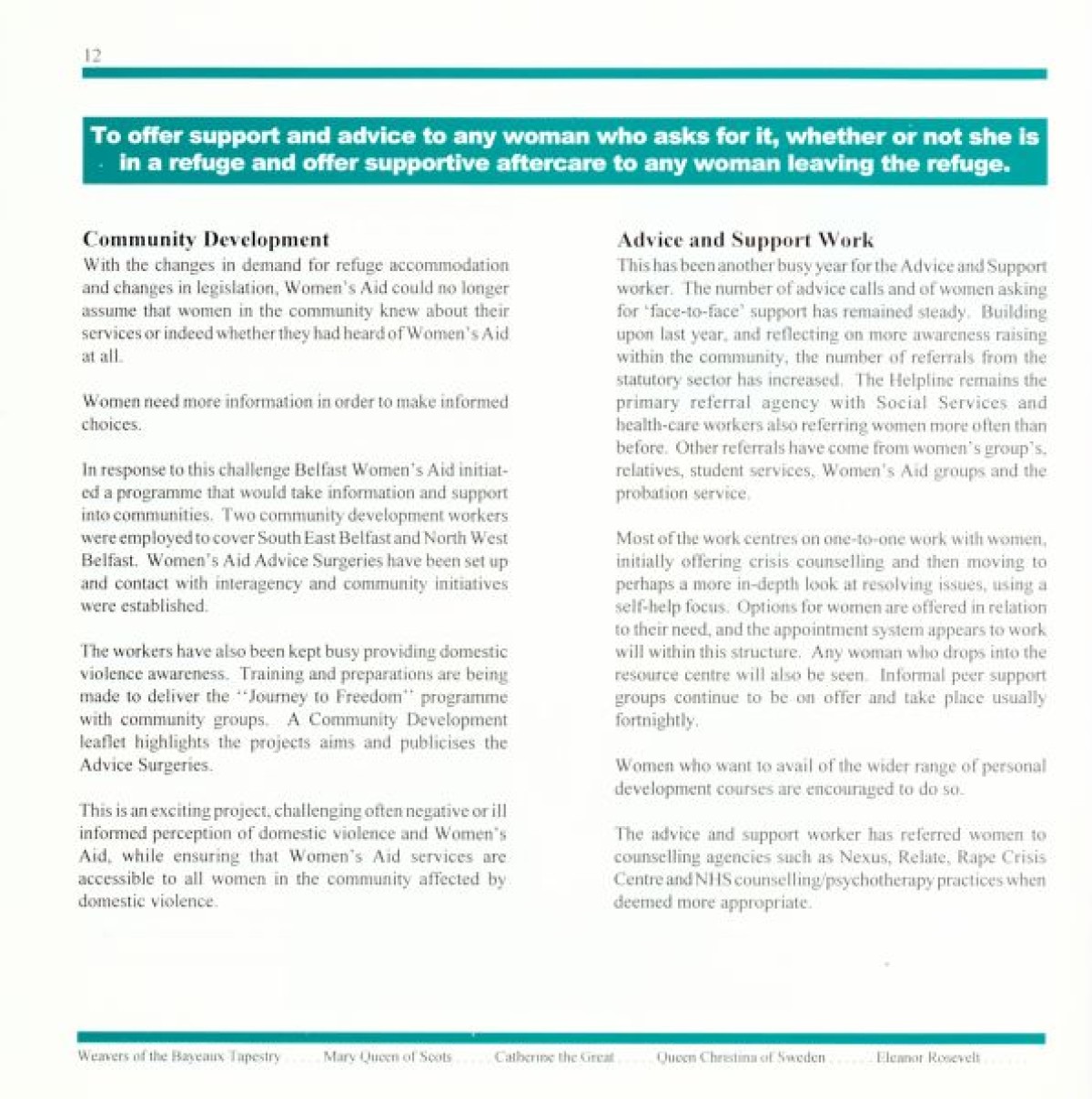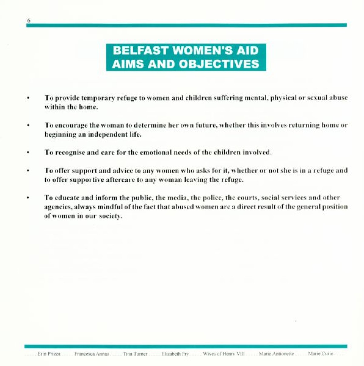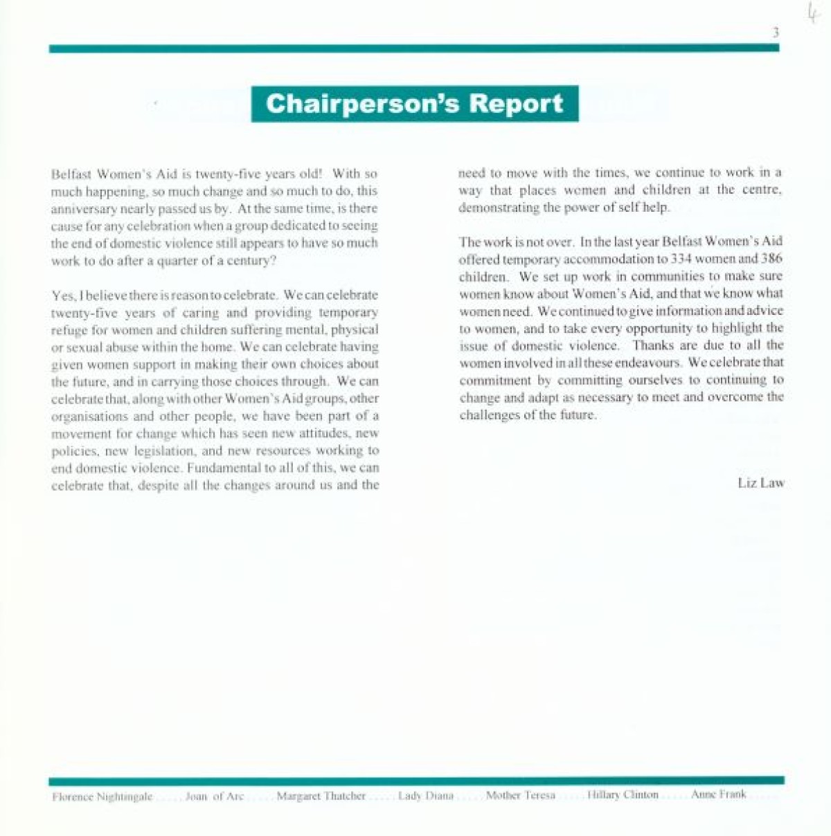 Belfast Women's Aid. Contains a Chairperson's report by Liz Law, and Management Co-ordinator's report by Margot Hesketh. Discusses the aims of the Women's Aid organisation to provide advice, support, refuge, and aftercare for abused women and children, and empower women to help themselves, as well as information about support services, including volunteering, fundraising, and learning and development.