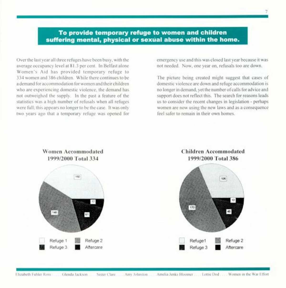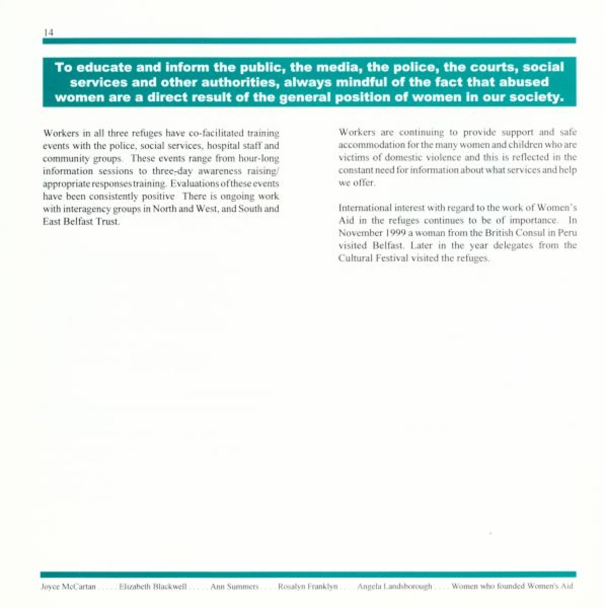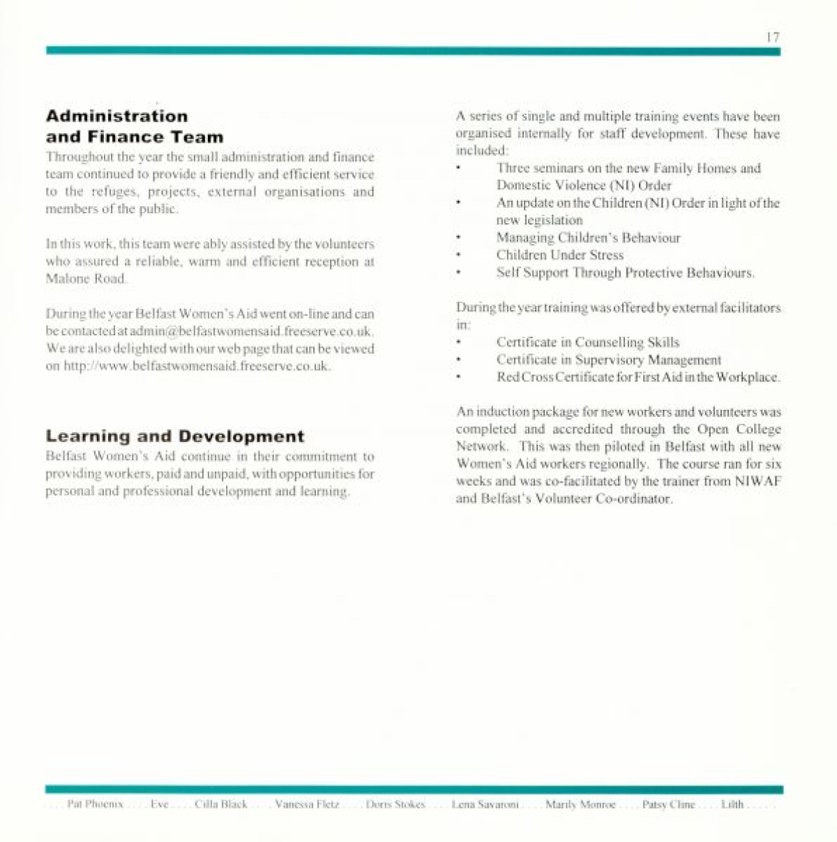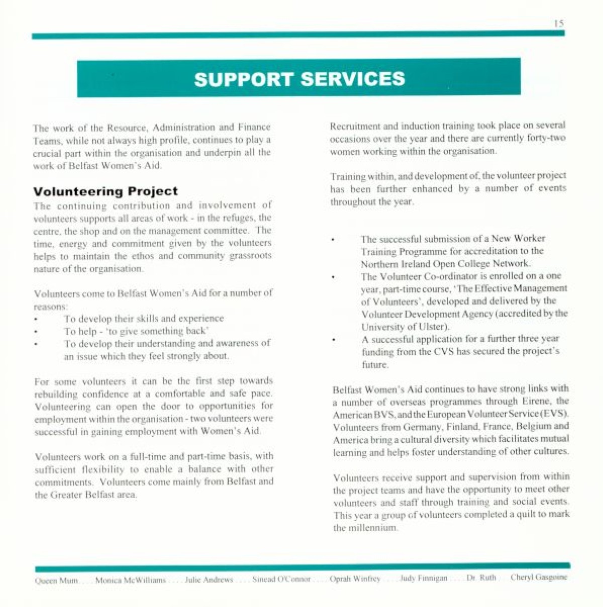 Belfast Women's Aid. Contains a Chairperson's report by Liz Law, and Management Co-ordinator's report by Margot Hesketh. Discusses the aims of the Women's Aid organisation to provide advice, support, refuge, and aftercare for abused women and children, and empower women to help themselves, as well as information about support services, including volunteering, fundraising, and learning and development.