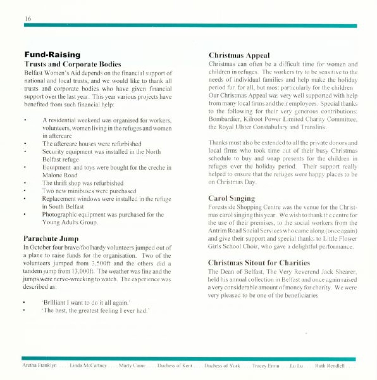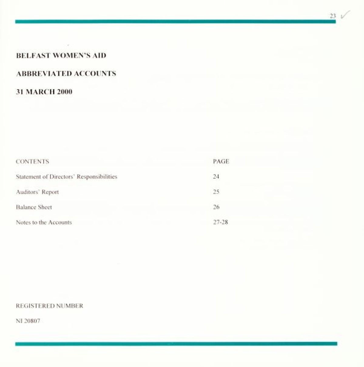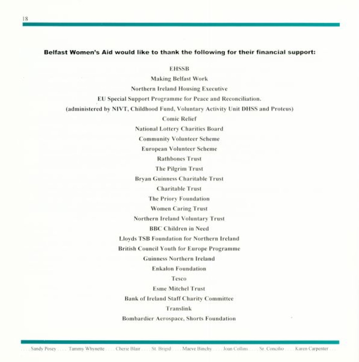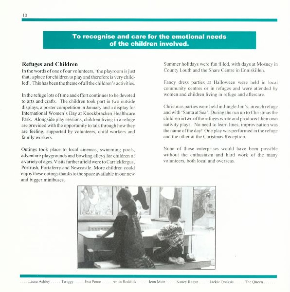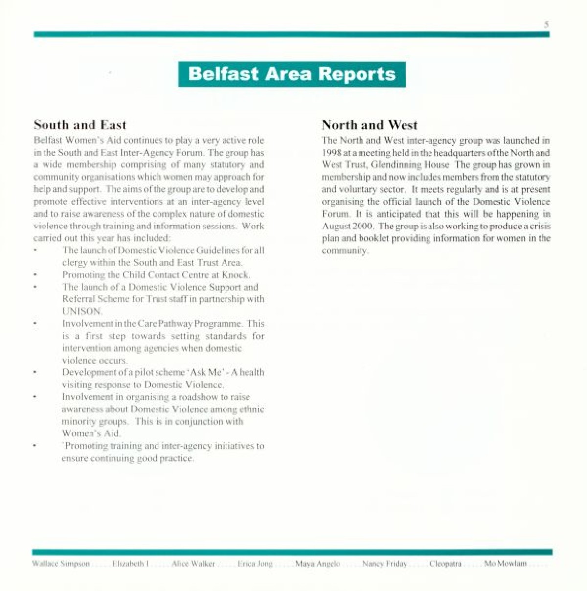Belfast Women's Aid. Contains a Chairperson's report by Liz Law, and Management Co-ordinator's report by Margot Hesketh. Discusses the aims of the Women's Aid organisation to provide advice, support, refuge, and aftercare for abused women and children, and empower women to help themselves, as well as information about support services, including volunteering, fundraising, and learning and development.
