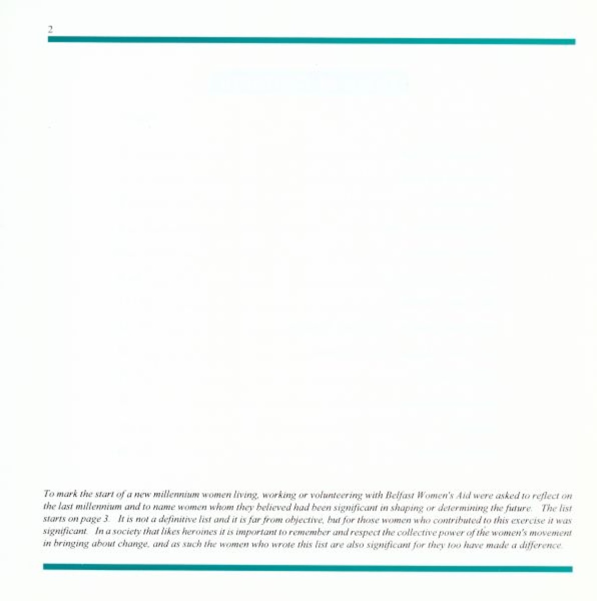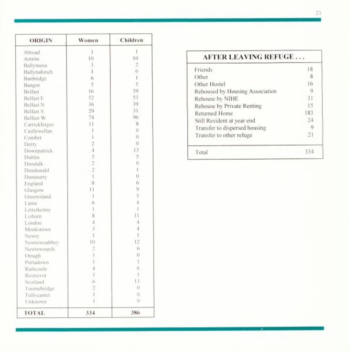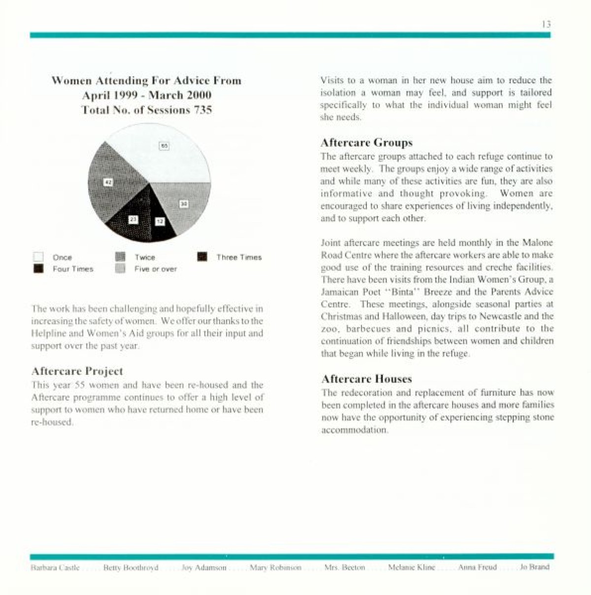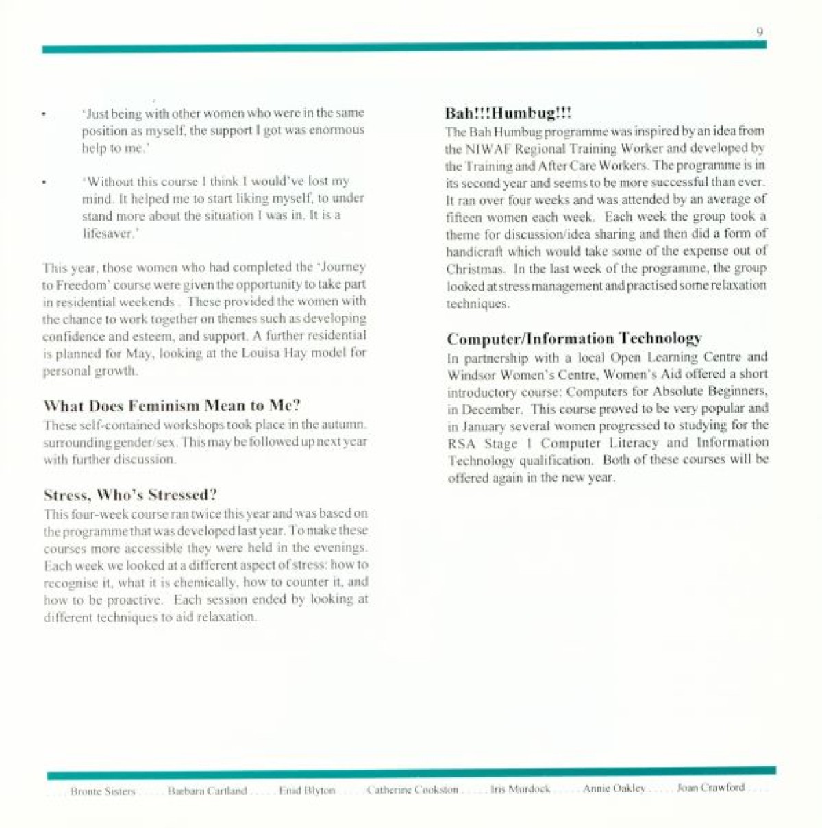 Belfast Women's Aid. Contains a Chairperson's report by Liz Law, and Management Co-ordinator's report by Margot Hesketh. Discusses the aims of the Women's Aid organisation to provide advice, support, refuge, and aftercare for abused women and children, and empower women to help themselves, as well as information about support services, including volunteering, fundraising, and learning and development.