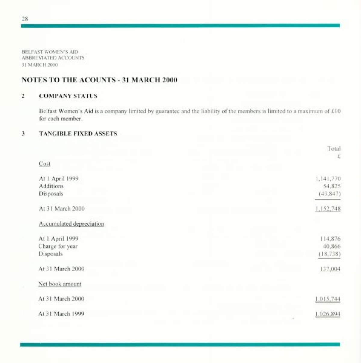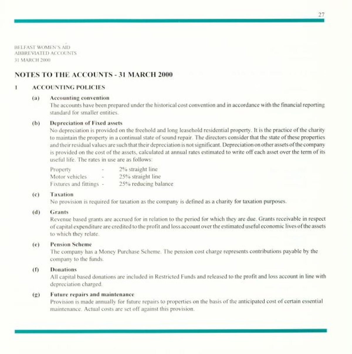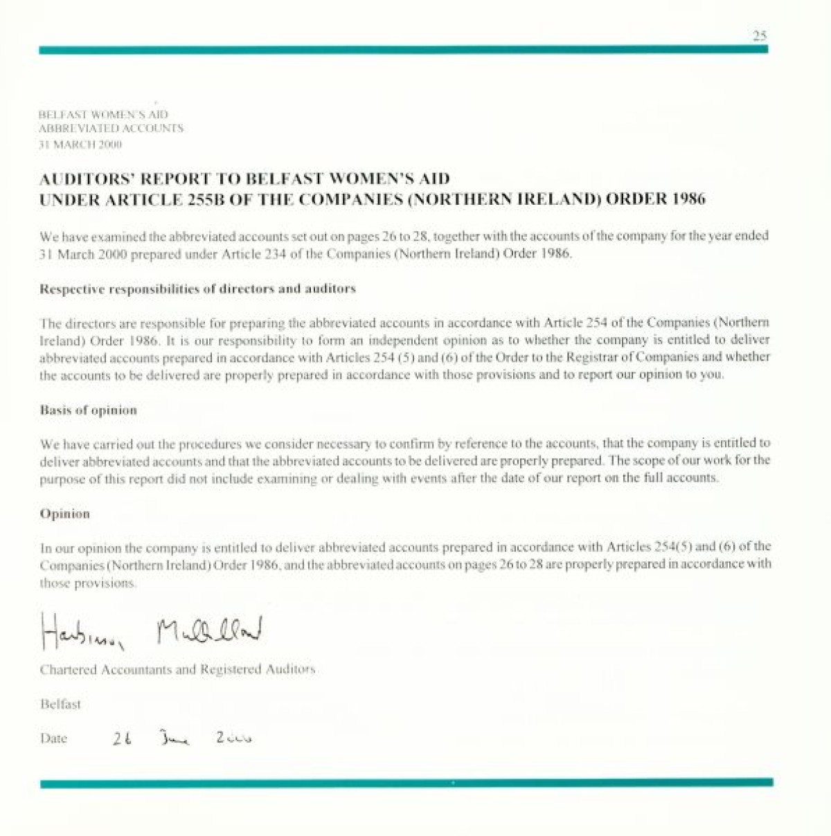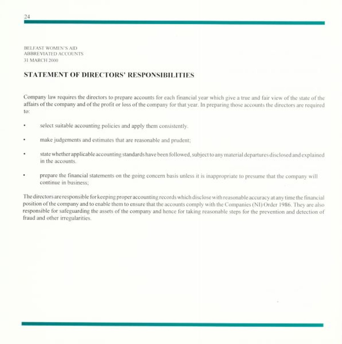 Belfast Women's Aid. Contains a Chairperson's report by Liz Law, and Management Co-ordinator's report by Margot Hesketh. Discusses the aims of the Women's Aid organisation to provide advice, support, refuge, and aftercare for abused women and children, and empower women to help themselves, as well as information about support services, including volunteering, fundraising, and learning and development.