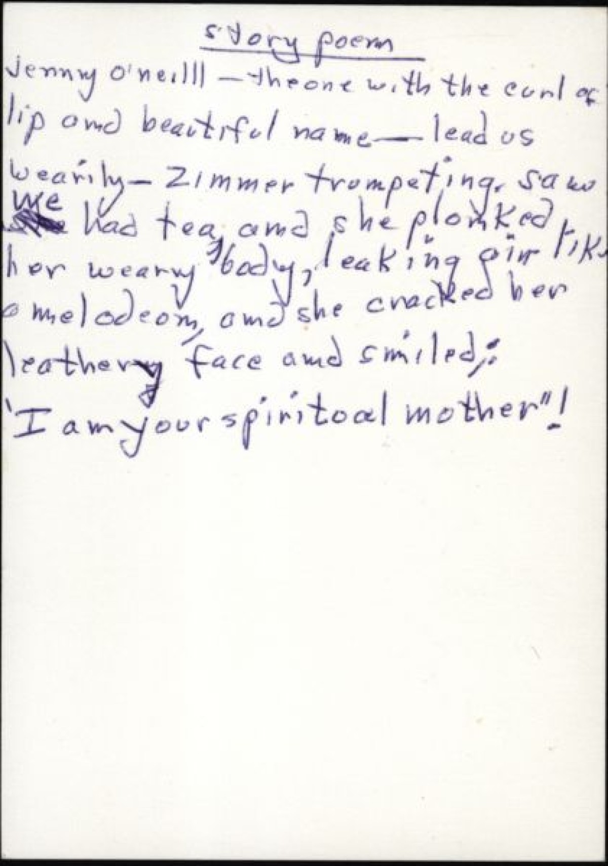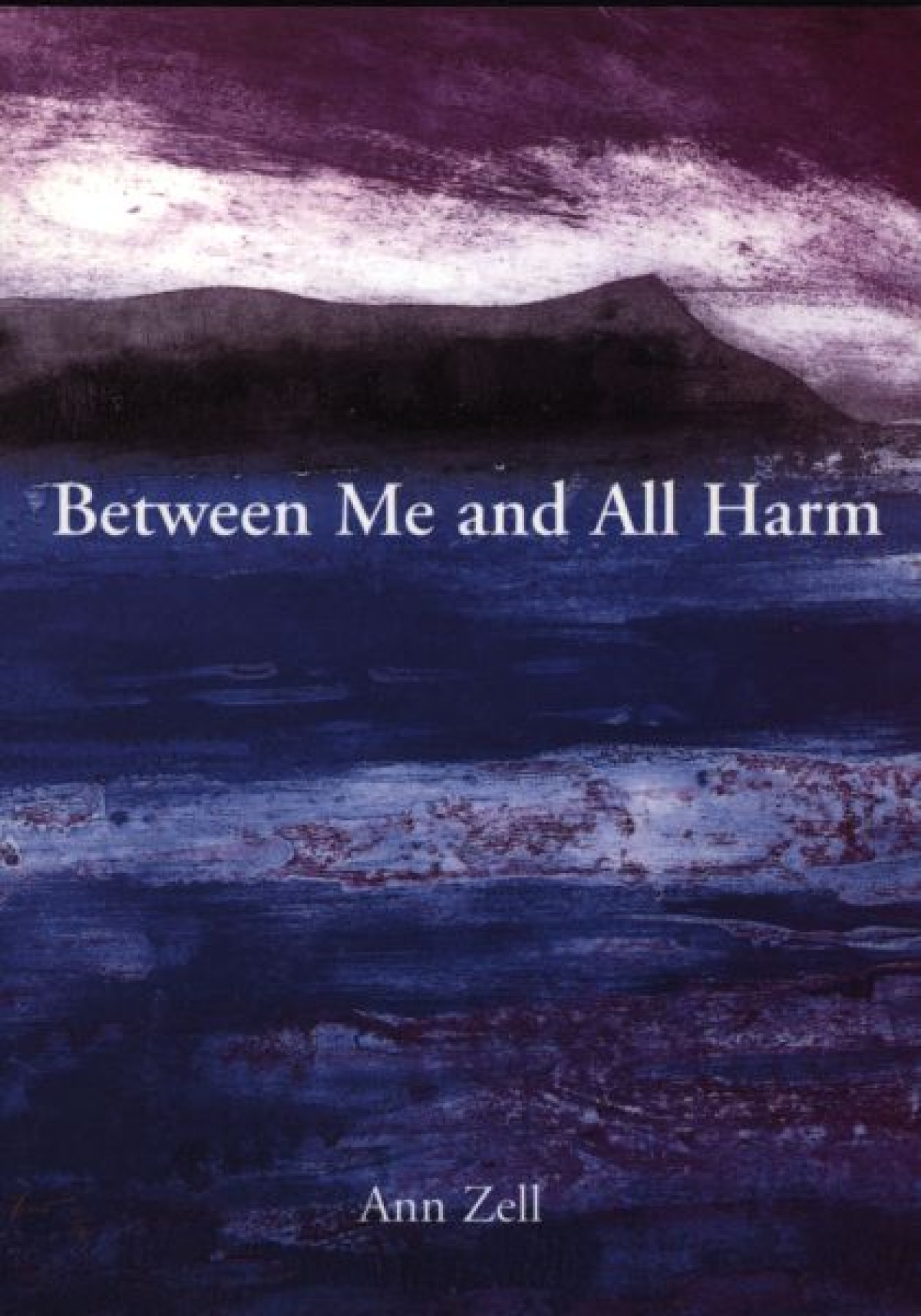 A handwritten story poem by Ann Zell, written on the back of a postcard featuring cover artwork from her book, 'Between Me and All Harm.'