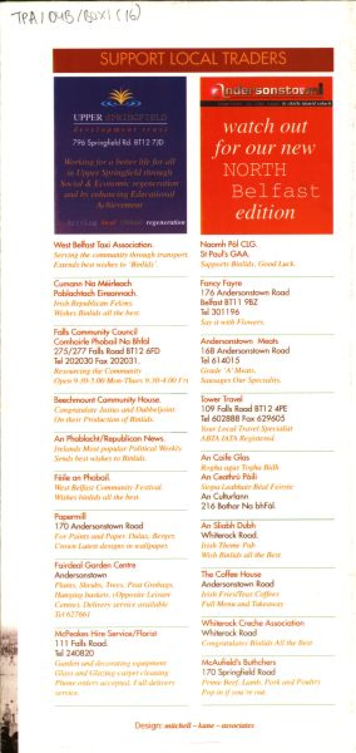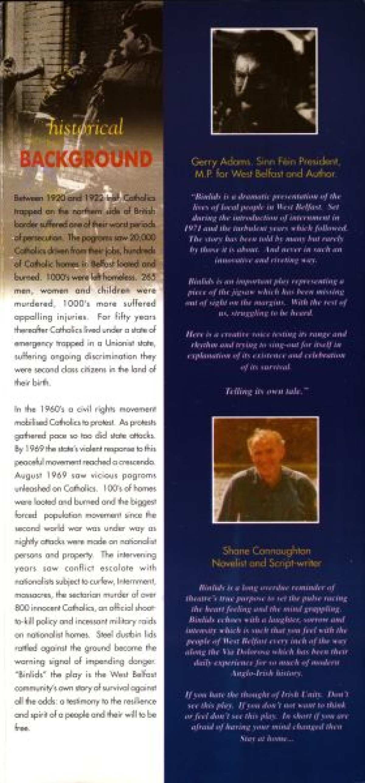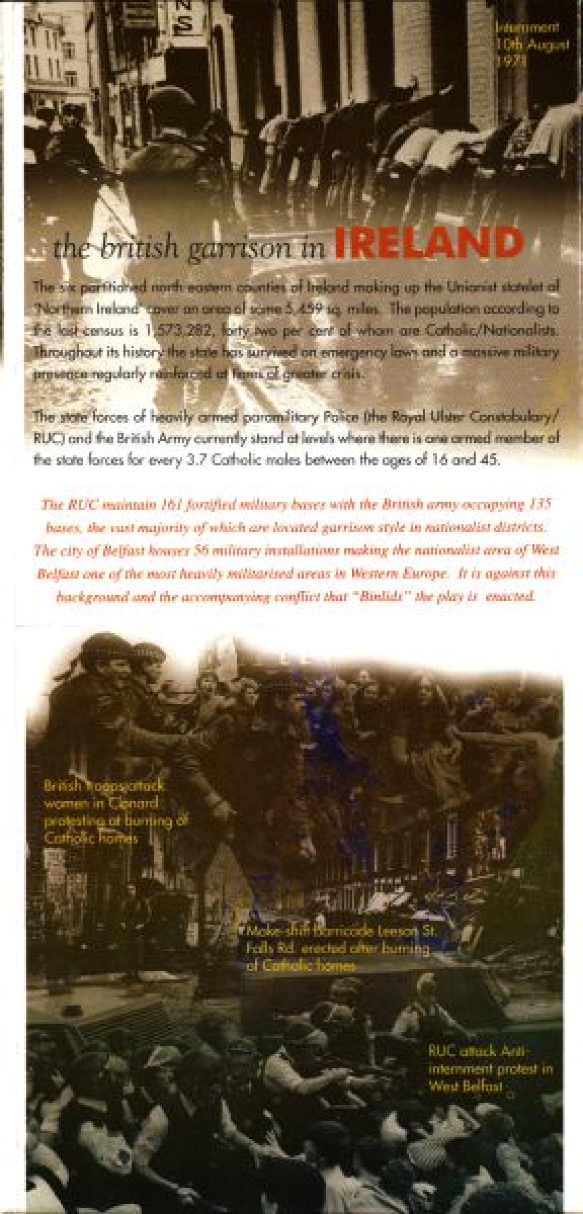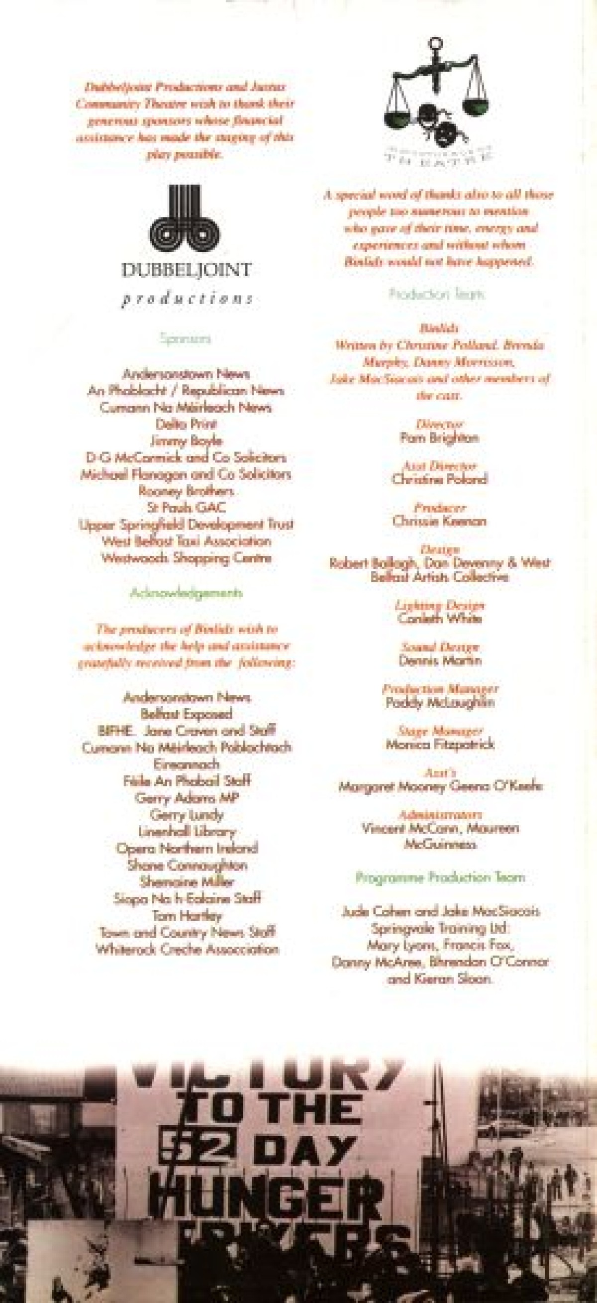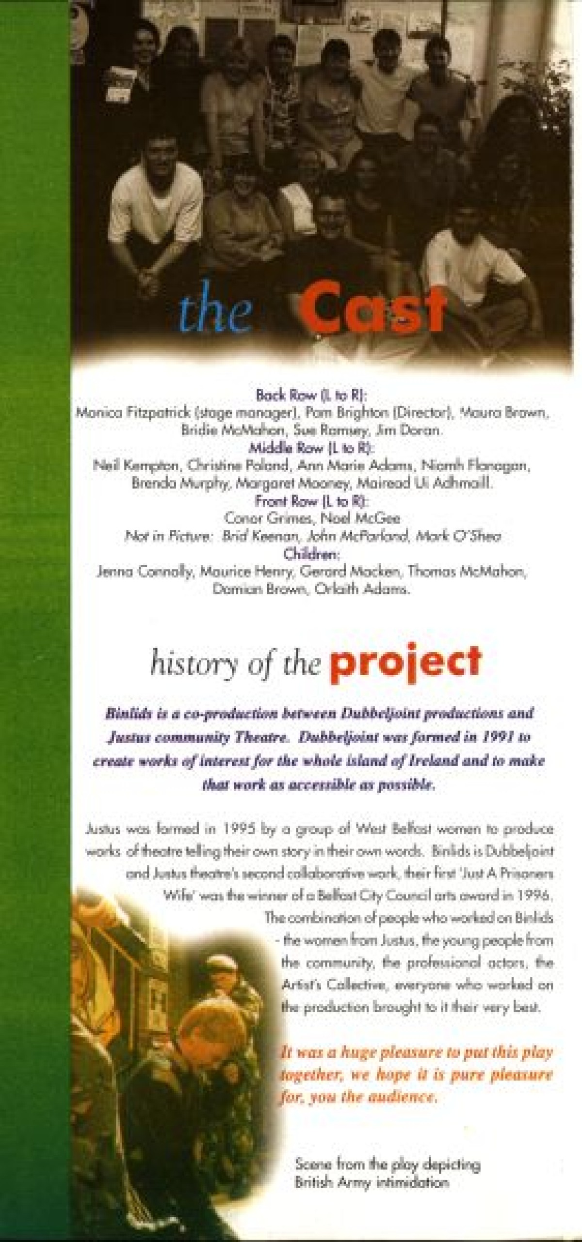 Programme for "Binlids: The story of West Belfast resistance", a production by DubbelJoint and JustUs Community Theatre.