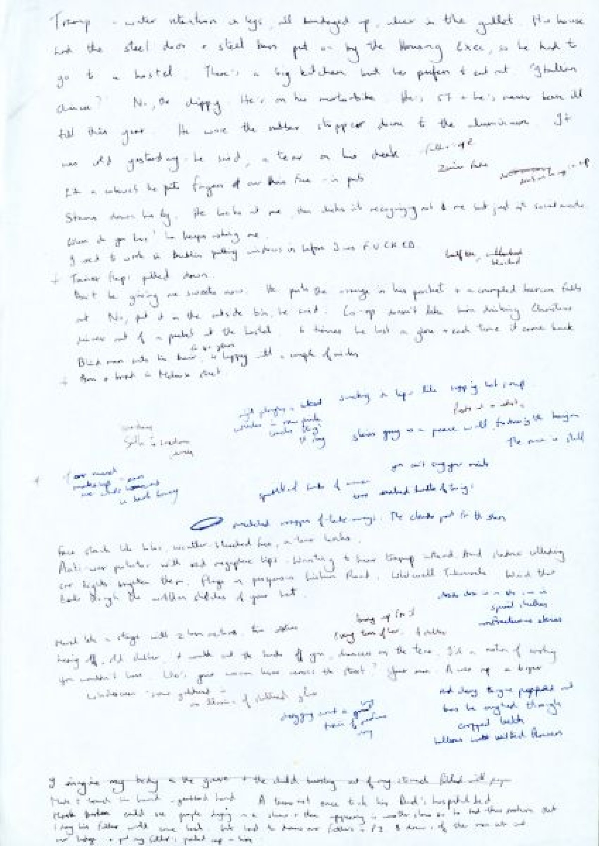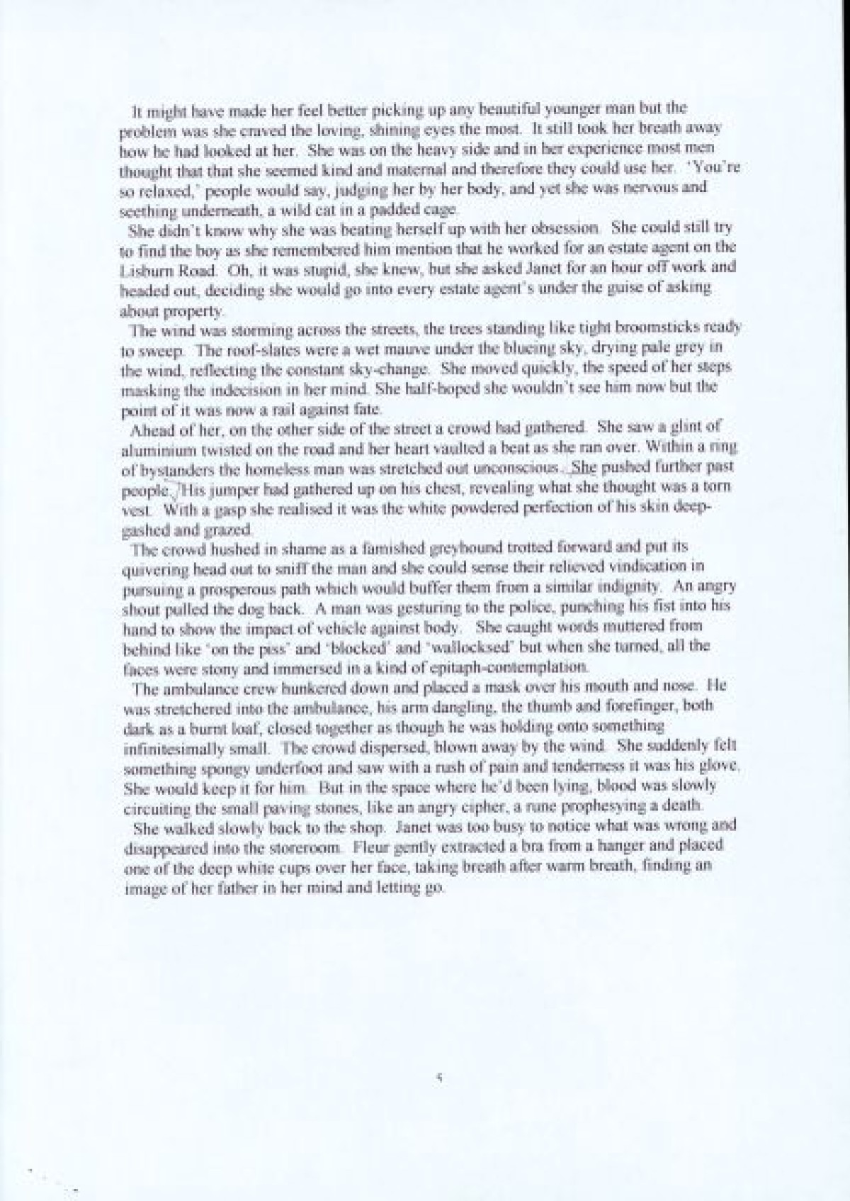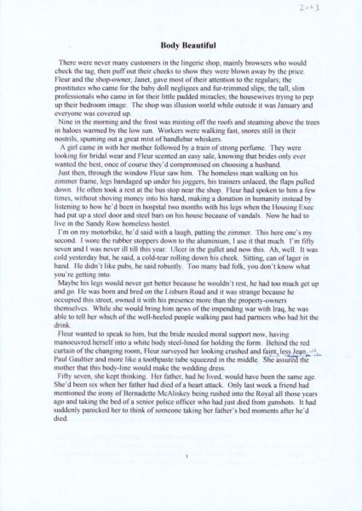 Short story, titled "Body Beautiful," written by Rosemary Jenkinson, about a woman's experiences in a lingerie shop and her relationship with a homeless man on the streets. Includes a page of handwritten notes.