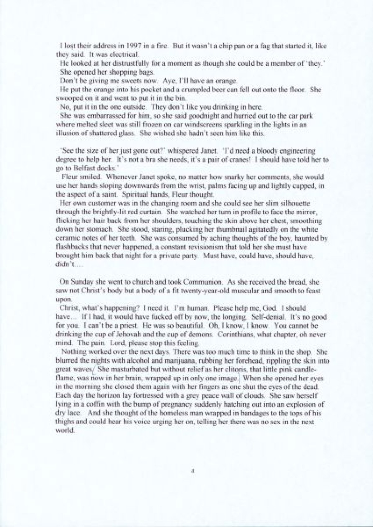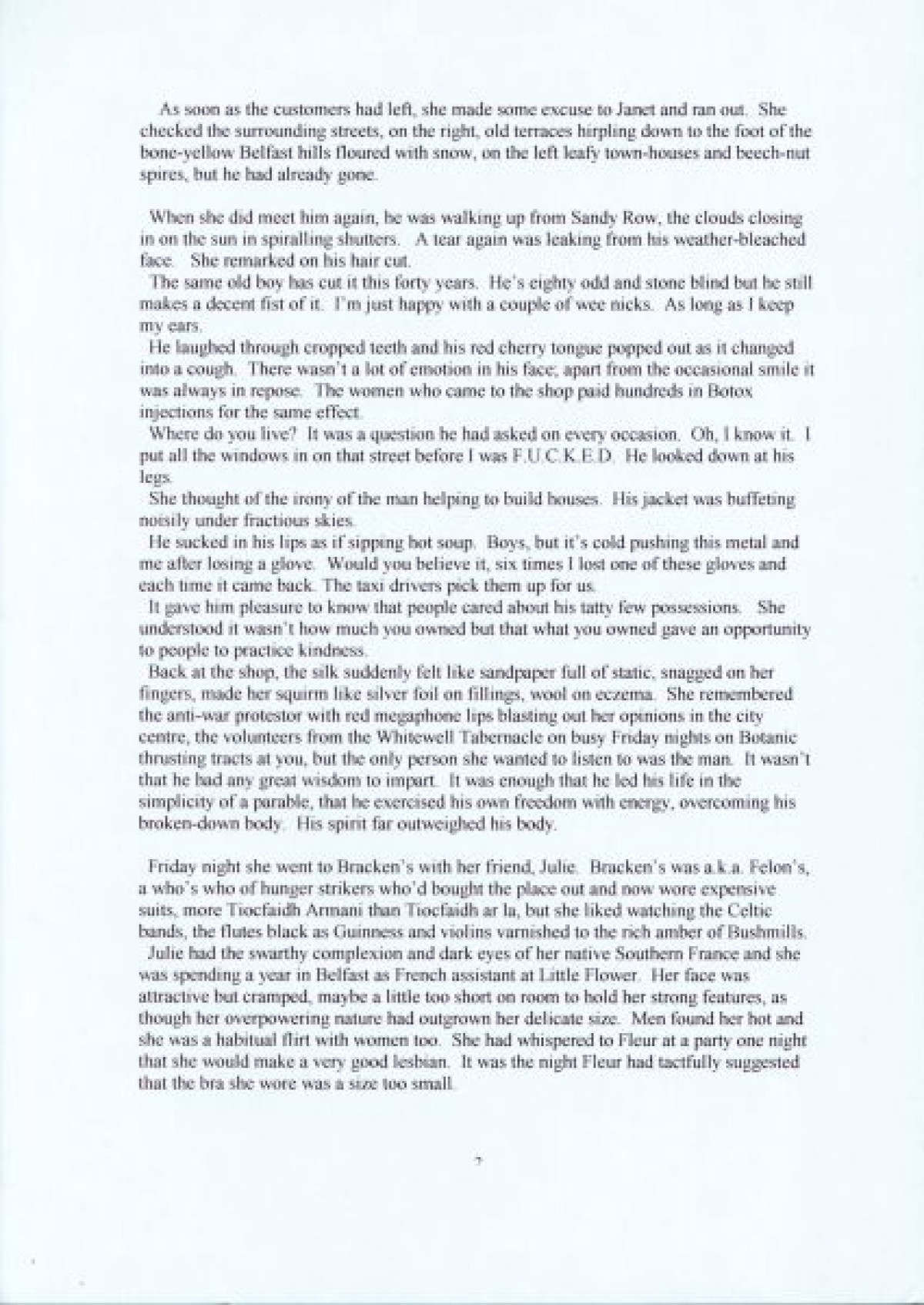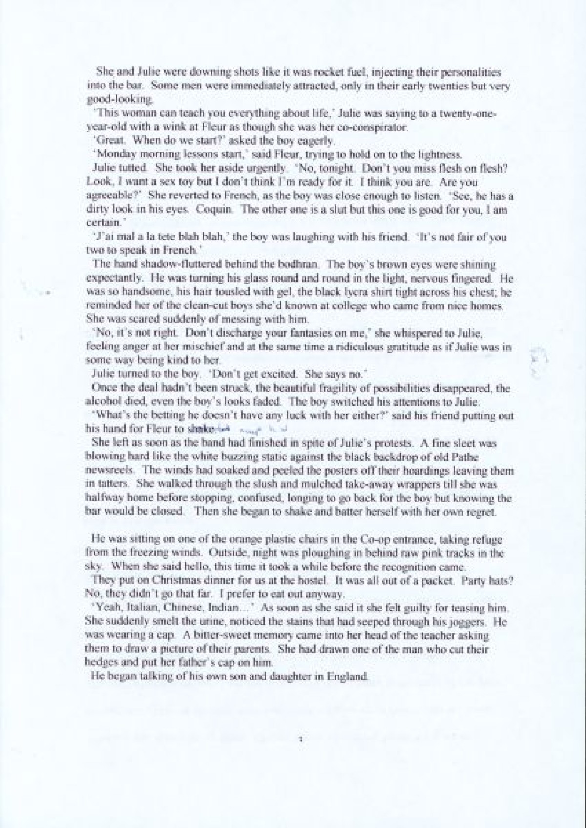 Short story, titled "Body Beautiful," written by Rosemary Jenkinson, about a woman's experiences in a lingerie shop and her relationship with a homeless man on the streets. Includes a page of handwritten notes.