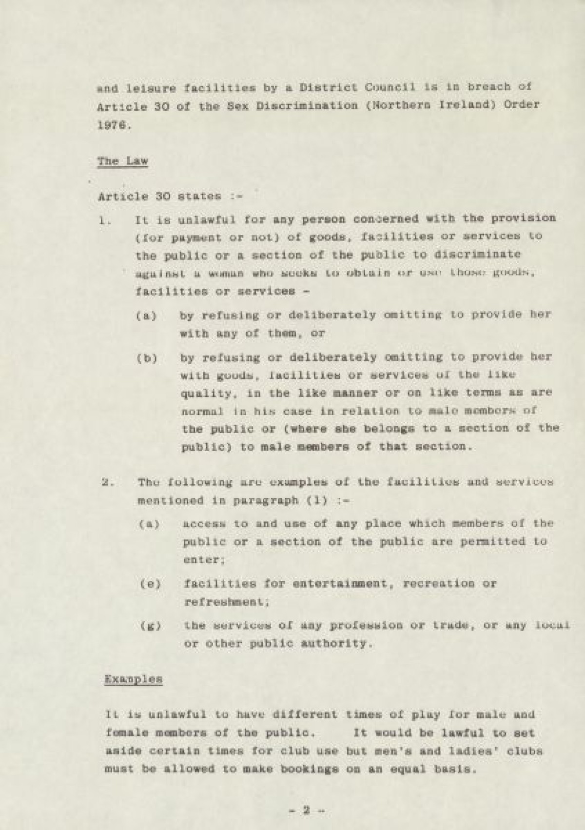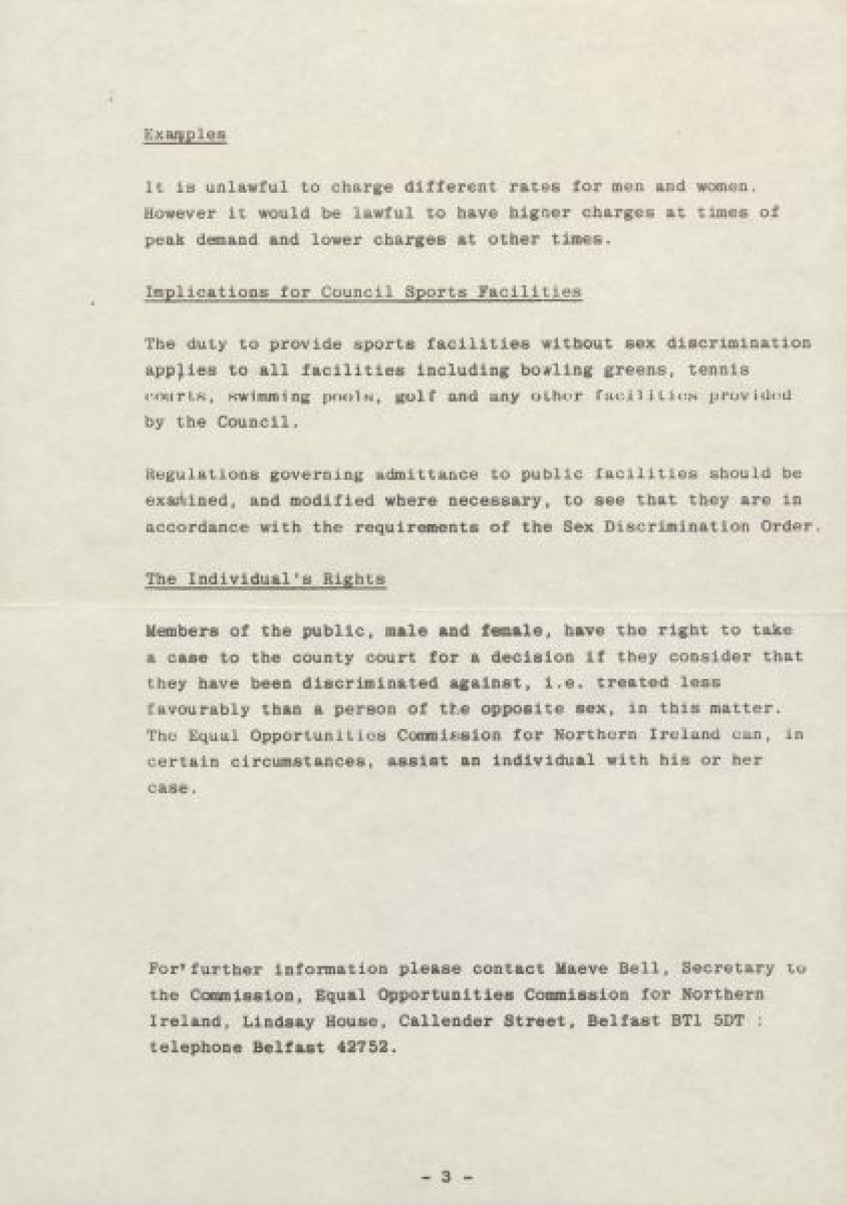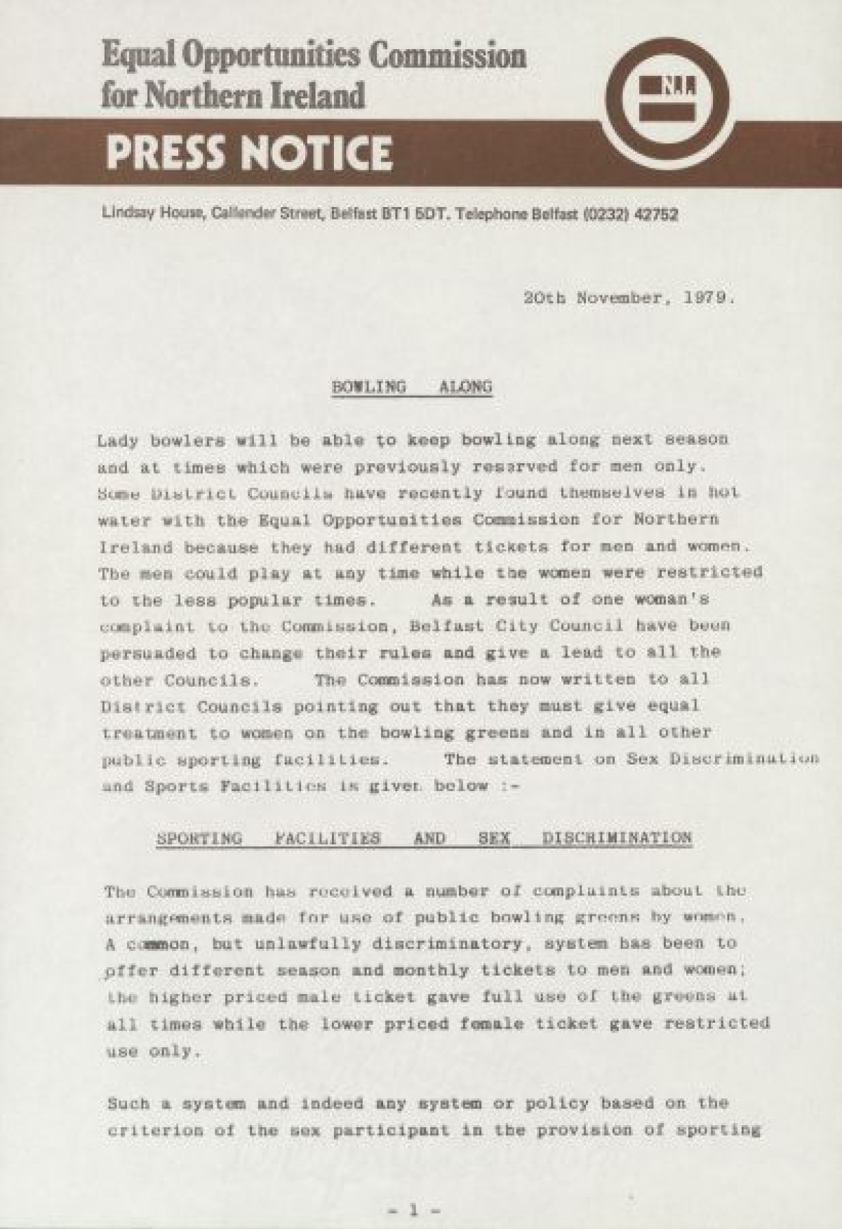 Equal Opportunities Commission for Northern Ireland, regarding discrimination against women bowlers. Contains a statement from the