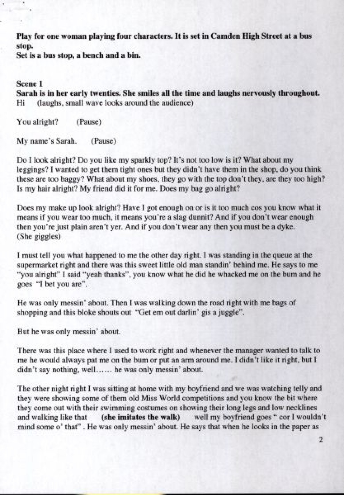 Sole Purpose Productions. 'Camden Tales,' revolves around the experiences of four women from diverse backgrounds, waiting at a bus stop. Contains dialogue and stage directions. Full script available at the Linen Hall Library.