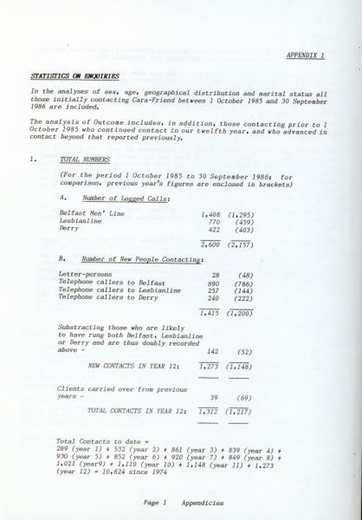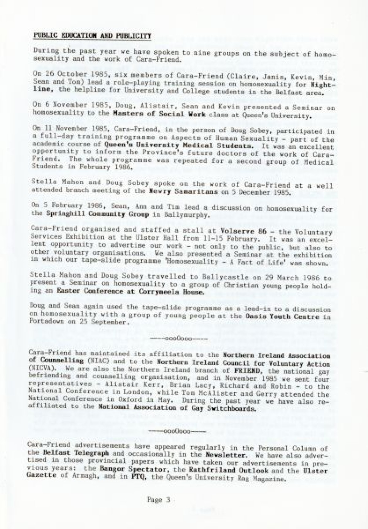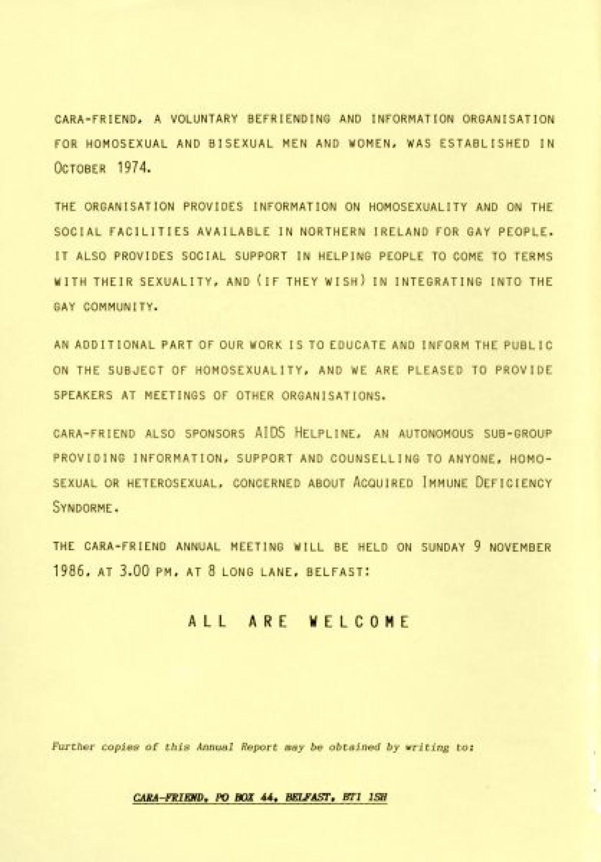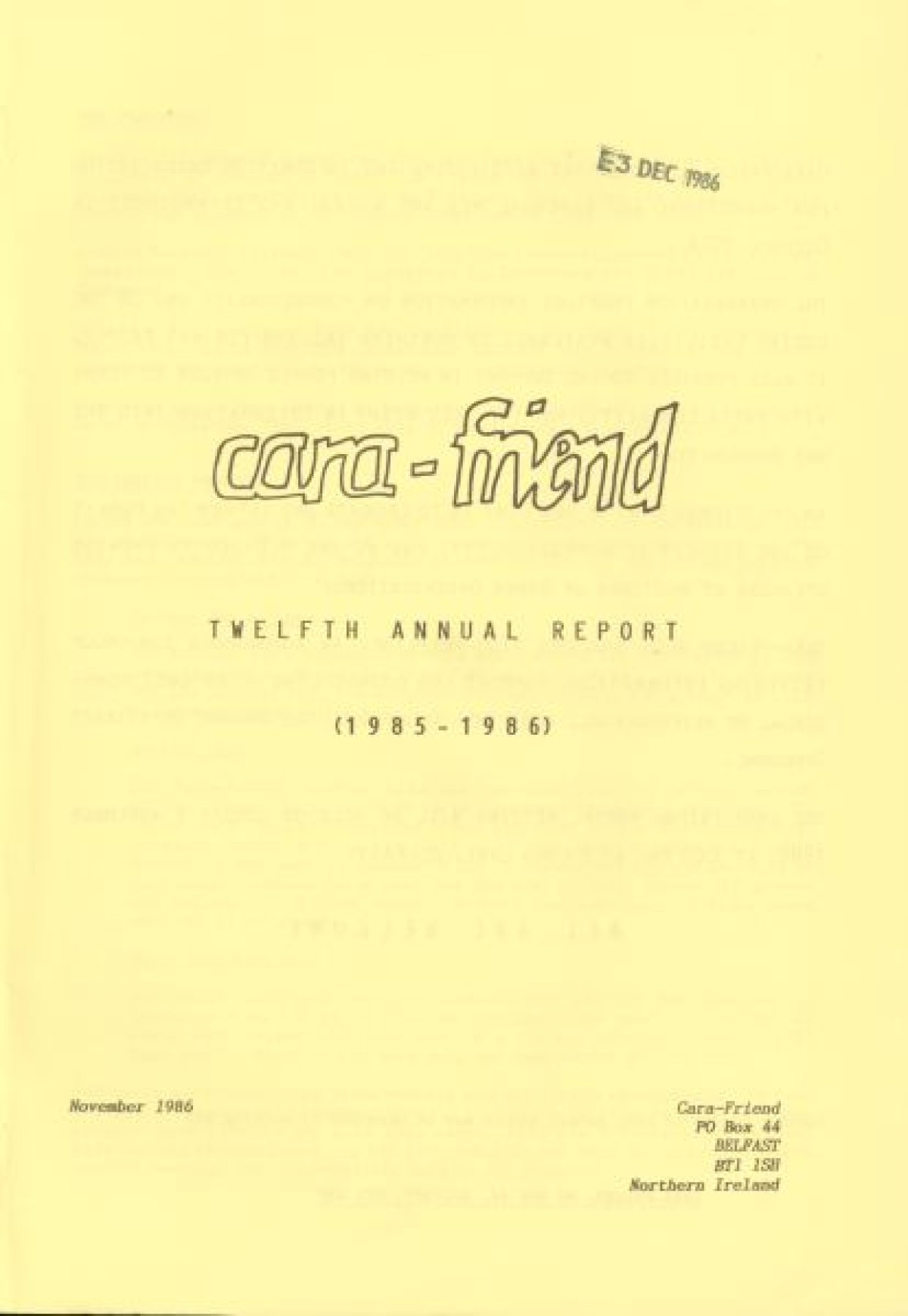 Cara Friend's Twelfth Annual Report for 1985-1986. The report includes information on services provided by the organisation (Belfast Men's Line, Lesbian Line and Derry Telephone Line), and statistics published on how the services are being used. The report also features sections on 'Public Education and Publicity', 'Finance and Premises', 'The Police and Victimless Crimes' and 'AIDS and the AIDS Helpline', as well as a financial breakdown of costings for the year.