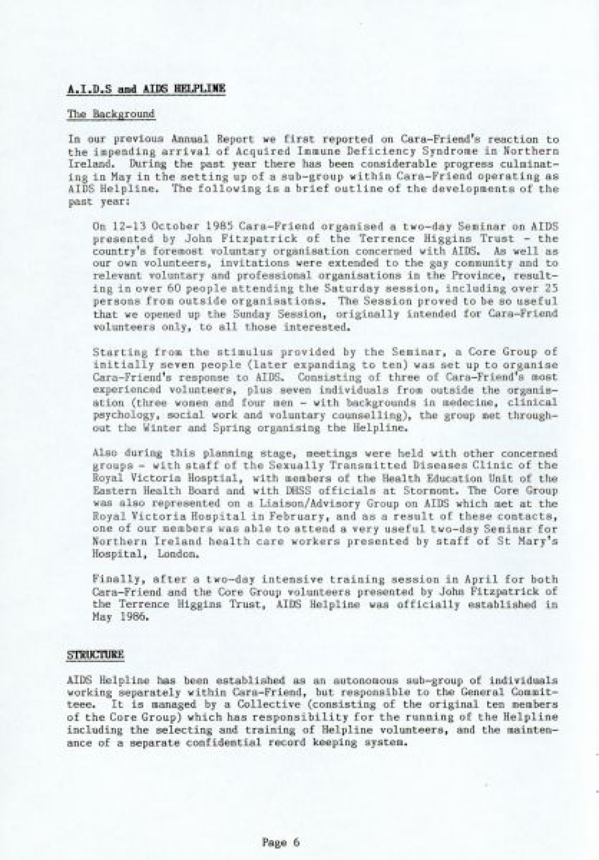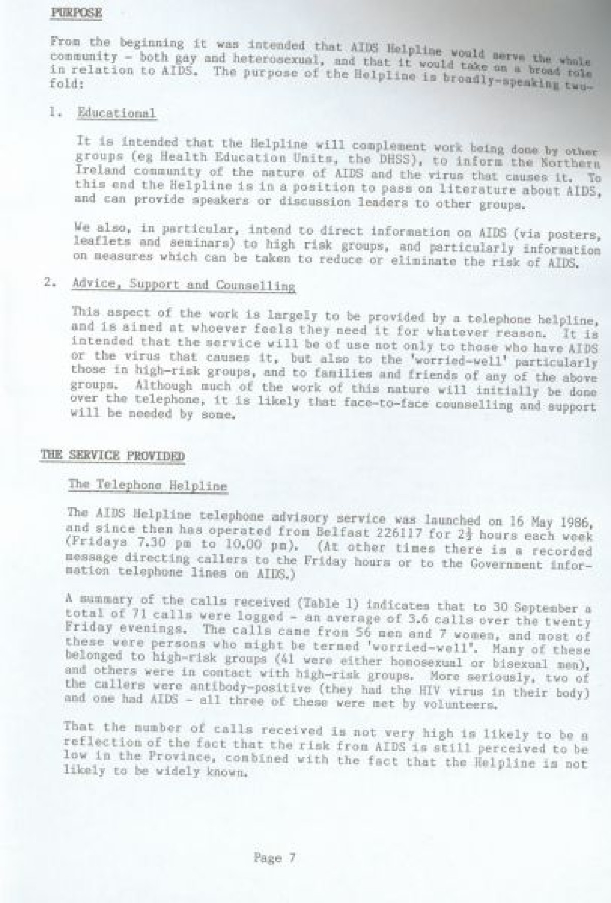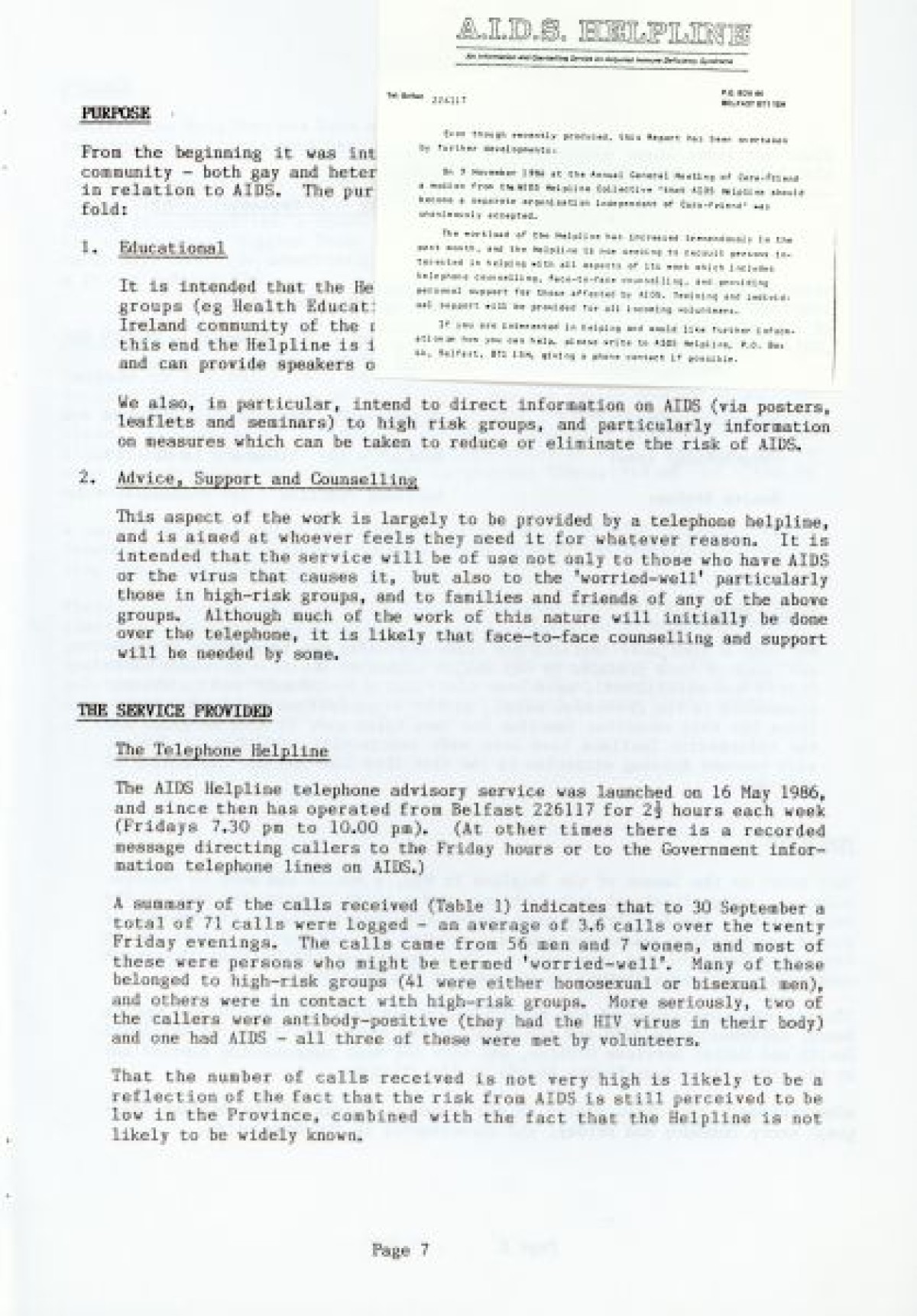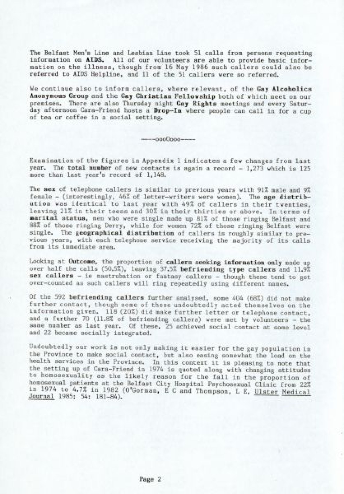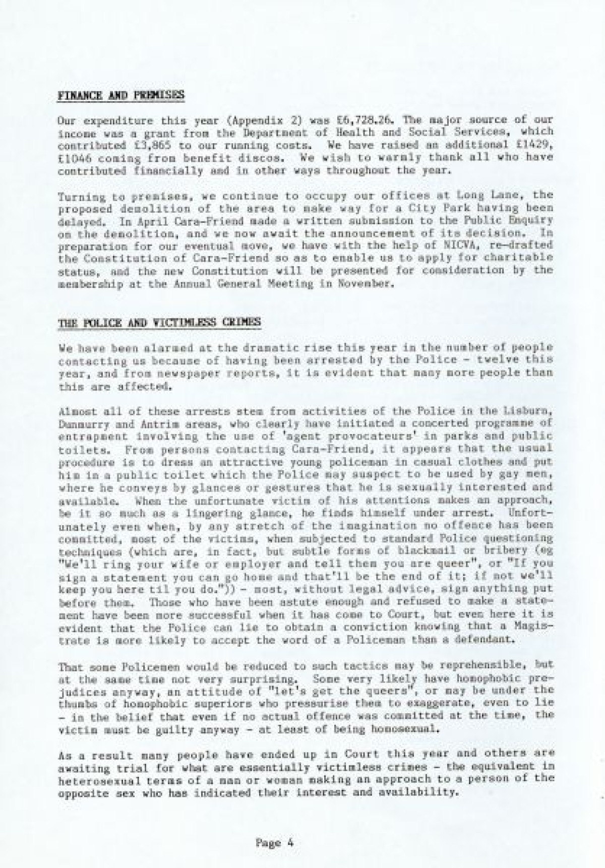 Cara Friend's Twelfth Annual Report for 1985-1986. The report includes information on services provided by the organisation (Belfast Men's Line, Lesbian Line and Derry Telephone Line), and statistics published on how the services are being used. The report also features sections on 'Public Education and Publicity', 'Finance and Premises', 'The Police and Victimless Crimes' and 'AIDS and the AIDS Helpline', as well as a financial breakdown of costings for the year.