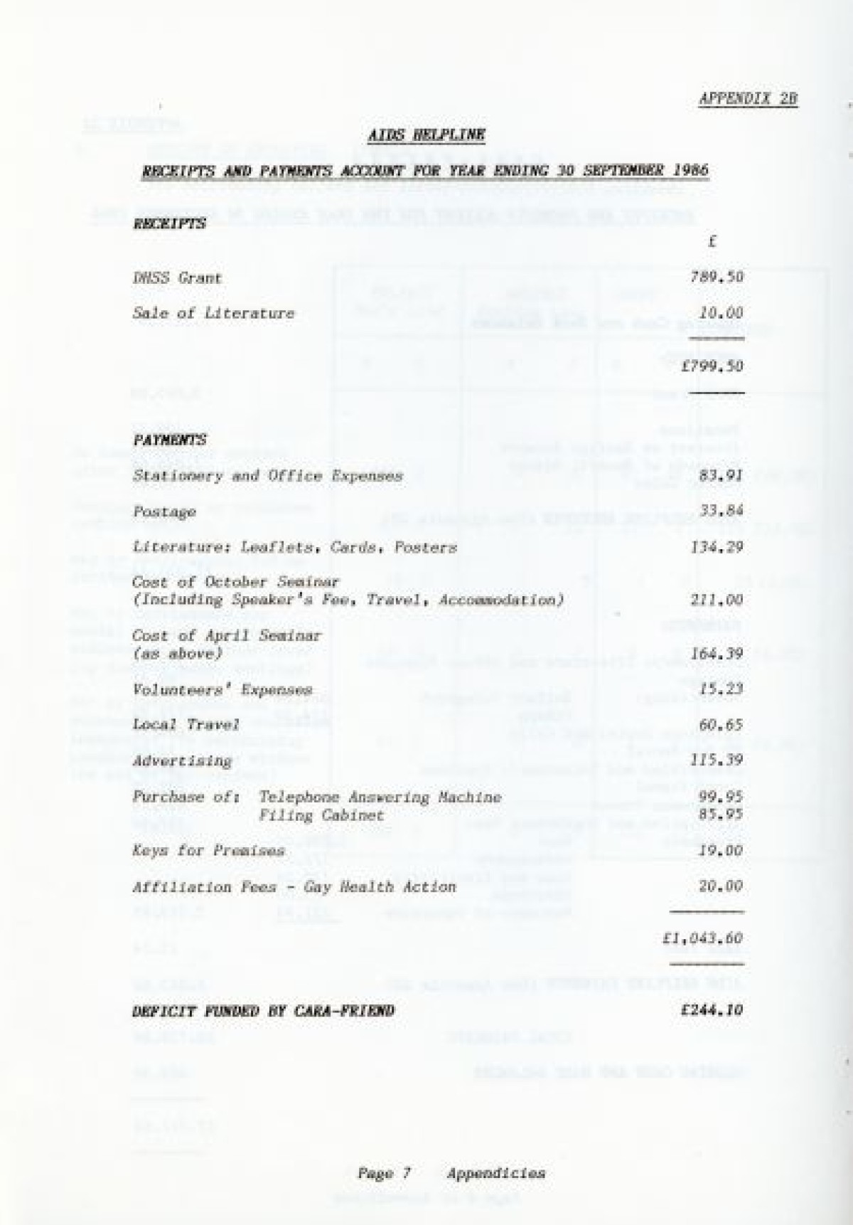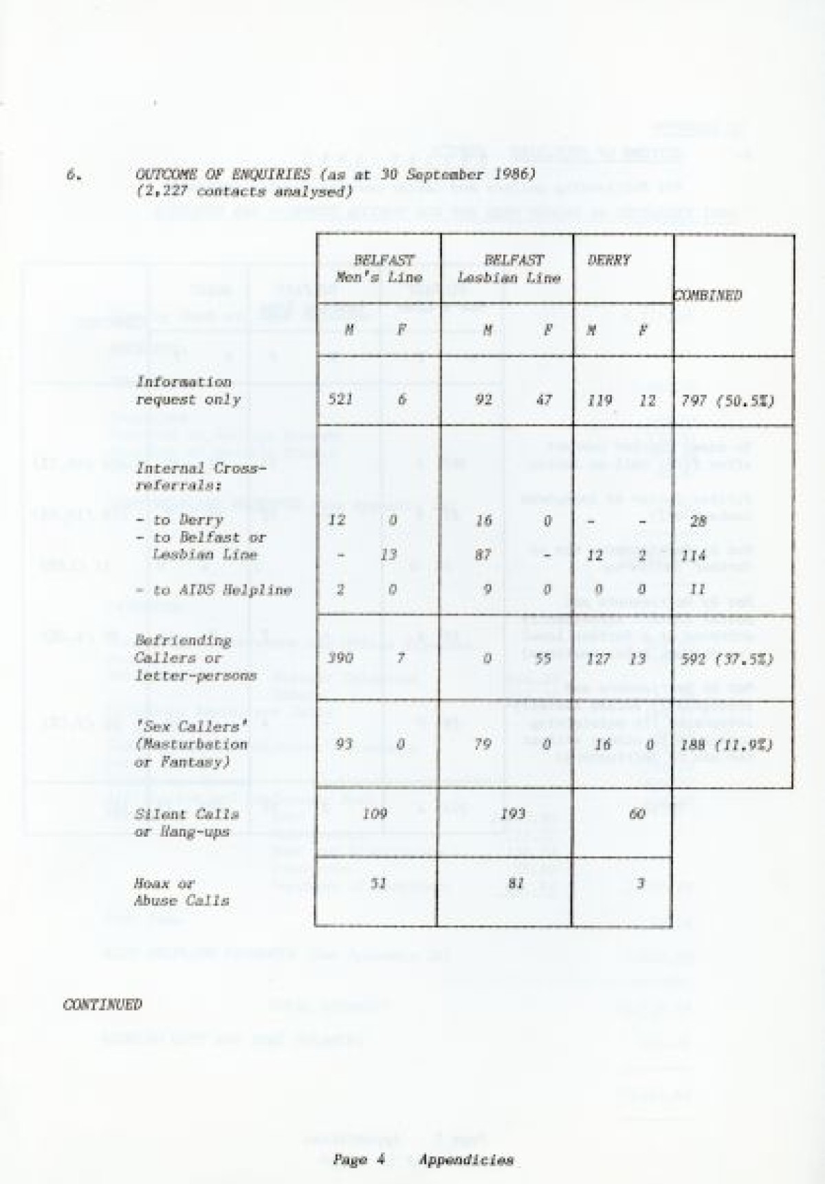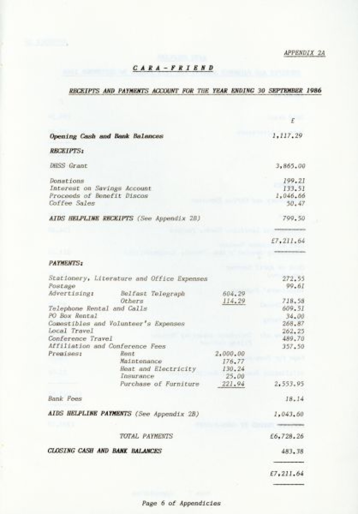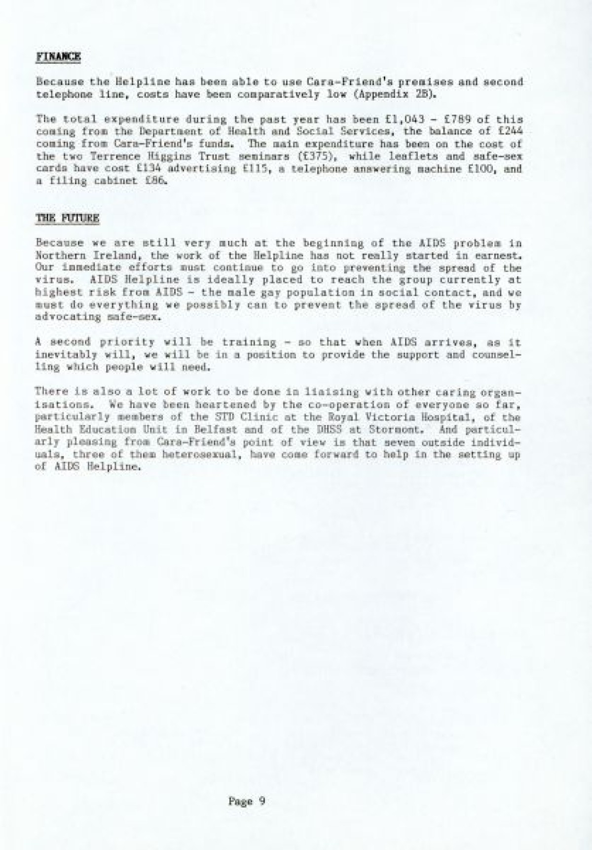 Cara Friend's Twelfth Annual Report for 1985-1986. The report includes information on services provided by the organisation (Belfast Men's Line, Lesbian Line and Derry Telephone Line), and statistics published on how the services are being used. The report also features sections on 'Public Education and Publicity', 'Finance and Premises', 'The Police and Victimless Crimes' and 'AIDS and the AIDS Helpline', as well as a financial breakdown of costings for the year.