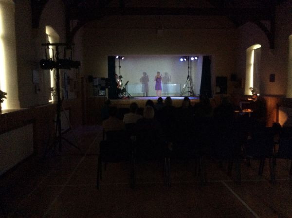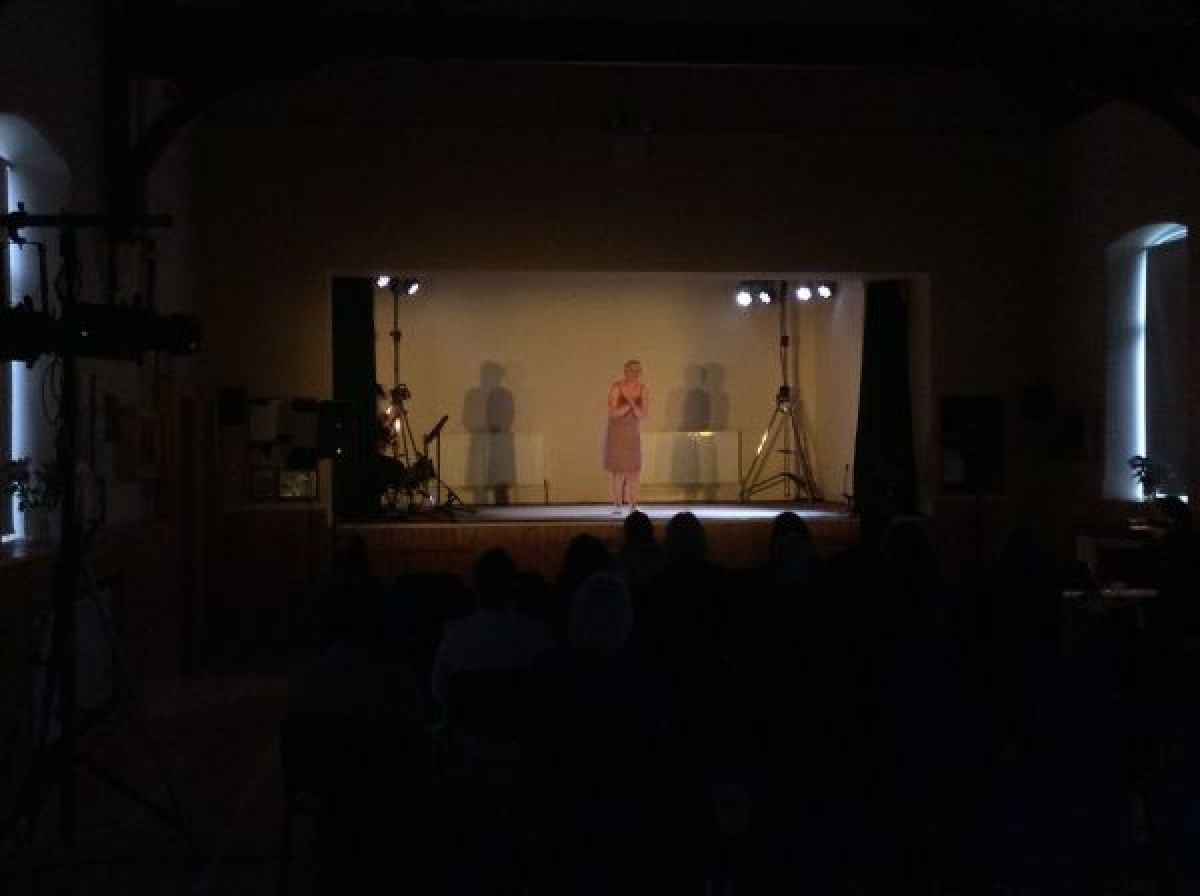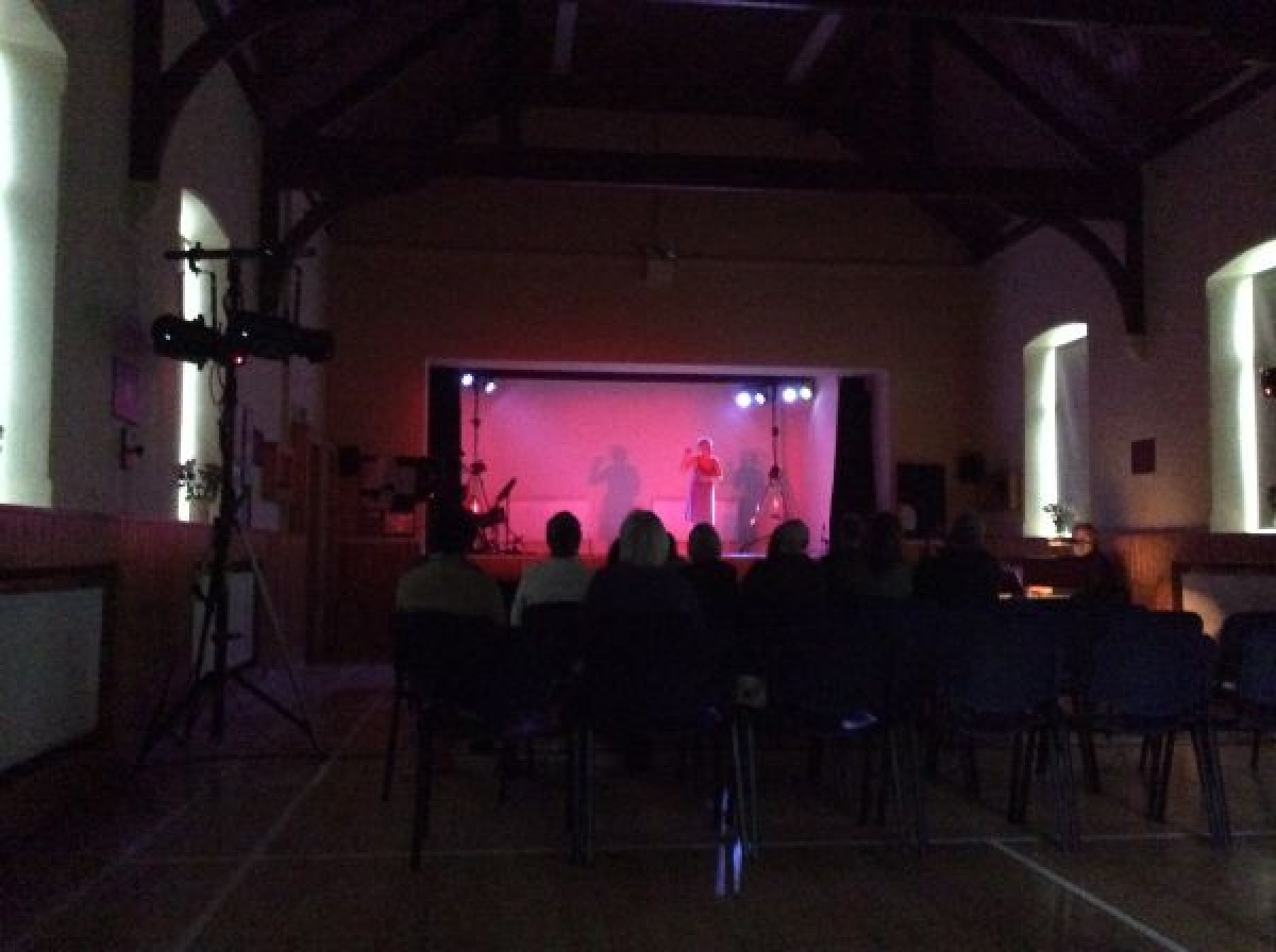 Digital photograph of Carol Moore on stage for a performance of her touring play, "The Experience of Being," in Holy Trinity Parish Hall, Dunfanaghy.