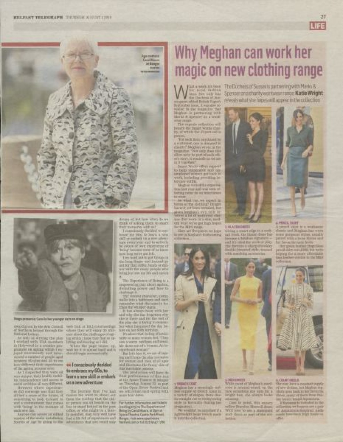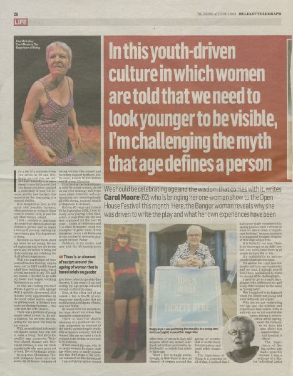 The Belfast Telegraph, about the stage play "The Experience of Being," written and performed by Carol Moore. The article discusses the inspiration for her play based on experiences of age and gender-based discrimination, and her career as an actress.