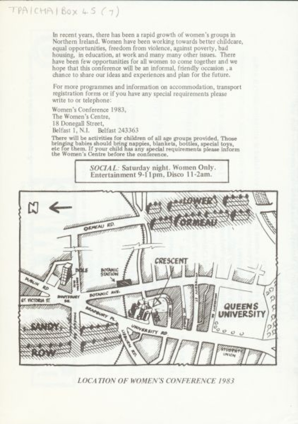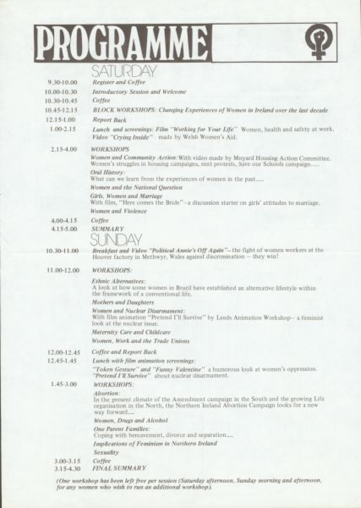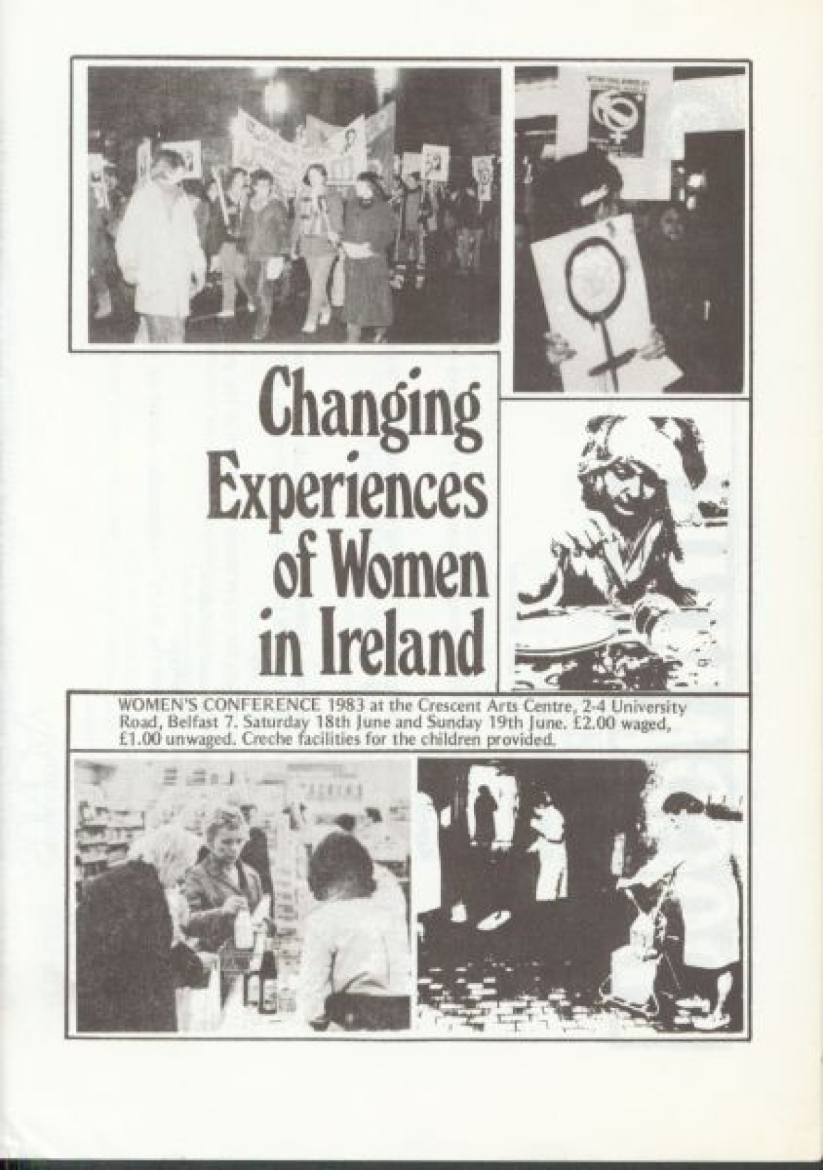 A programme and itinerary of events for the 'Changing Experiences of Women in Ireland' at the Crescent Arts Centre in Belfast between 18-19