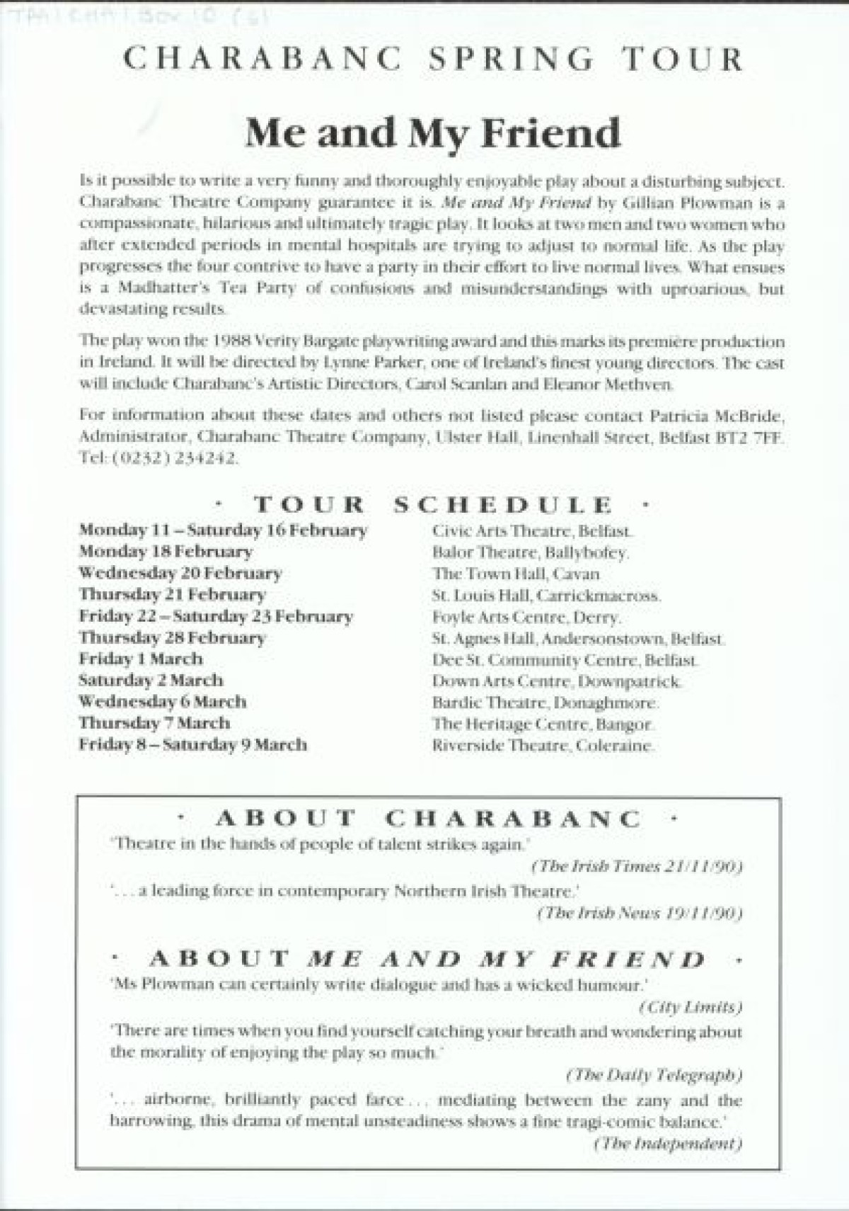 Publicity leaflet and Spring touring schedule for Gillian Plowman's award winning play 'Me and My Friend' produced by the
