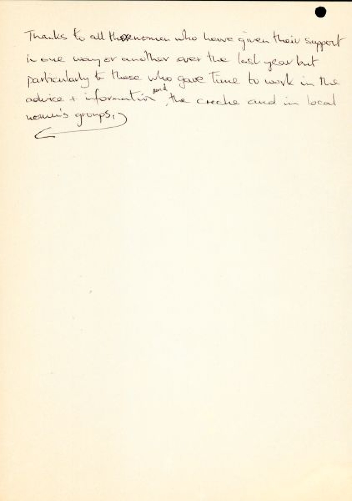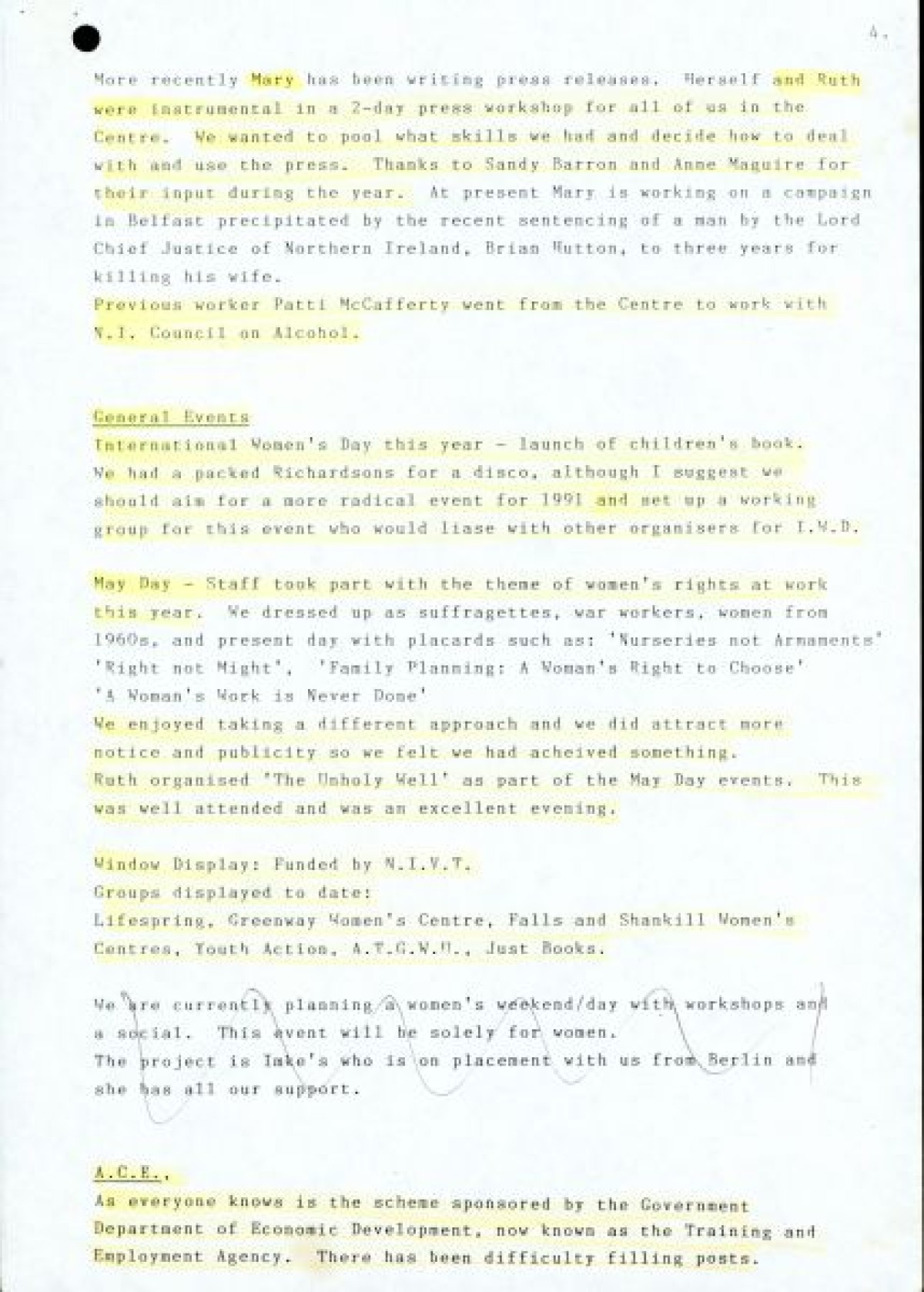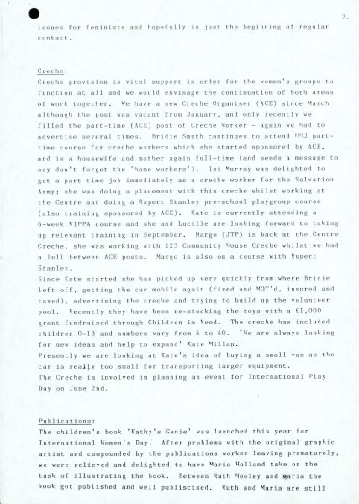 Co-ordinators report to Annual General Meeting, Women's Centre 1990. Points of discussion include Community Outreach, Creche Provision, Publications, Women's Centre 'Drop-in' advice facilities, Events, ACE (Action for Community Employment) and Training and Volunteering opportunities.