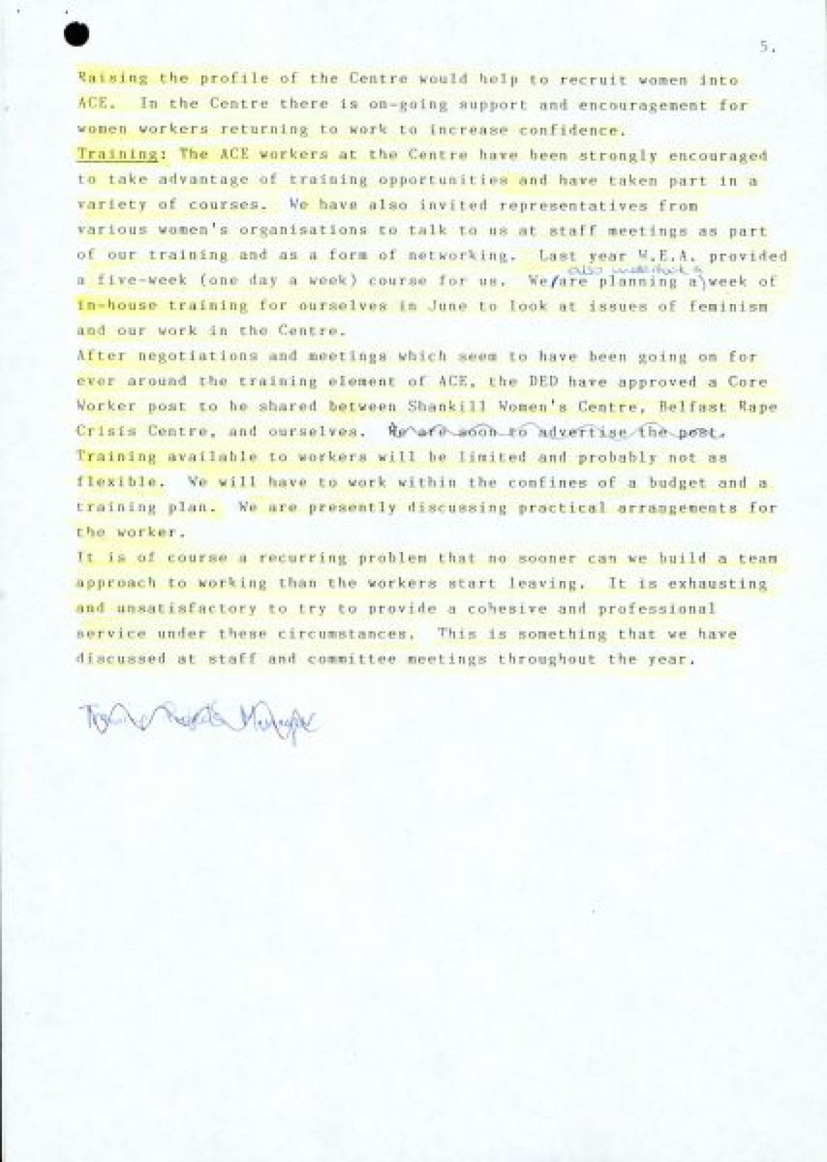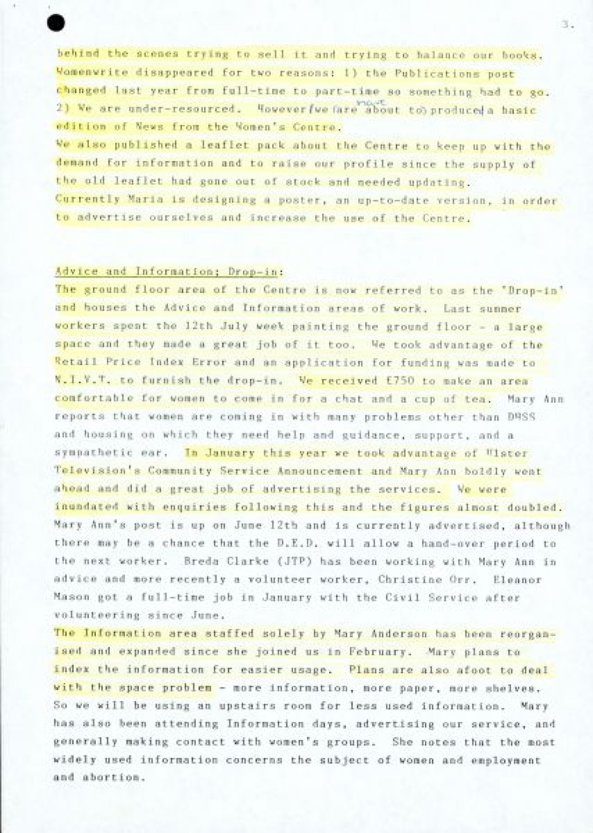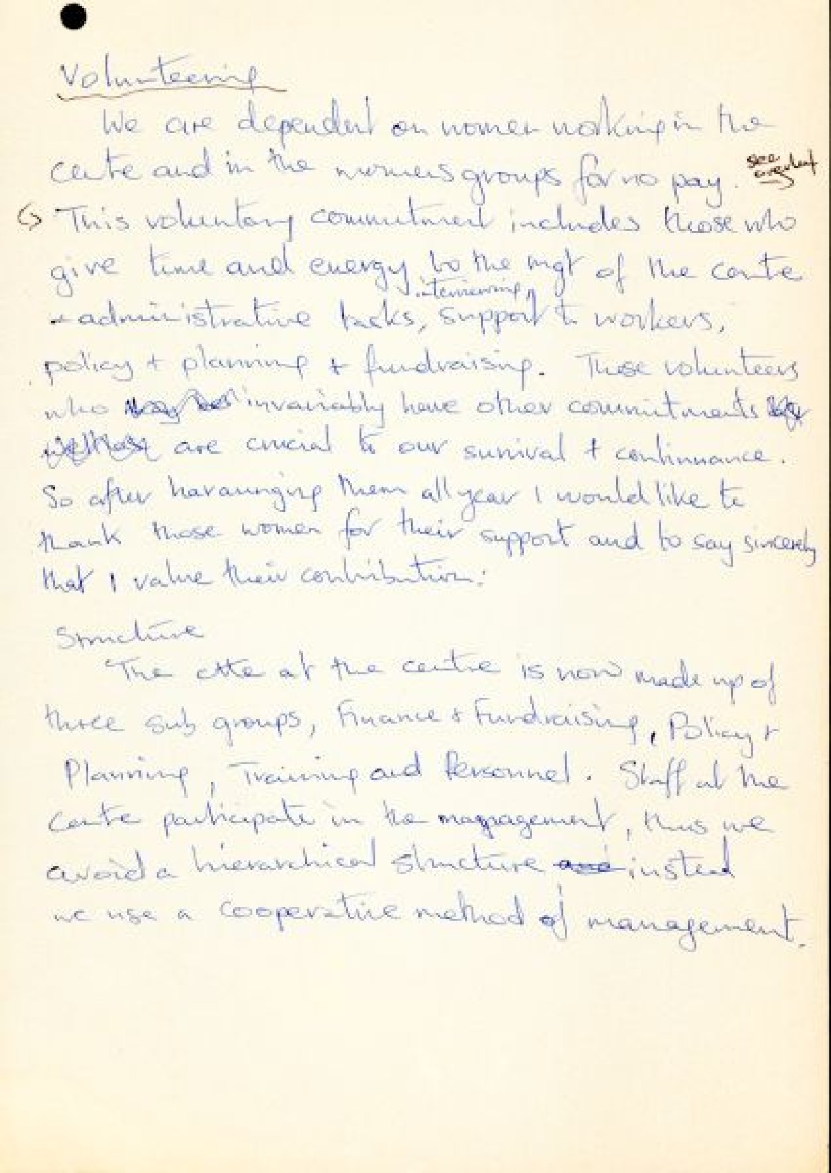 Co-ordinators report to Annual General Meeting, Women's Centre 1990. Points of discussion include Community Outreach, Creche Provision, Publications, Women's Centre 'Drop-in' advice facilities, Events, ACE (Action for Community Employment) and Training and Volunteering opportunities.