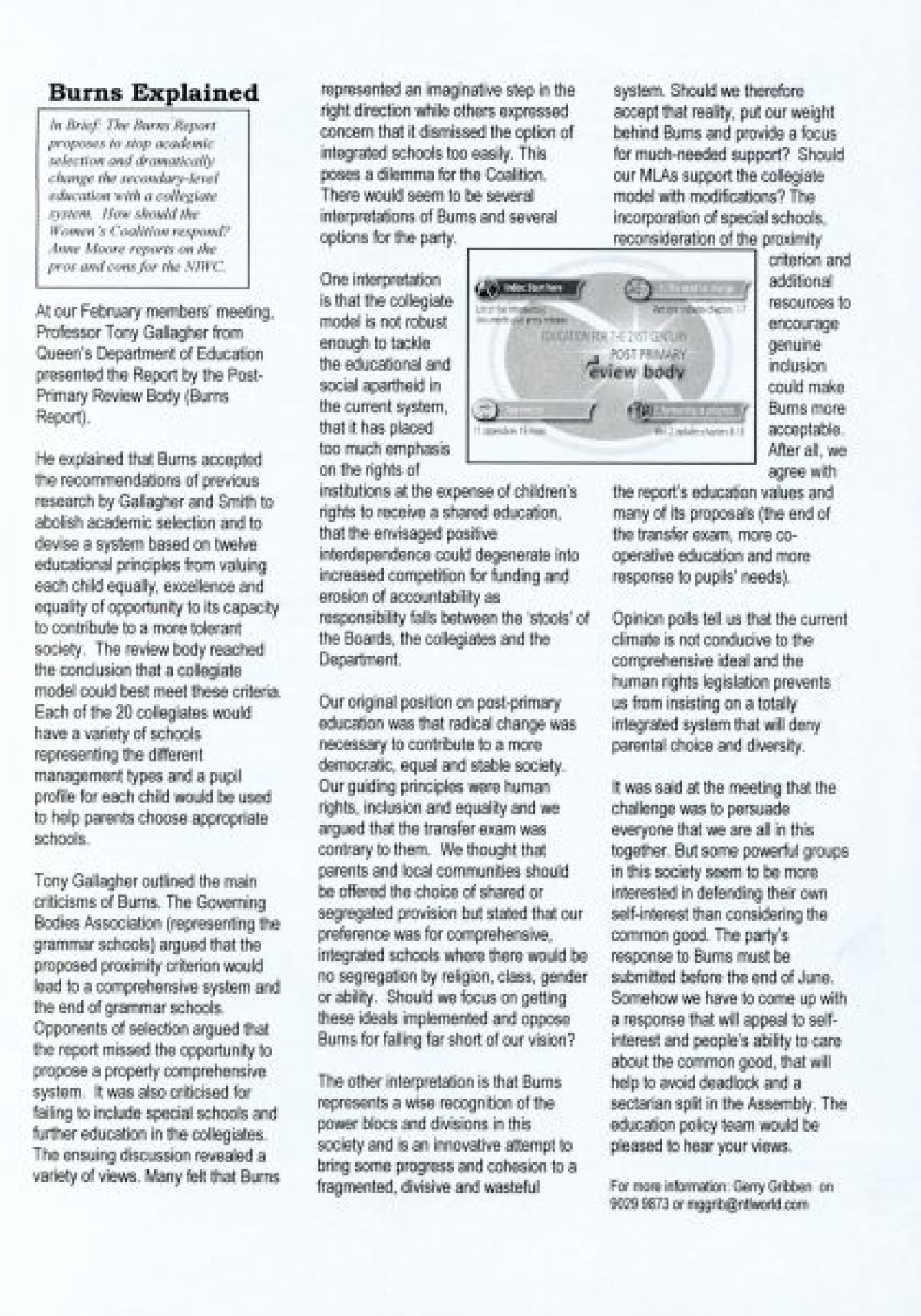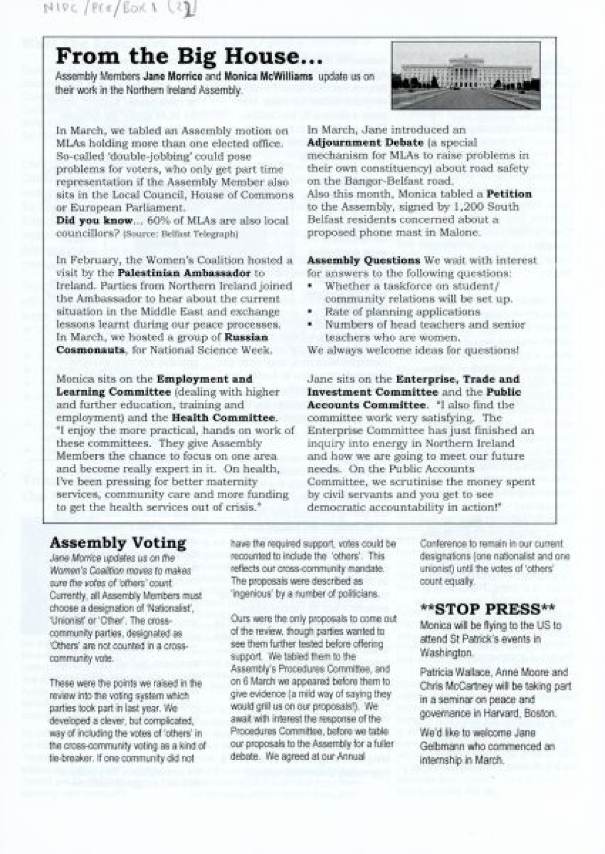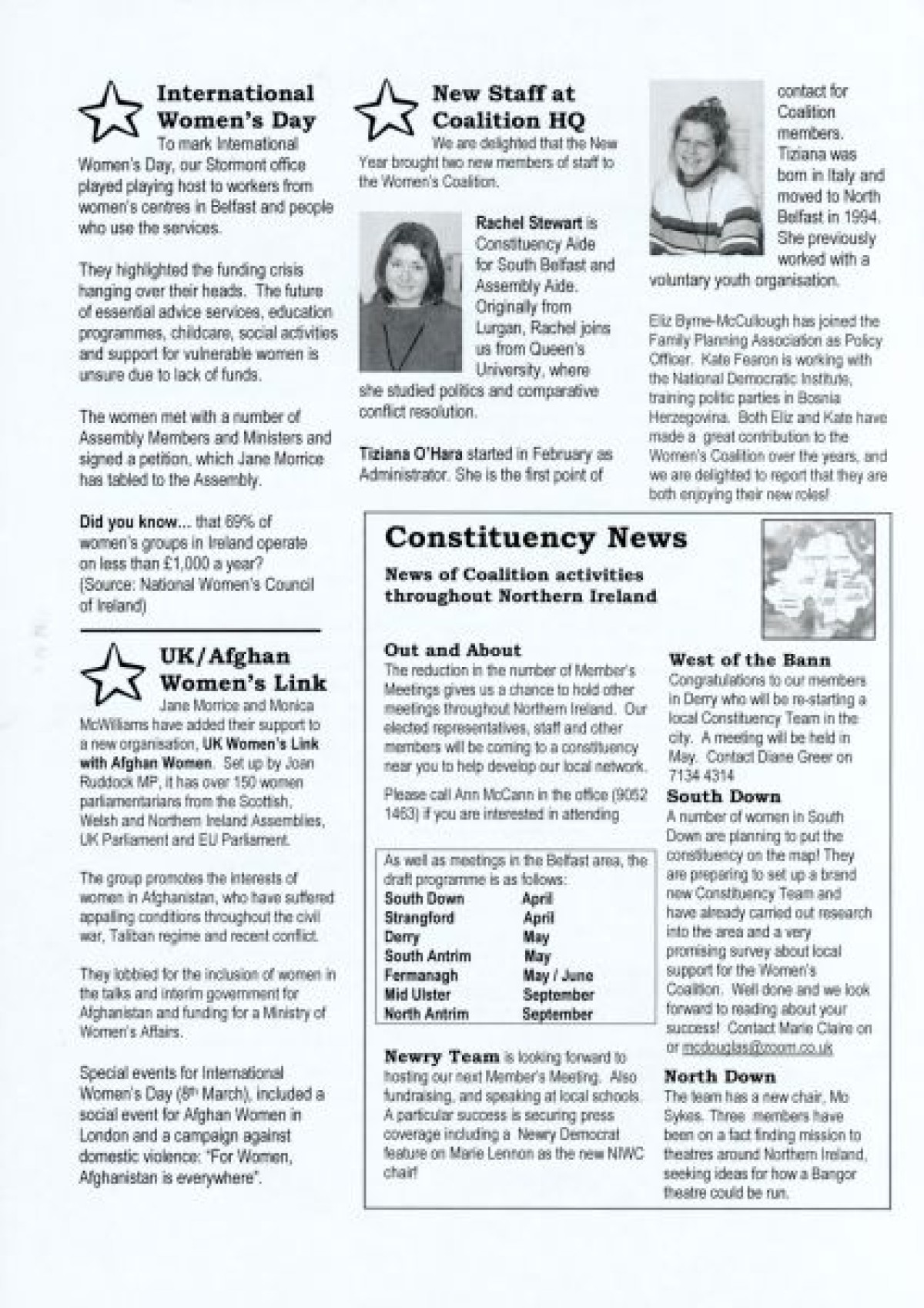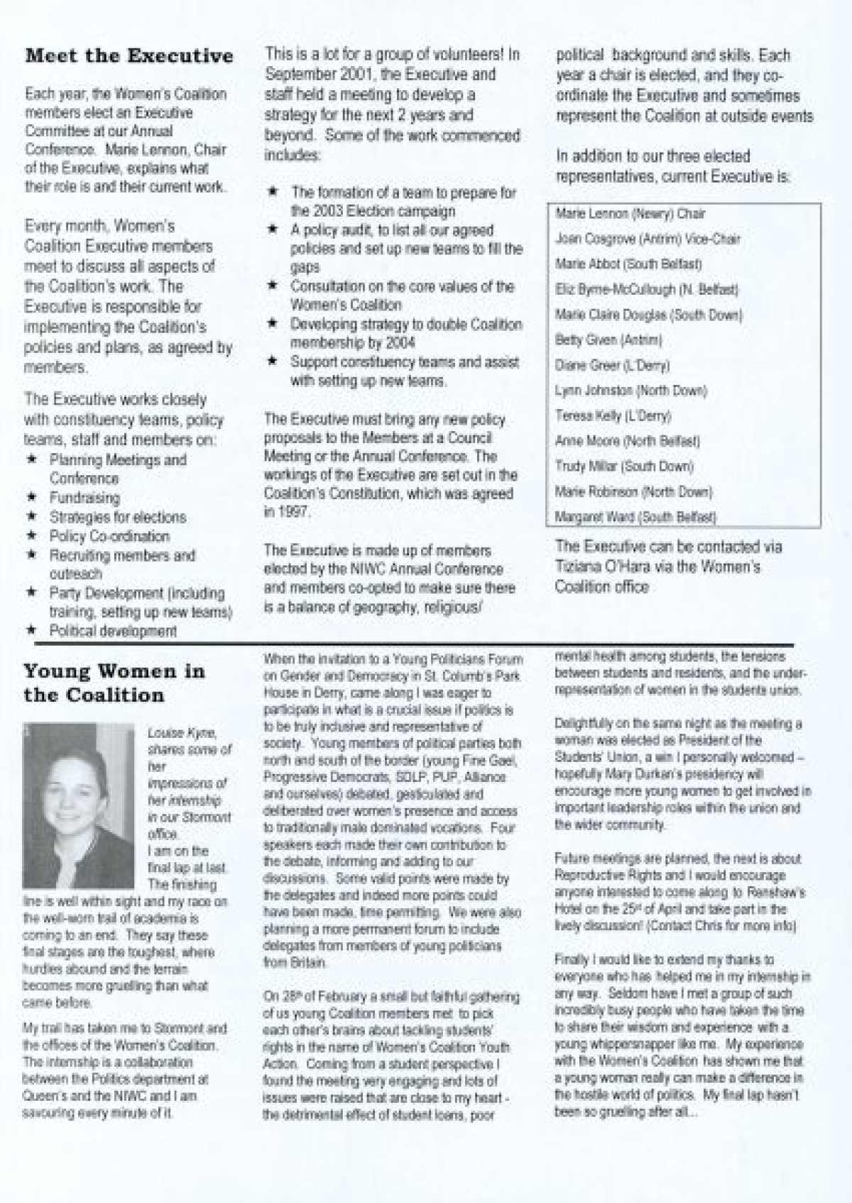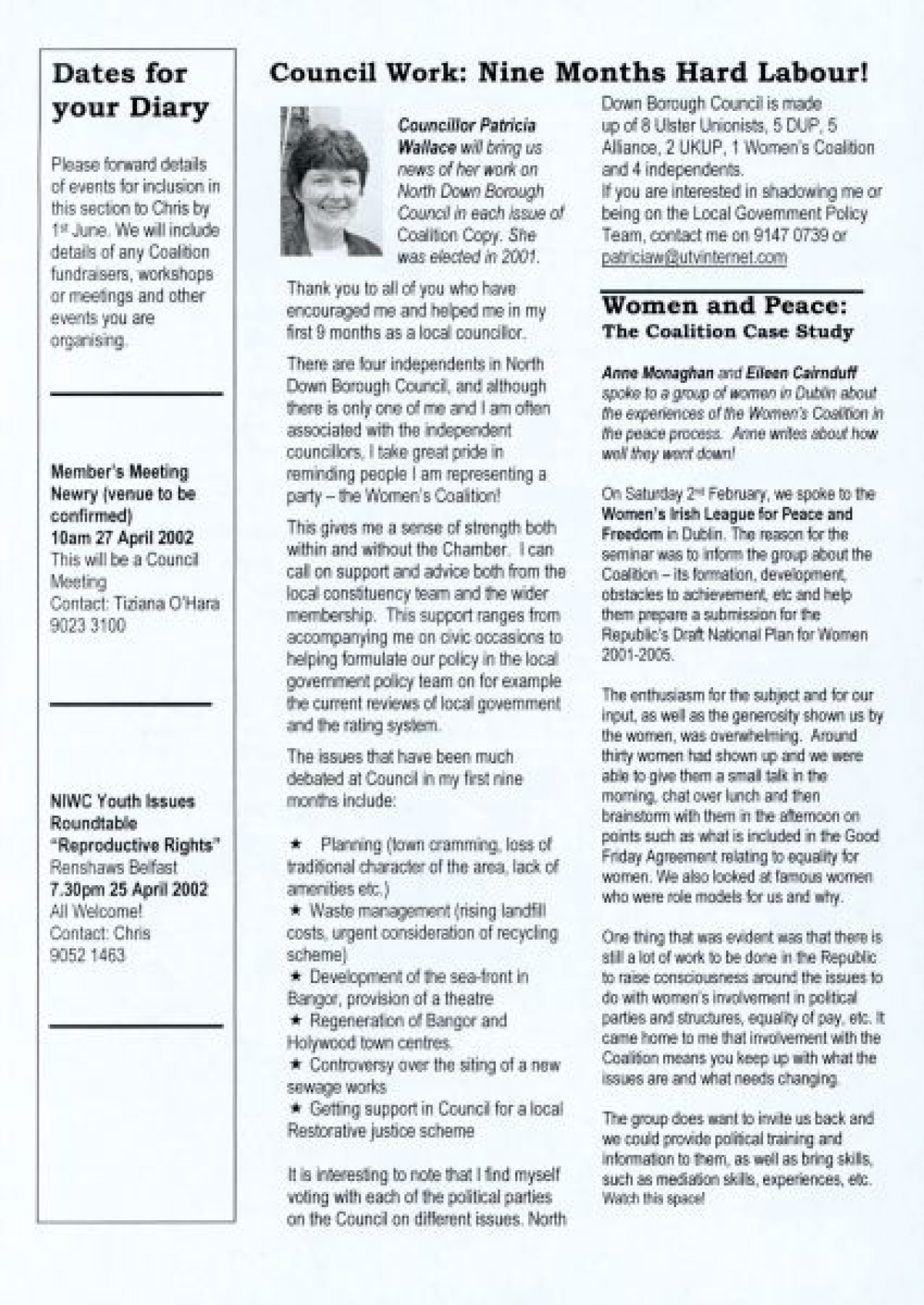 N.I. Women's Coalition, titled 'Coalition Copy', issue 1, March 2002. Discusses a visit by Mo Mowlam; Constituency News including UK/Afghan Link and International Women's Day; update about new staff members Rachel Stewart and Tiziana O'Hara; news about the North Down Borough Council from Councillor Patricia Wallace; an article about Women and Peace by Anne Monaghan; Meet the Executive feature; "Young women in the Coalition," entry by Louise Kyne about her internship experience; Policy feature about the Burns Report; and Assembly News.