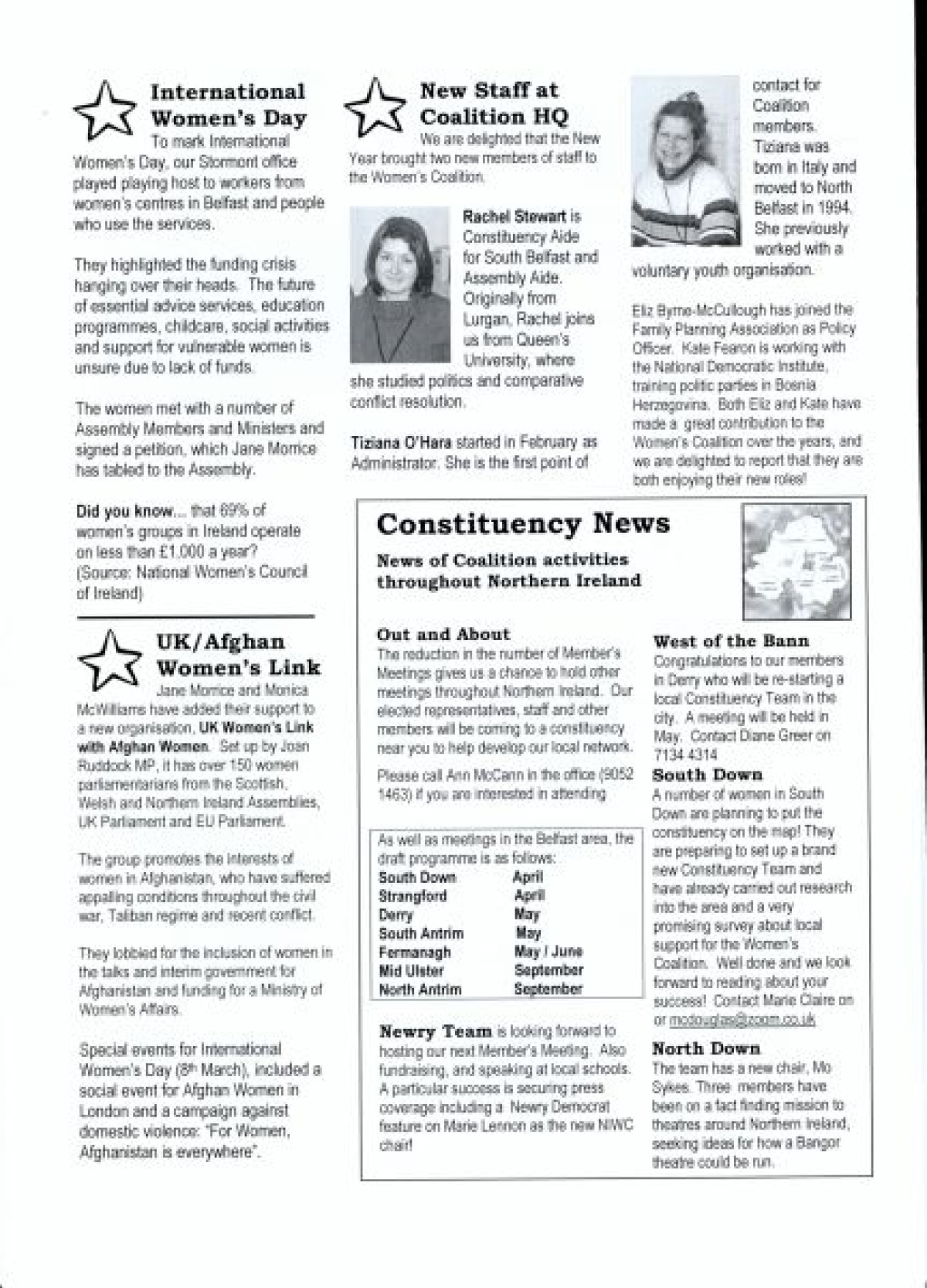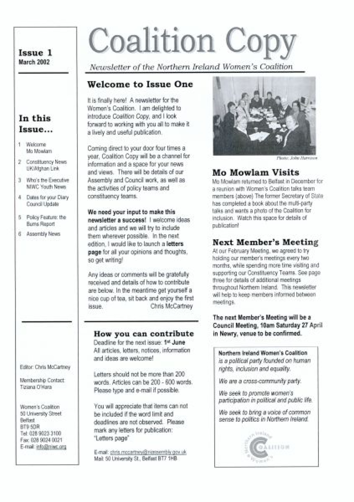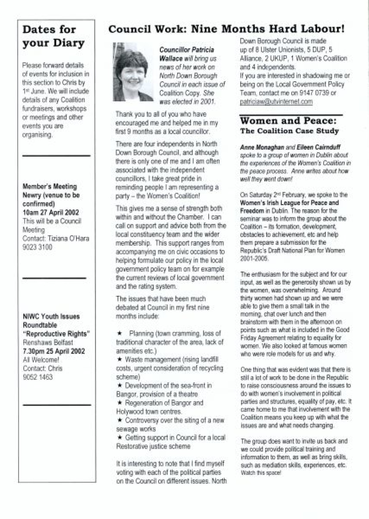 Northern Ireland Women's Coalition, March 2002. The newsletter, published four times a year, reported on the party's Assembly and Council work as well as the activities of both the policy and constituency teams across Northern Ireland.