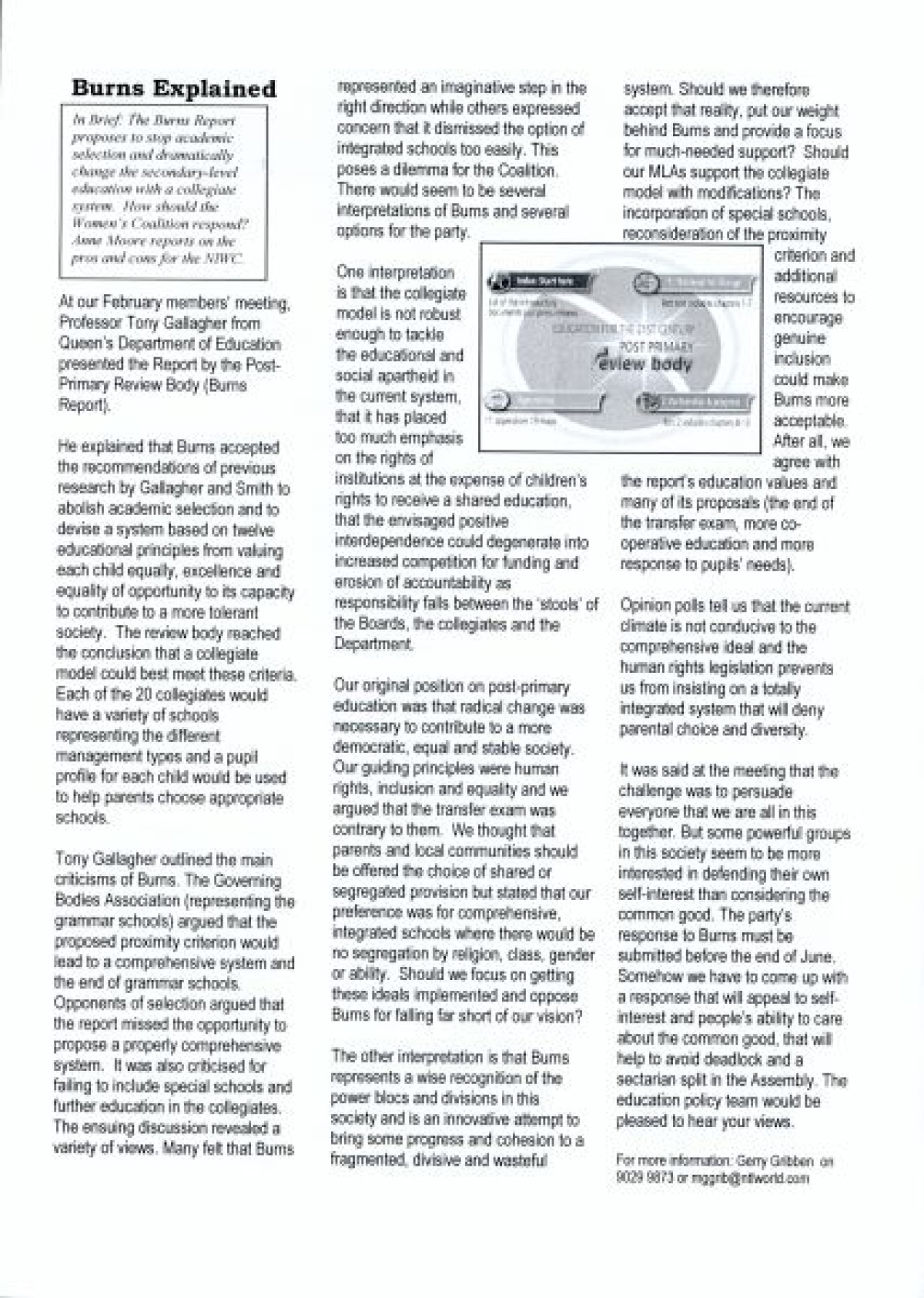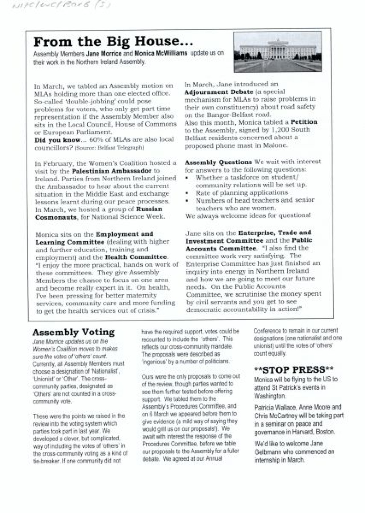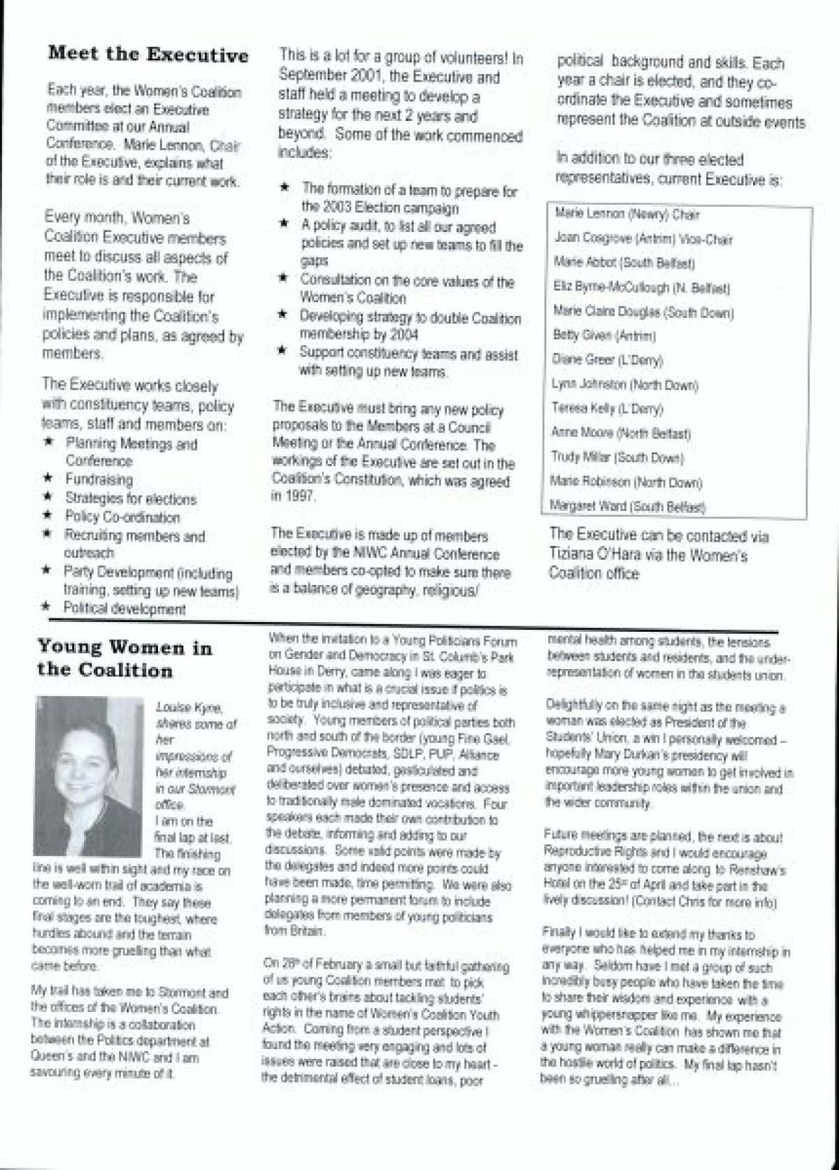 Northern Ireland Women's Coalition, March 2002. The newsletter, published four times a year, reported on the party's Assembly and Council work as well as the activities of both the policy and constituency teams across Northern Ireland.