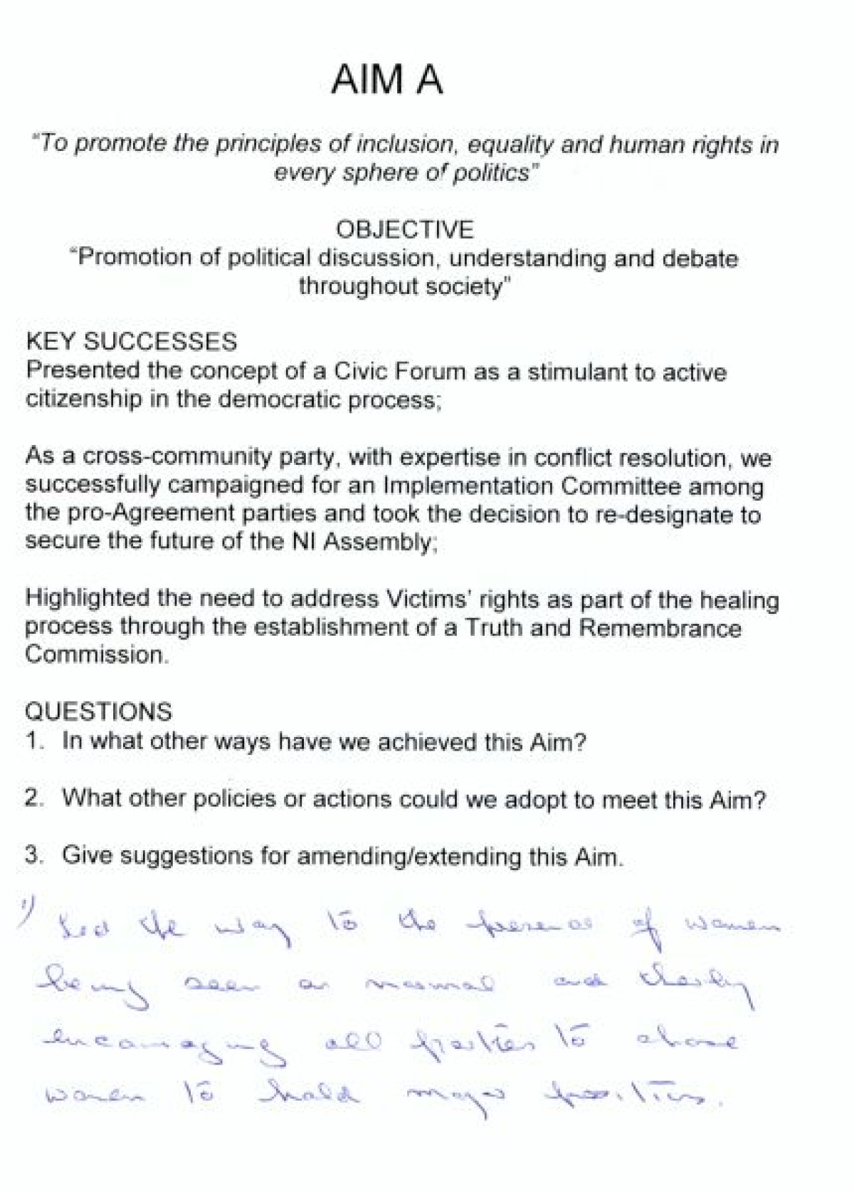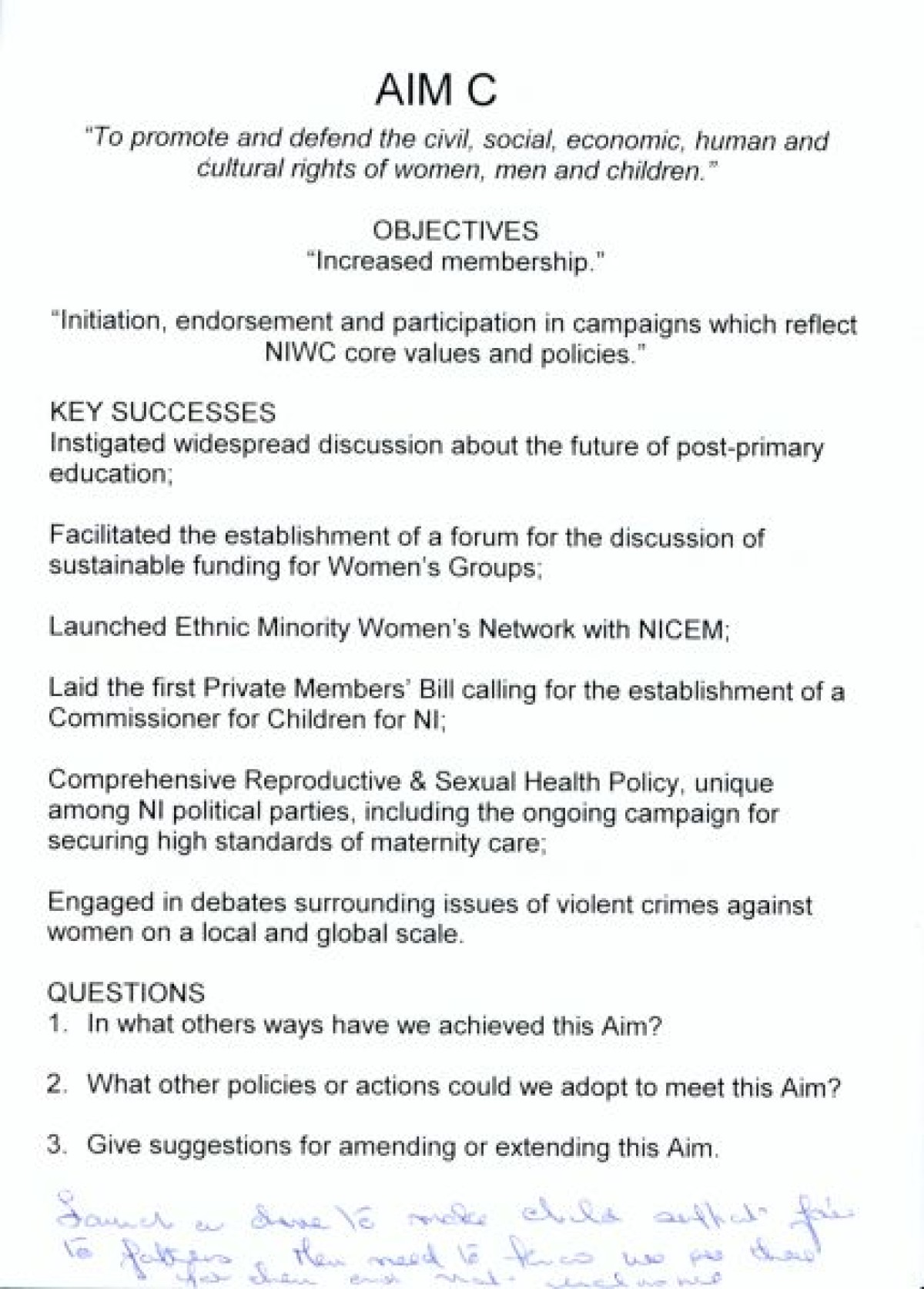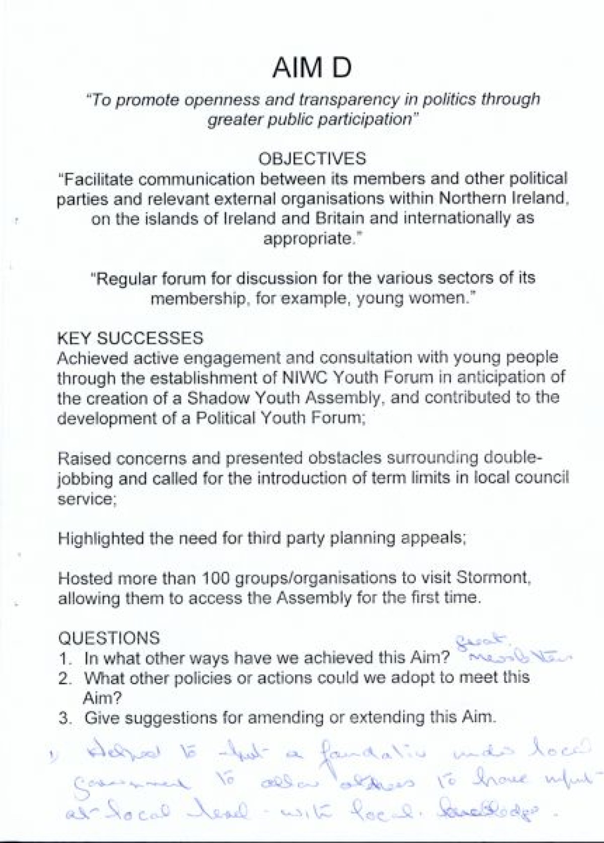 Northern Ireland Women's Coalition aims and objectives. Outlines aims to promote inclusion, equality and human rights; participation of women in politics; civil, social, human, economic, and cultural rights; and promote transparency in politics. Identifies key successes and questions, including "Big Questions" with annotations in blue biro. Review conducted by: Marie Abbott, Joan Cosgrove, Elizabeth Byrne McCullough, Sheila Fairon, Marie Lennon, Anne Moore, Tiziana O’Hara, Laurie Roberts, and Carmel Roulston.