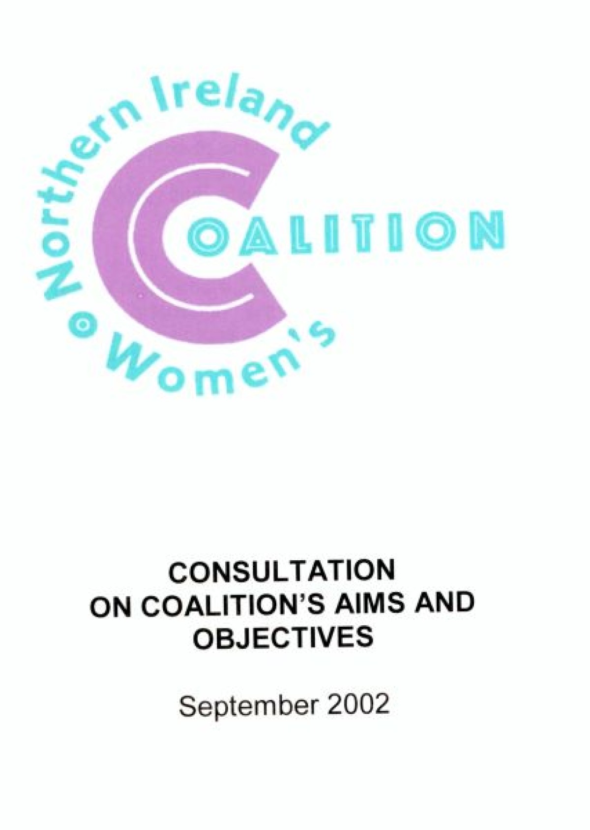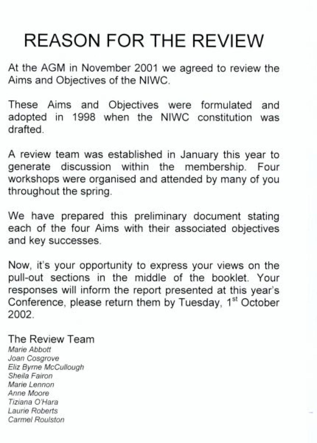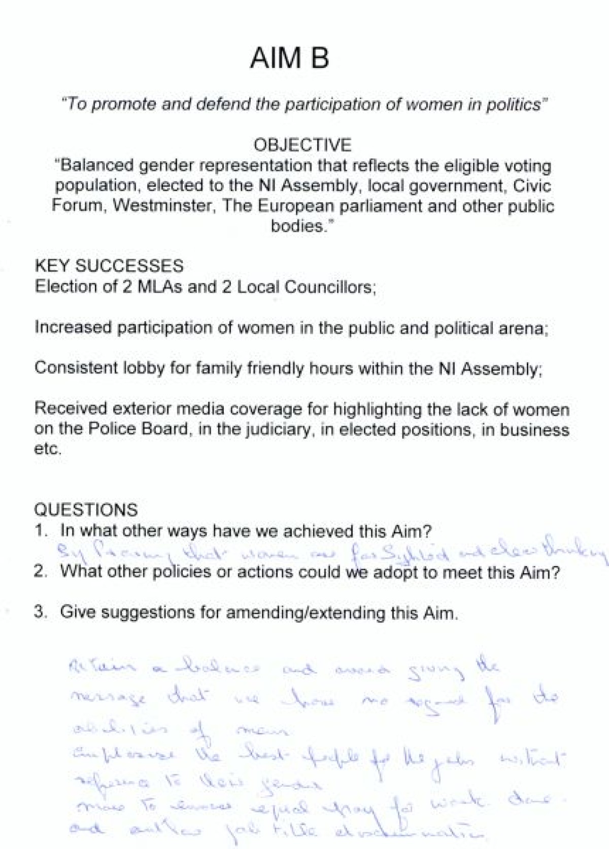 Northern Ireland Women's Coalition aims and objectives. Outlines aims to promote inclusion, equality and human rights; participation of women in politics; civil, social, human, economic, and cultural rights; and promote transparency in politics. Identifies key successes and questions, including "Big Questions" with annotations in blue biro. Review conducted by: Marie Abbott, Joan Cosgrove, Elizabeth Byrne McCullough, Sheila Fairon, Marie Lennon, Anne Moore, Tiziana O’Hara, Laurie Roberts, and Carmel Roulston.