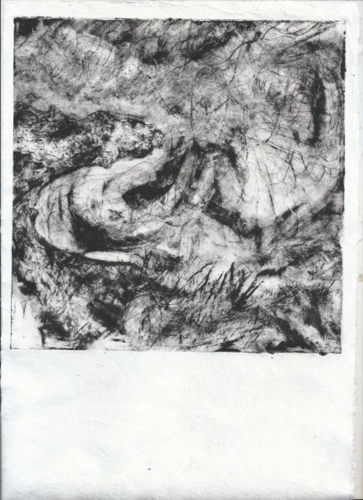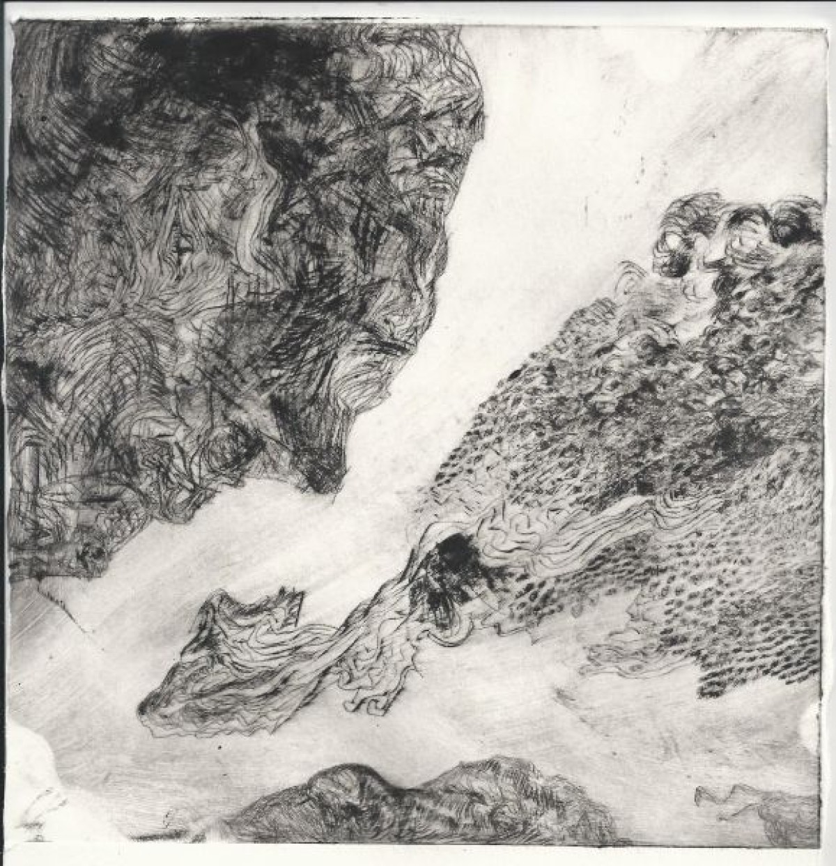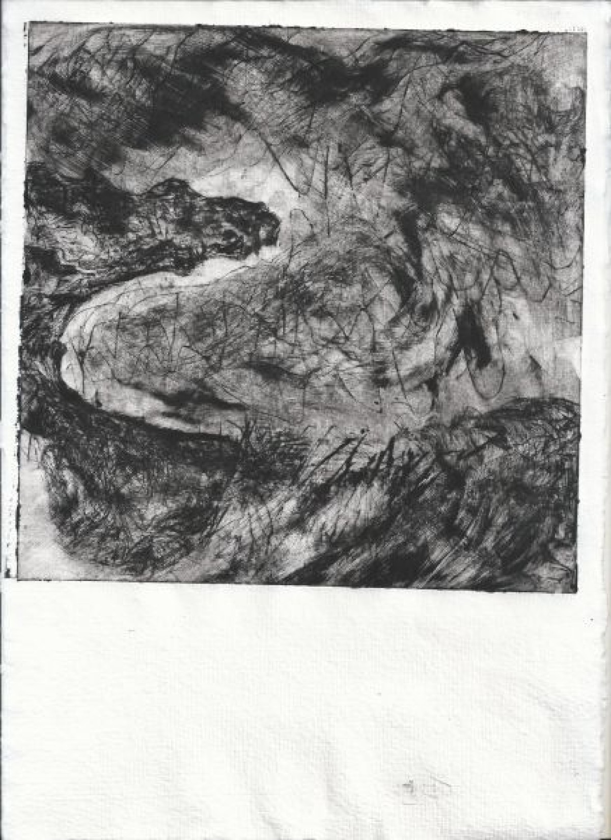 A selection of digital photographs of copper plate etching pieces by Keike Twisselmann, completed during a Covid-19 lockdown in Berlin in 2020, titled 'der helle fluss', 'der helle fluss 2', 'benburbia4' and 'benburbia1'.