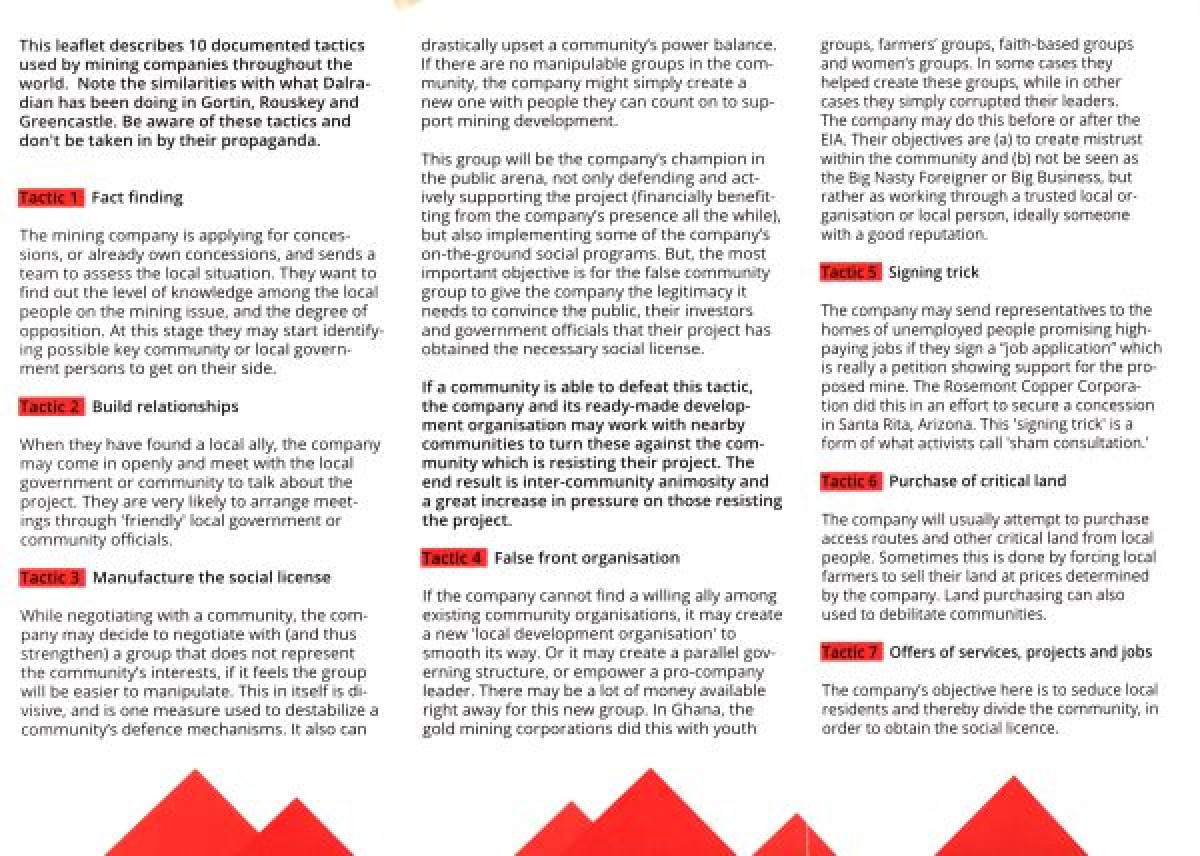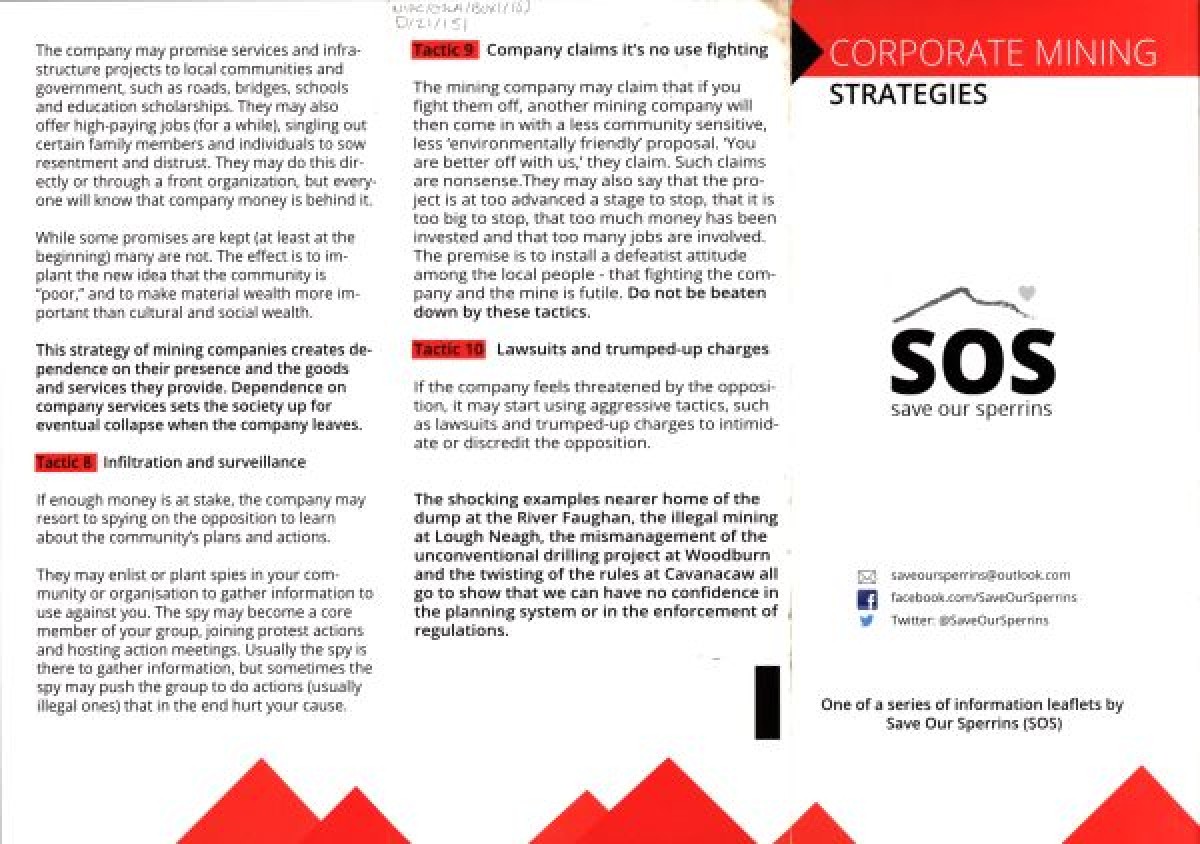 Save Our Sperrins campaign, outlining 10 tactics used by mining companies to obtain permissions for building mines.