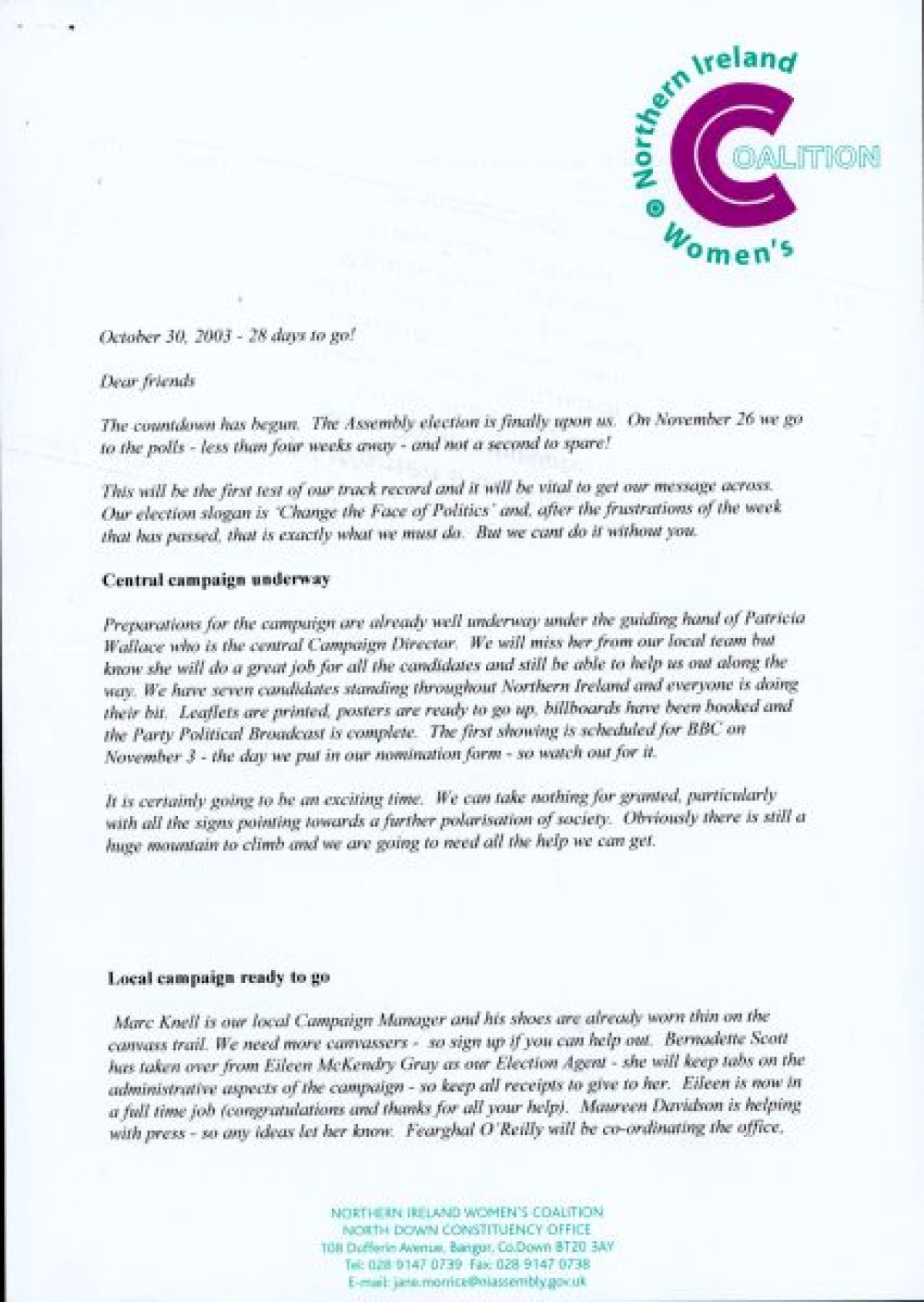 Northern Ireland Women's Coalition regarding the upcoming Assembly Election on November 26