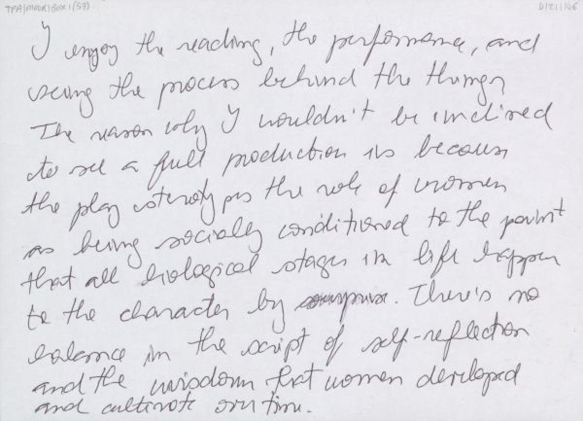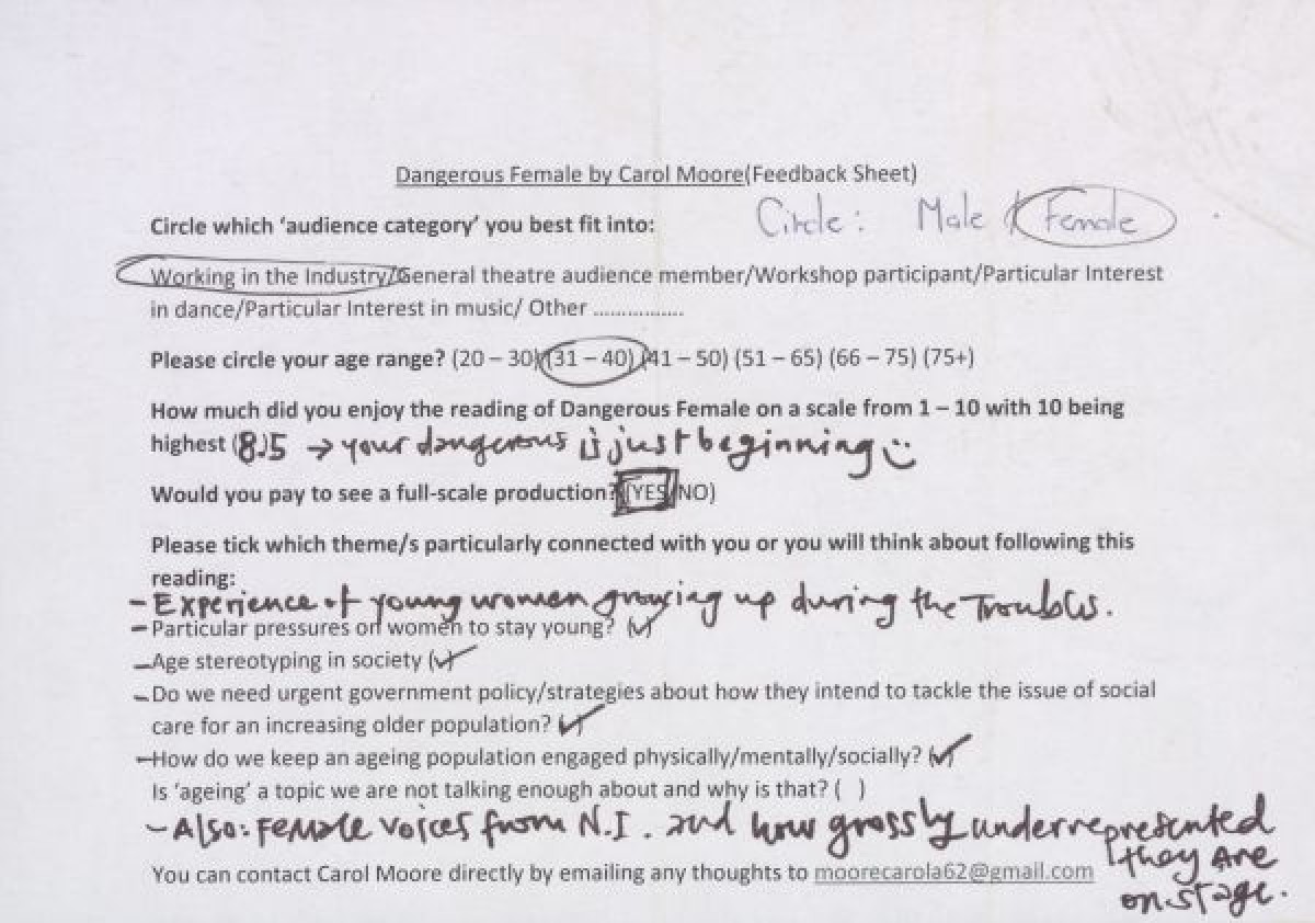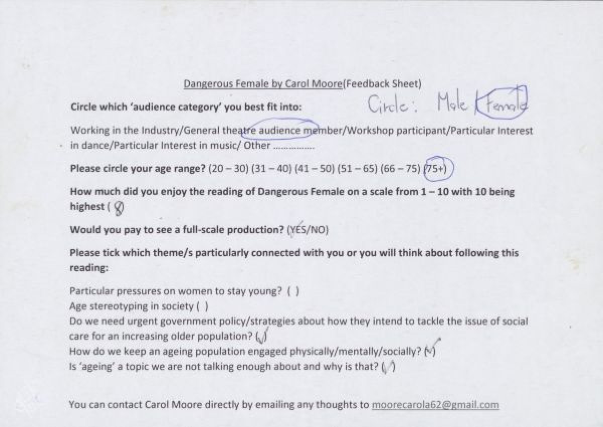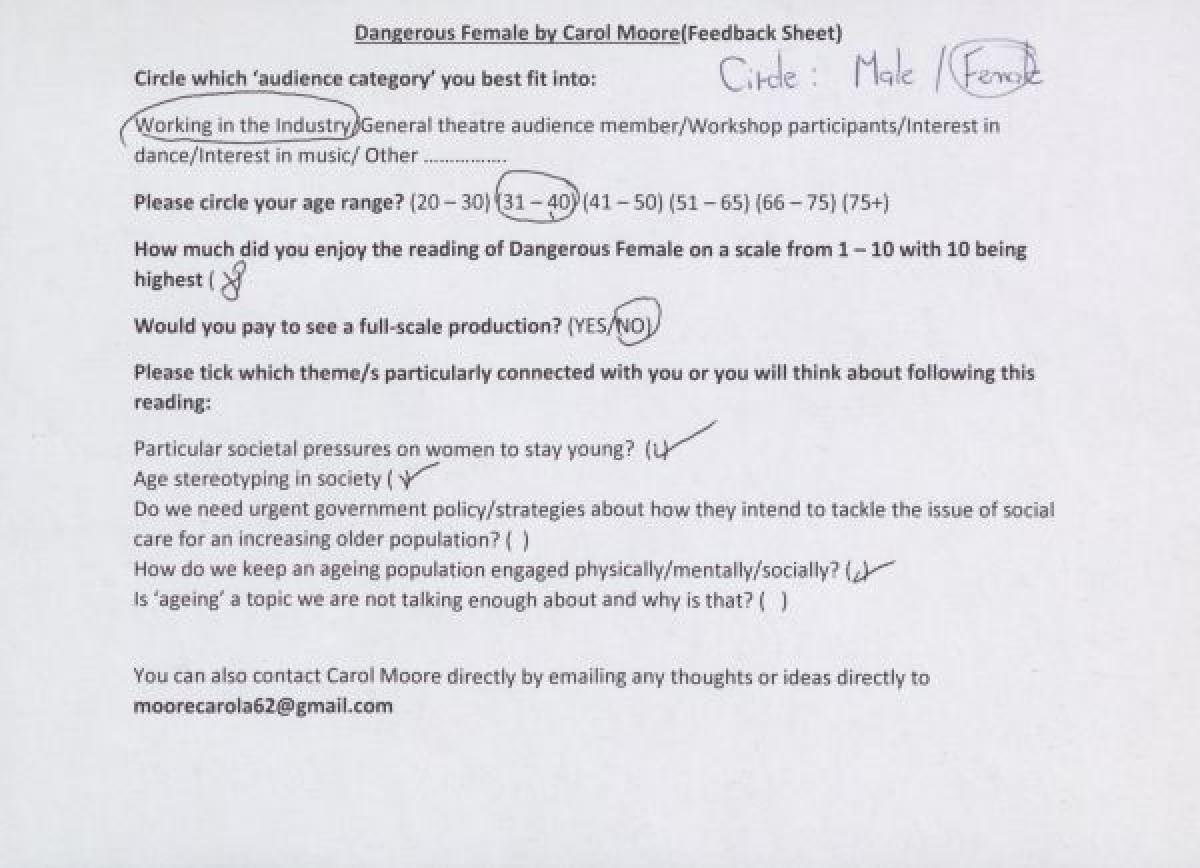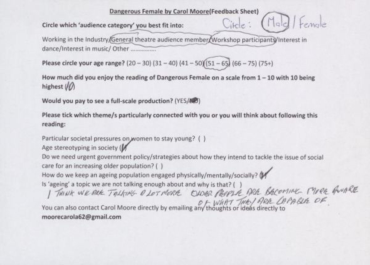 Audience feedback sheets with handwritten comments for the one-woman play, "Dangerous Female," about age and ageing, written and performed by Carol Moore.
