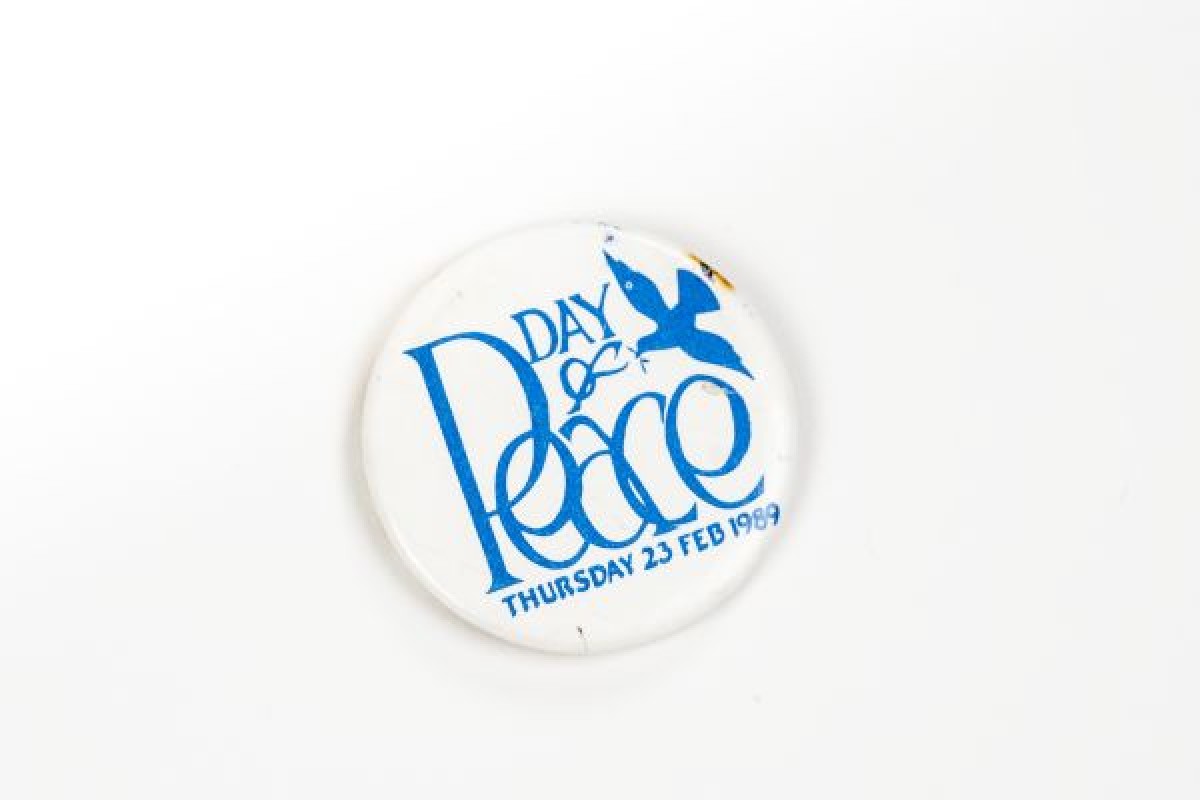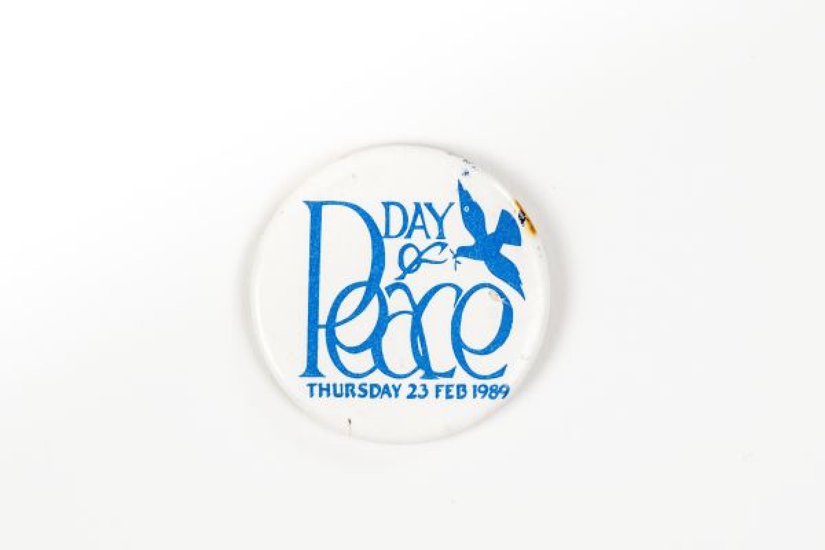 White and blue badge depicting a logo of a peace dove carrying an olive branch, with "Day of Peace, Thursday 23 Feb 1989" written on it. Event organised by Women Together.