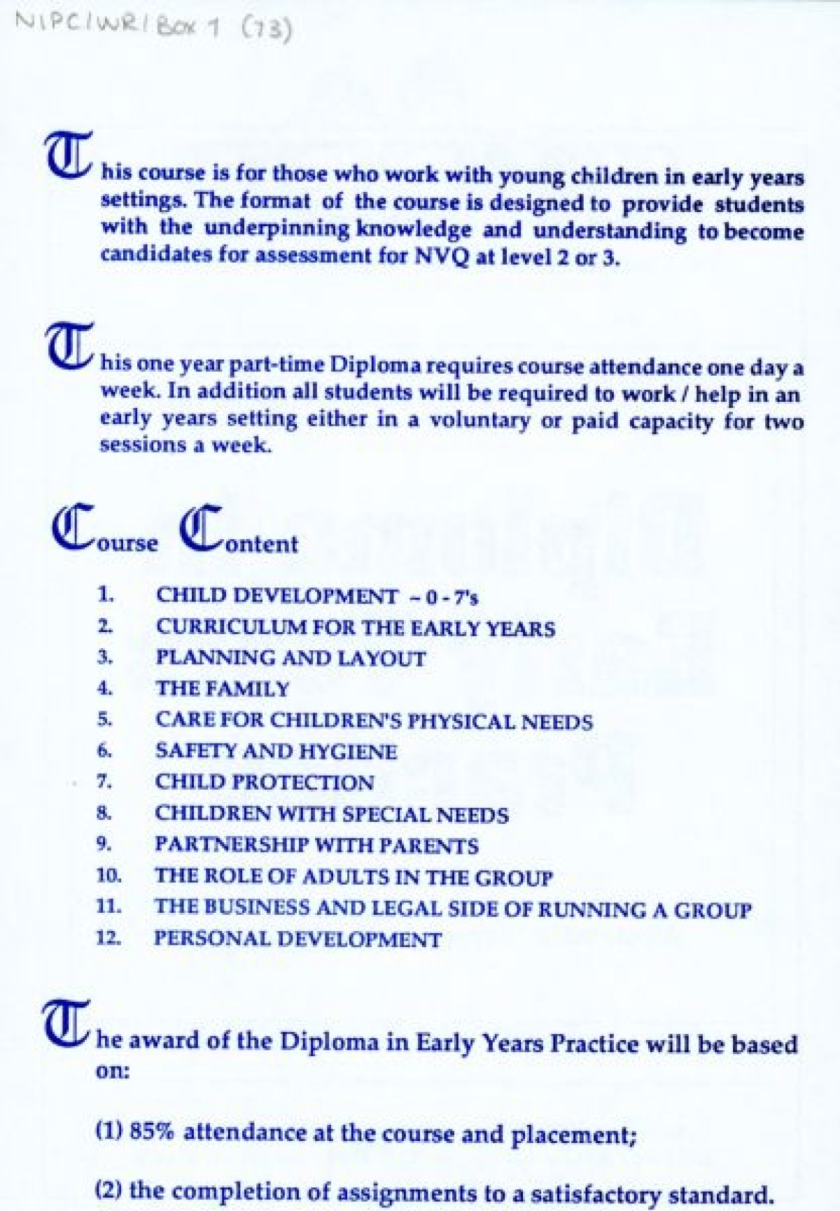 Leaflet for course, 'Diploma in Early Years practice' organised by the Northern Ireland Pre-School Playgroup Association.